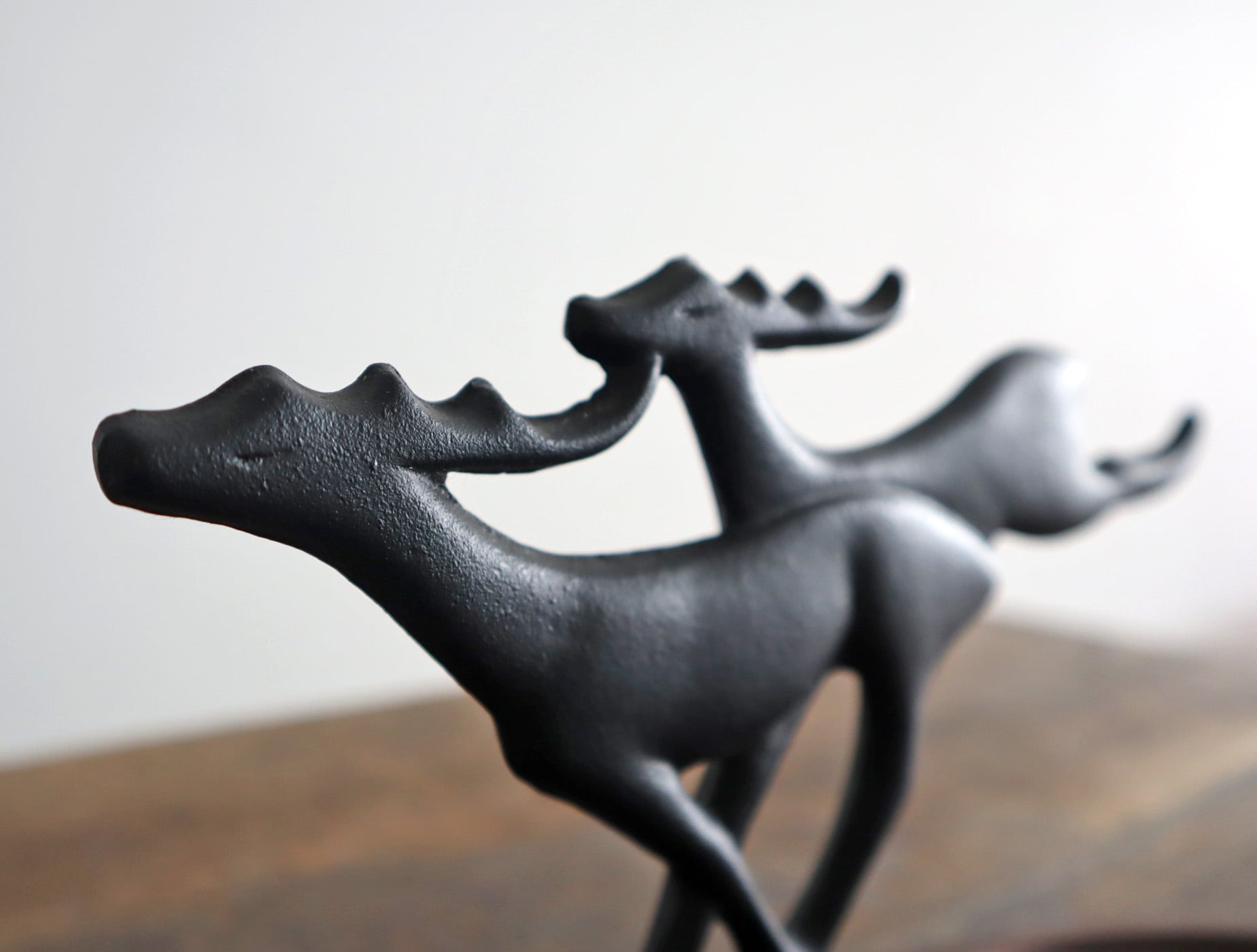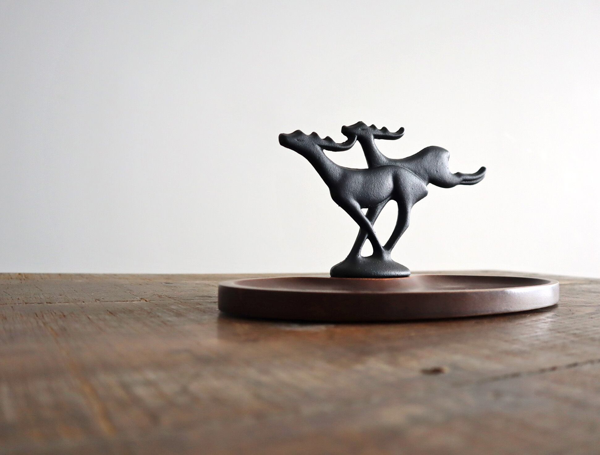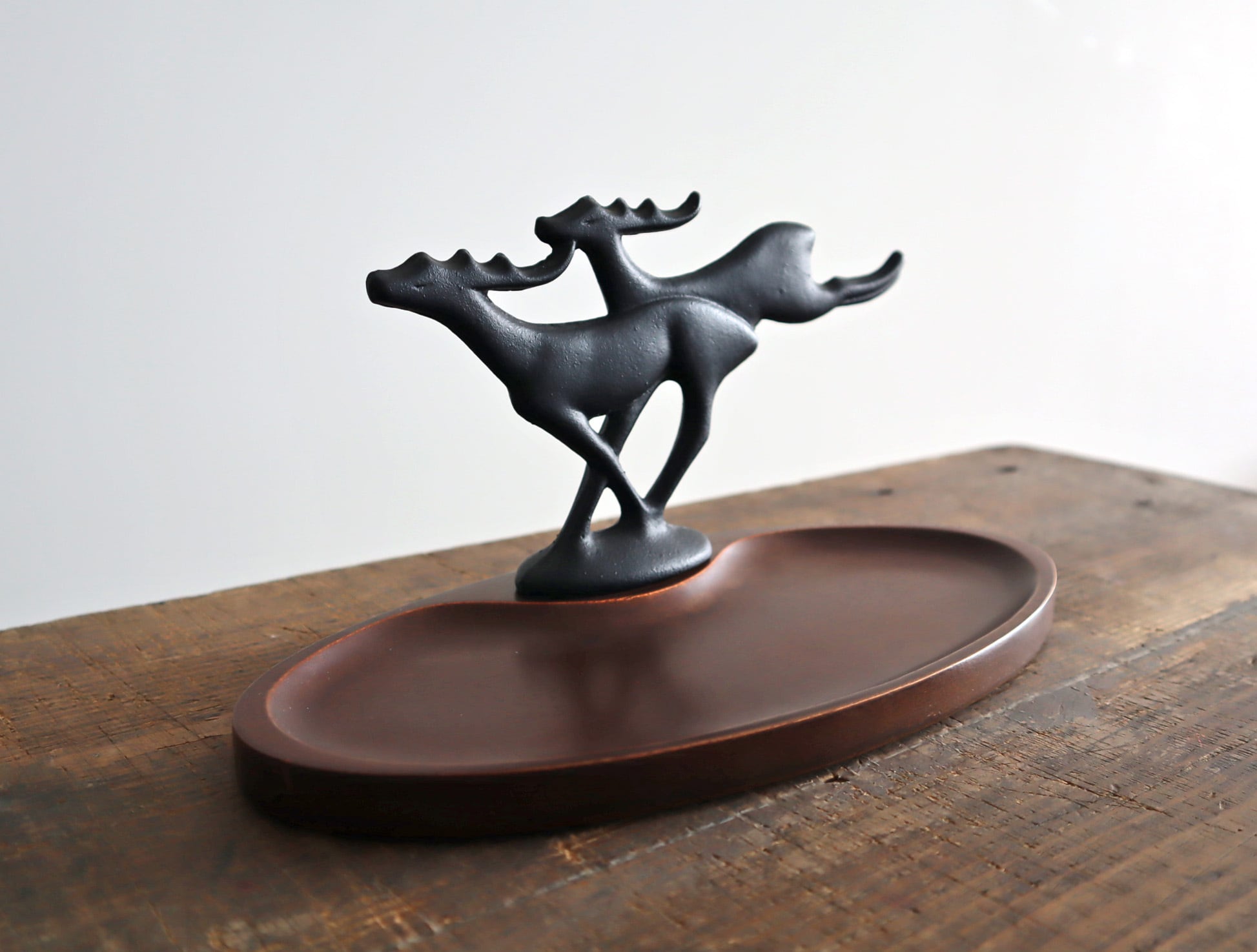 鉄とウッドのコンビネーションがモダンな存在感を放つ1970~80年頃のプロダクト、オーバル型のトレイと重なり合った鹿のシルエットが美しく、洗練された佇まいのヴィンテージ品。