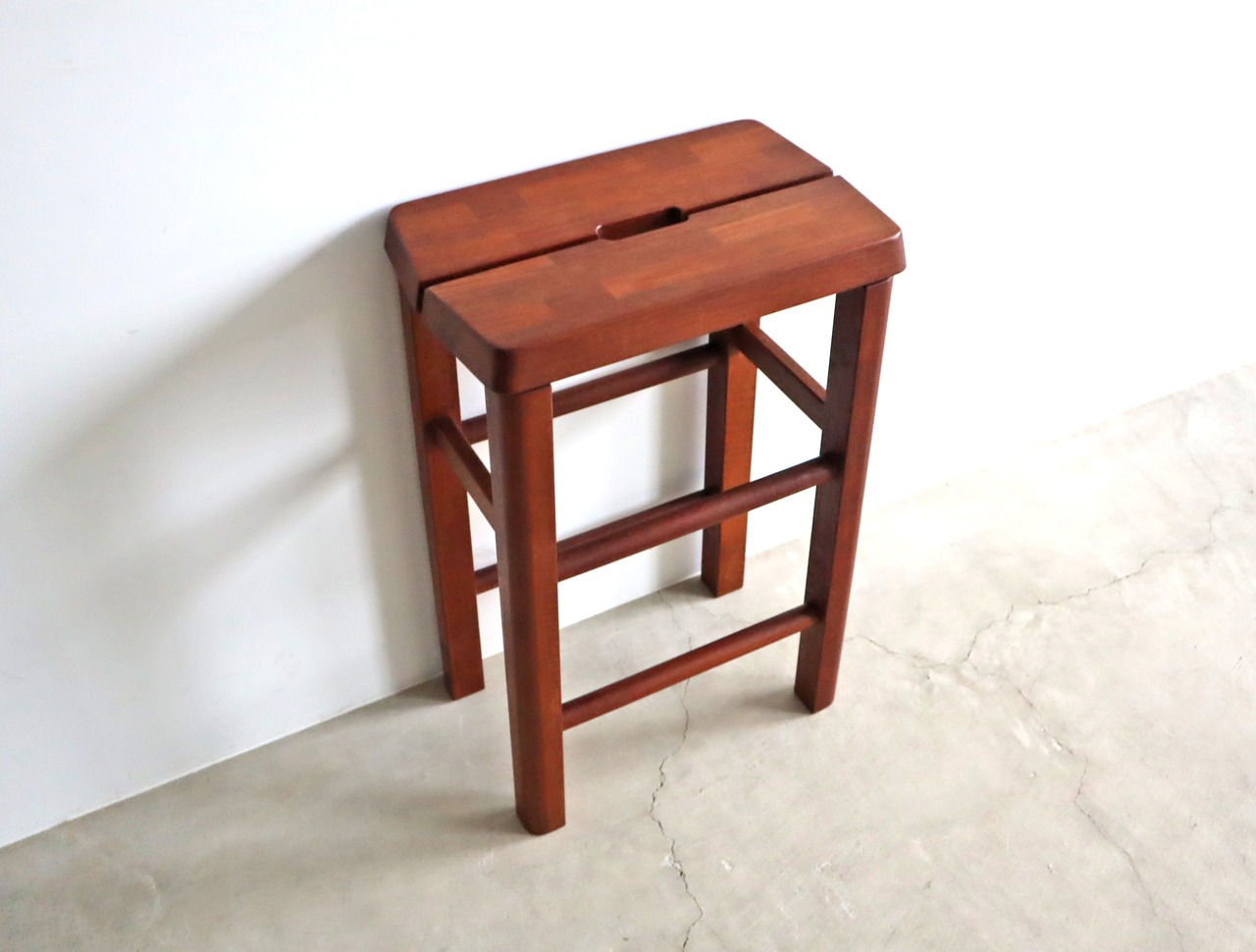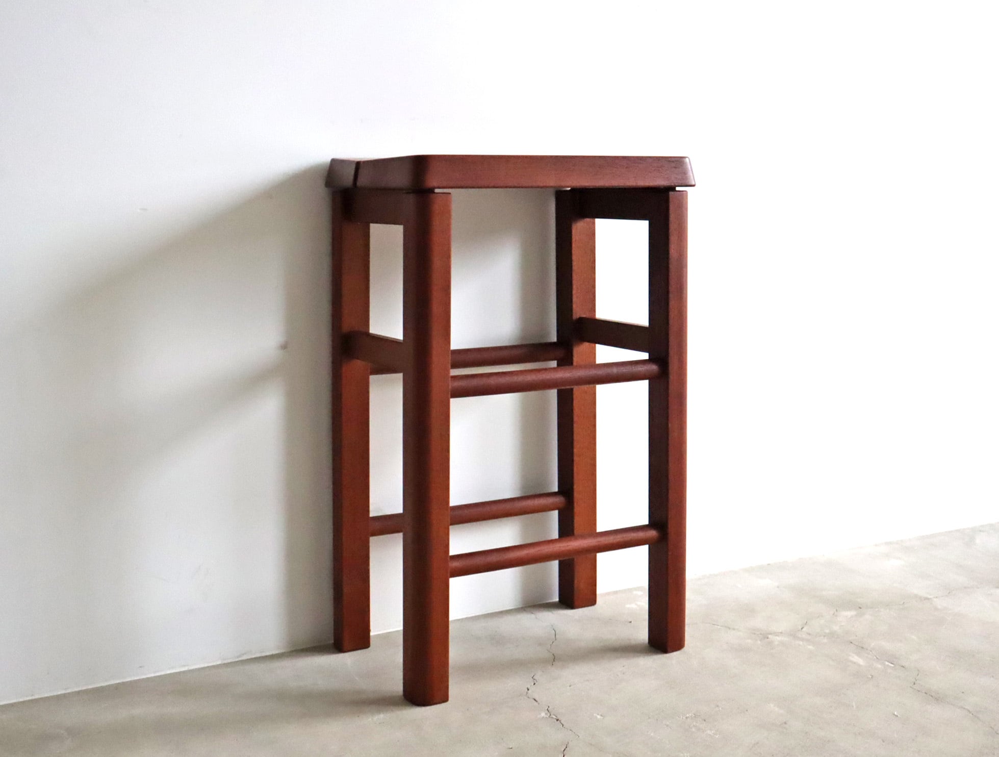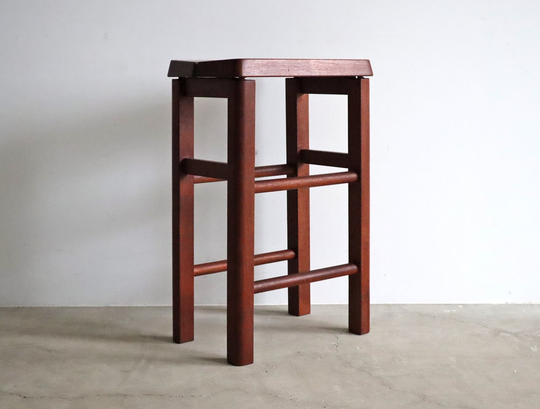 チーク材の集成材を座面に、脚部には無垢材を用いて仕立てられた木製スツールです。