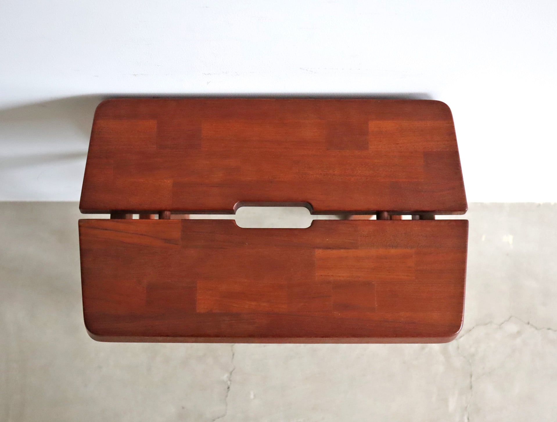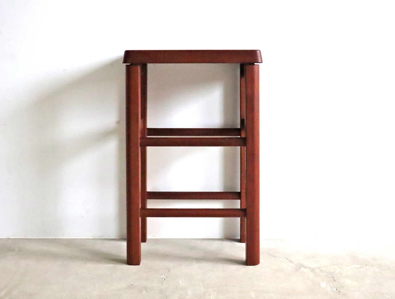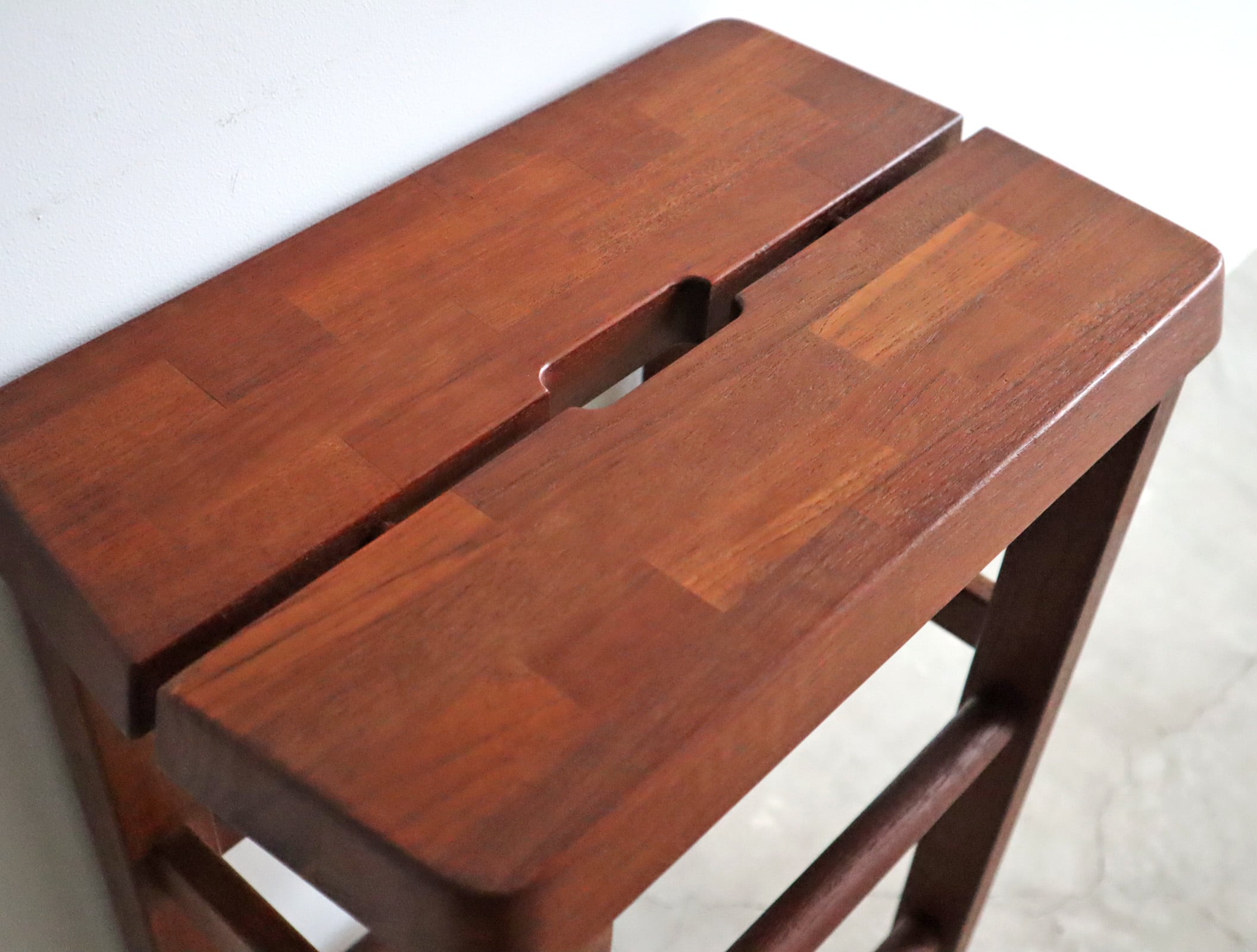 チーク材の集成材を座面に、脚部には無垢材を用いて仕立てられた木製スツールです。
