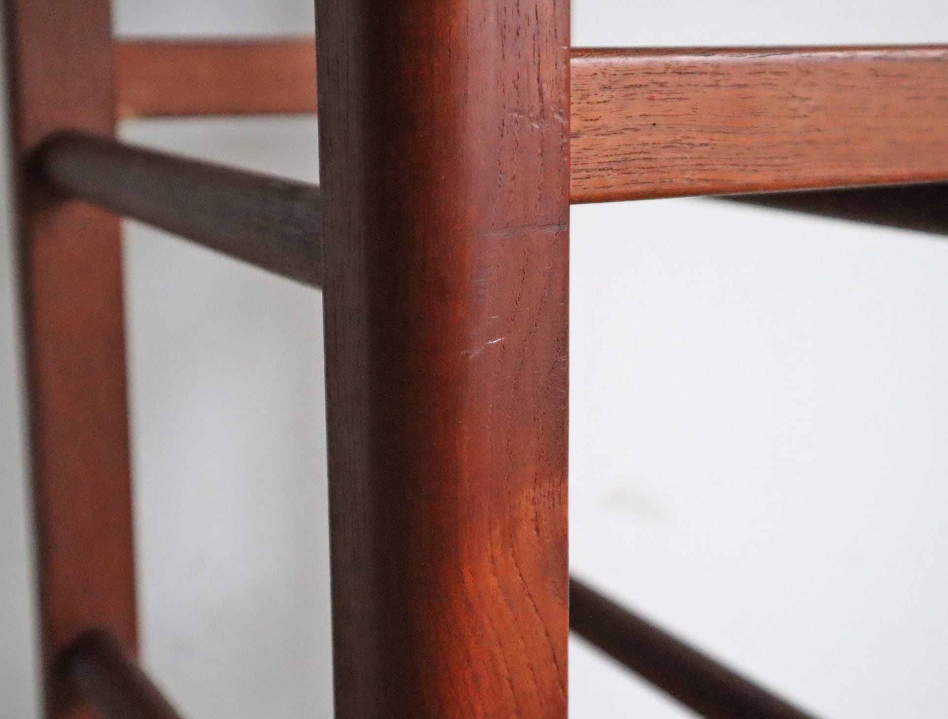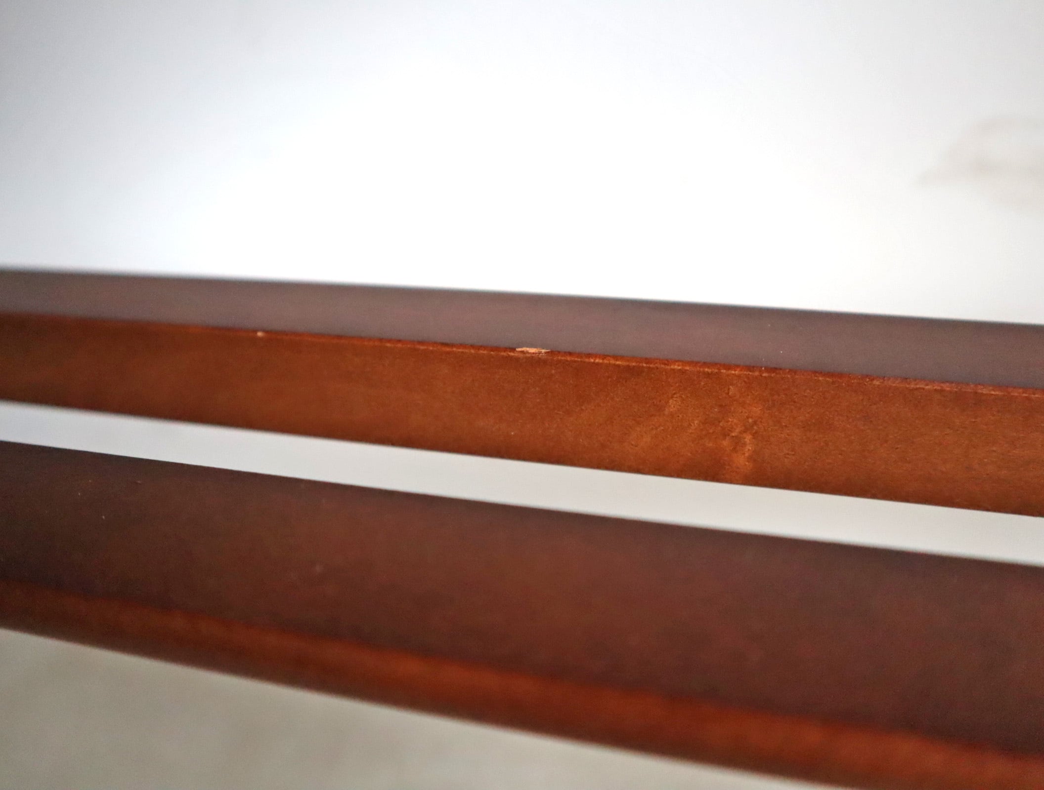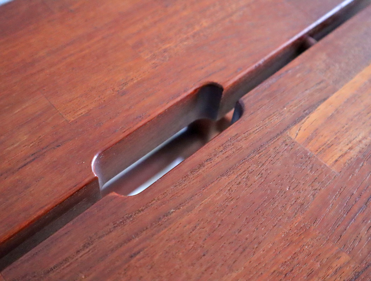 落ち着いた赤褐色のチーク材は、木目の表情に豊かさがあり、集成材ならではの安定感と無垢脚の力強さがバランスよく組み合わされています。