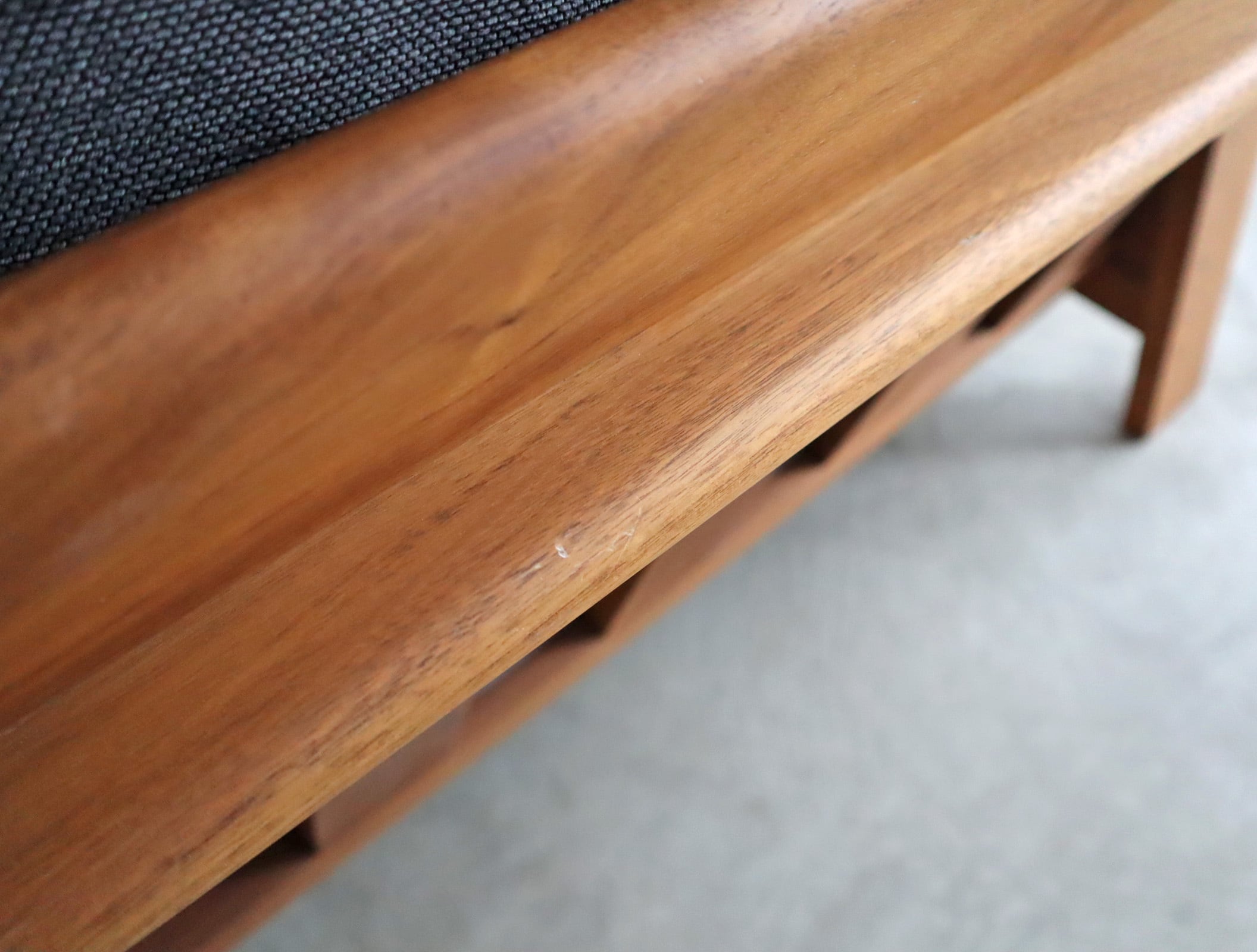 ウォールナット無垢材を用いた直線的で端正なフレームは、木工メーカーとして培われてきた確かな技術を感じさせ、構造そのものがデザインとして成立、低めに設計された座面は、あぐらをかいて座れるほどの奥行きと幅があり、リラックスしてご使用いただけます。