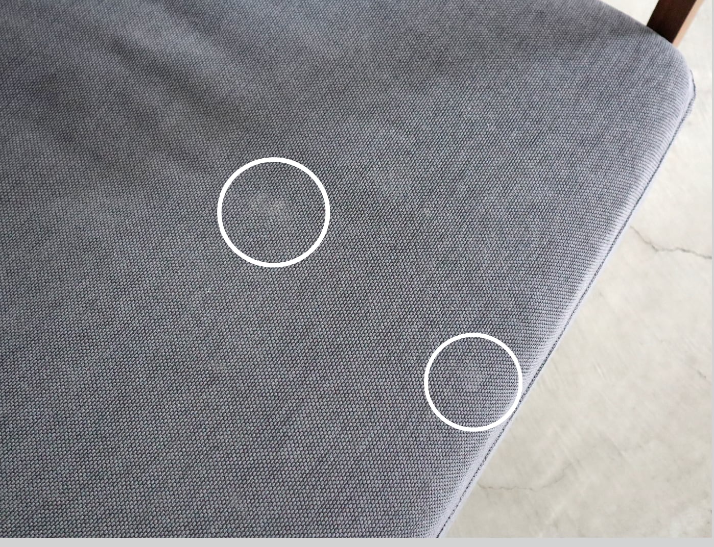 座面ファブリック、画像上マーキングをしてある箇所によく見るとわかる程度のシミがございます。