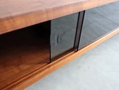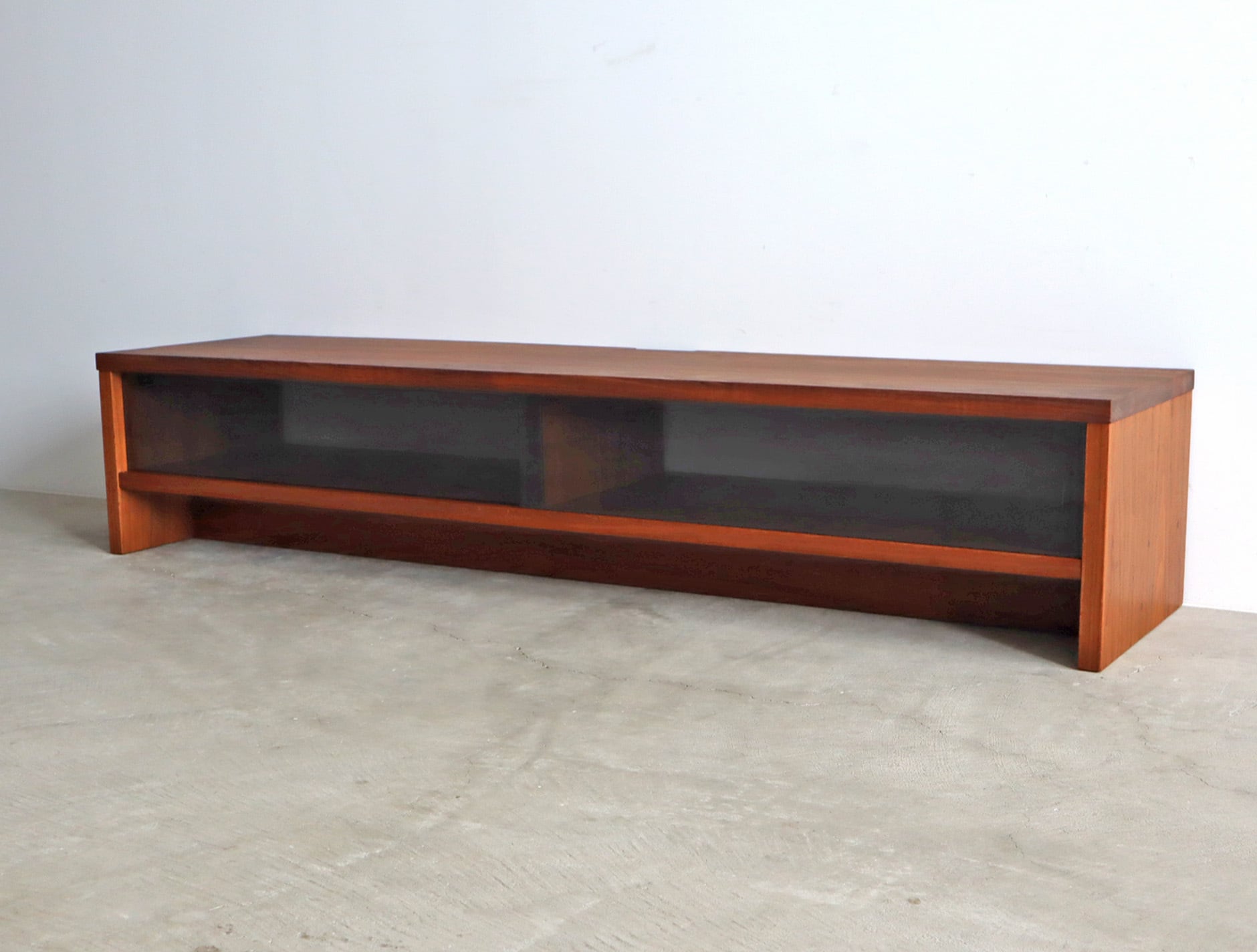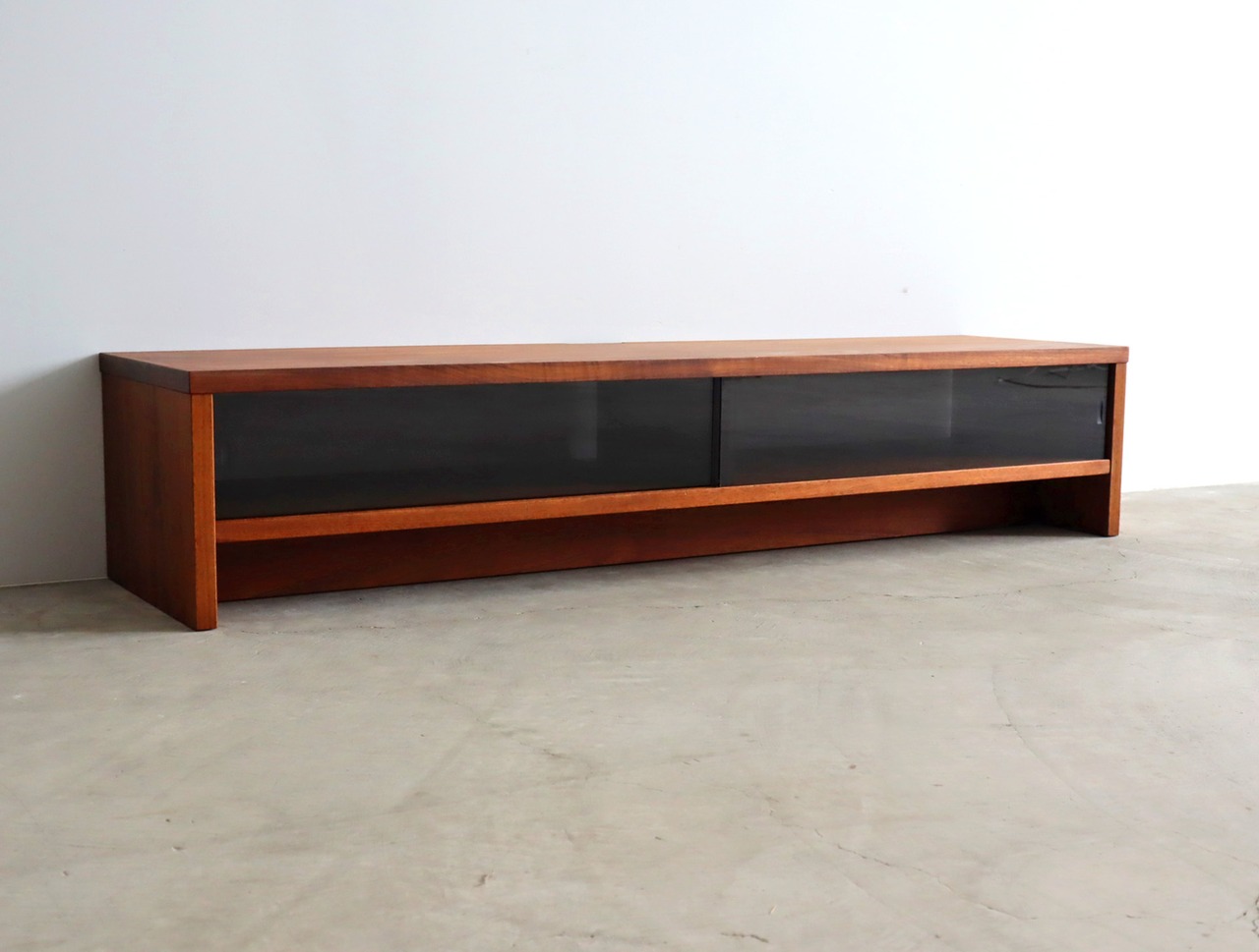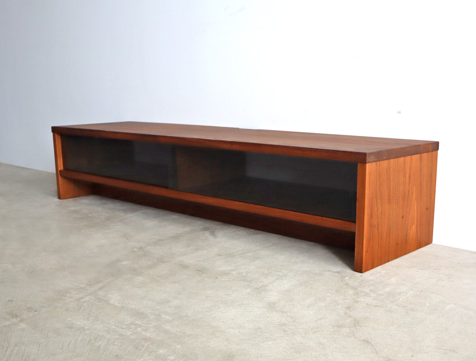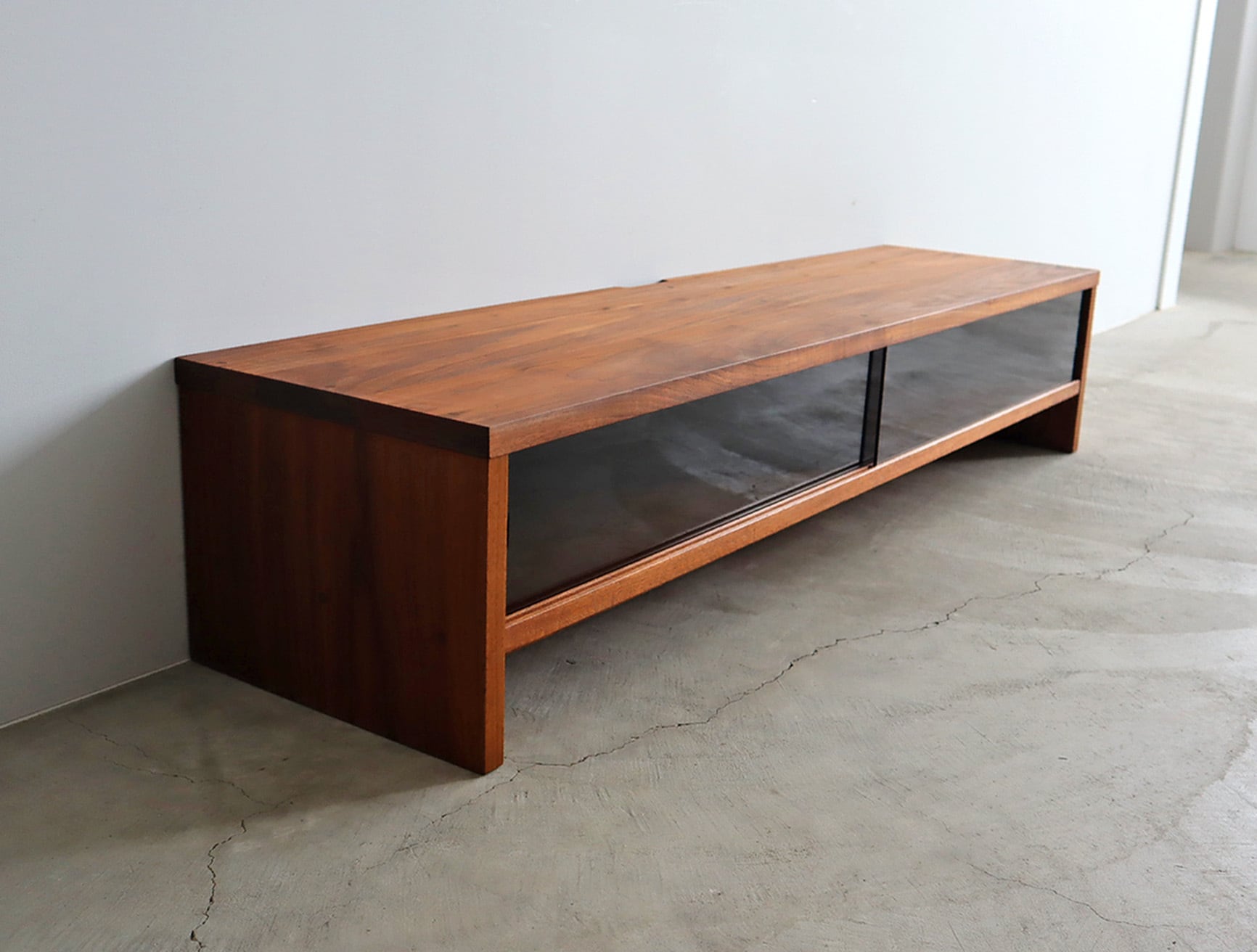 低く抑えられたプロポーションは視線を遮らず、リビングを広く見せながらテレビまわりをすっきりとまとめ、前面にはブラックカラーのガラスを用いた収納部を備え、AV機器を収めても圧迫感がなく、実用性と意匠性を両立。