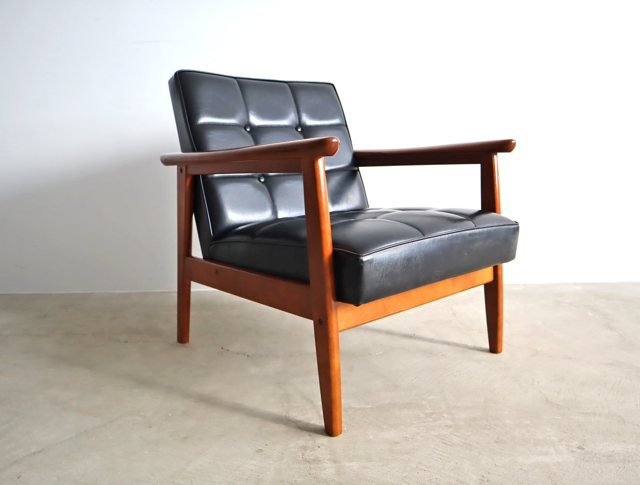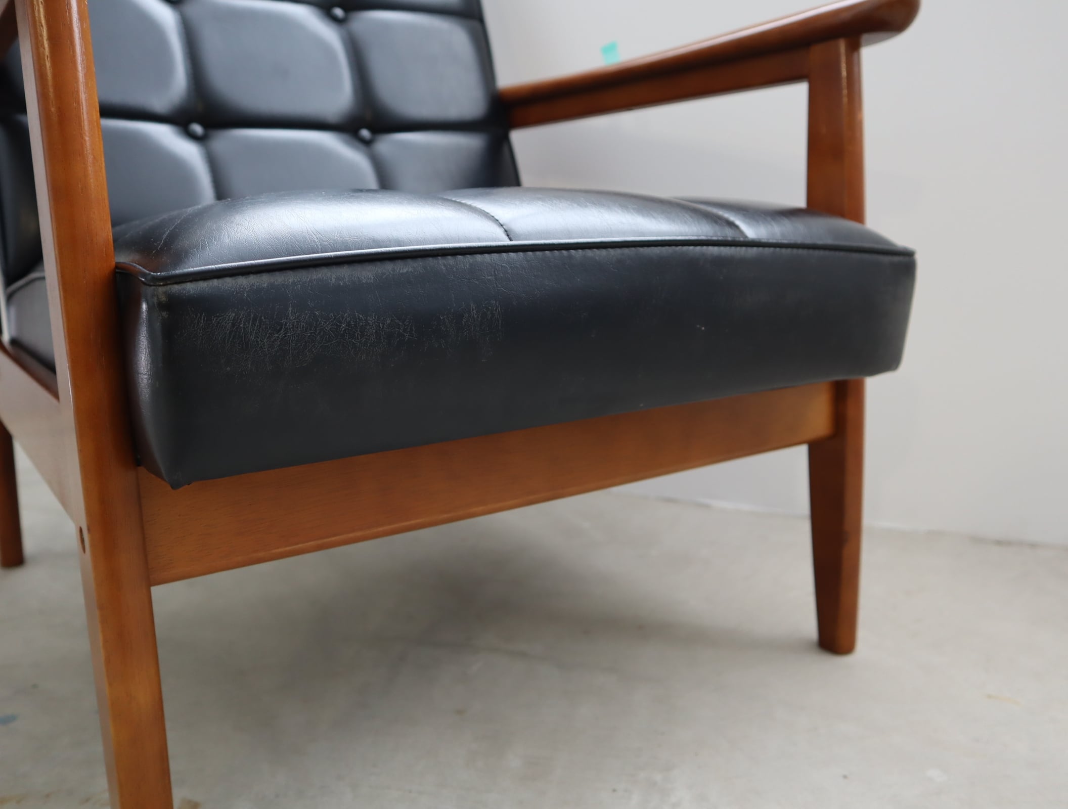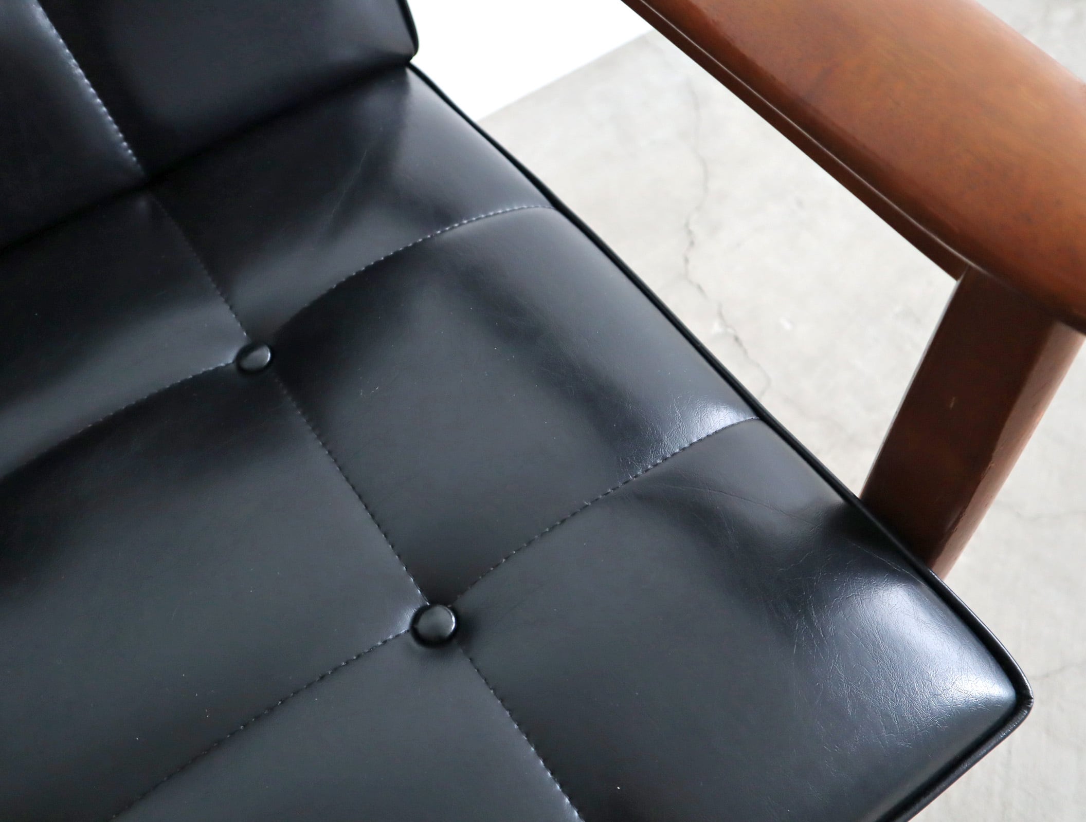 座面は当店でウレタンを交換したのちオリジナルの合成皮革を張り直してあり、座面裏のシーチングをブラックに変更済み。