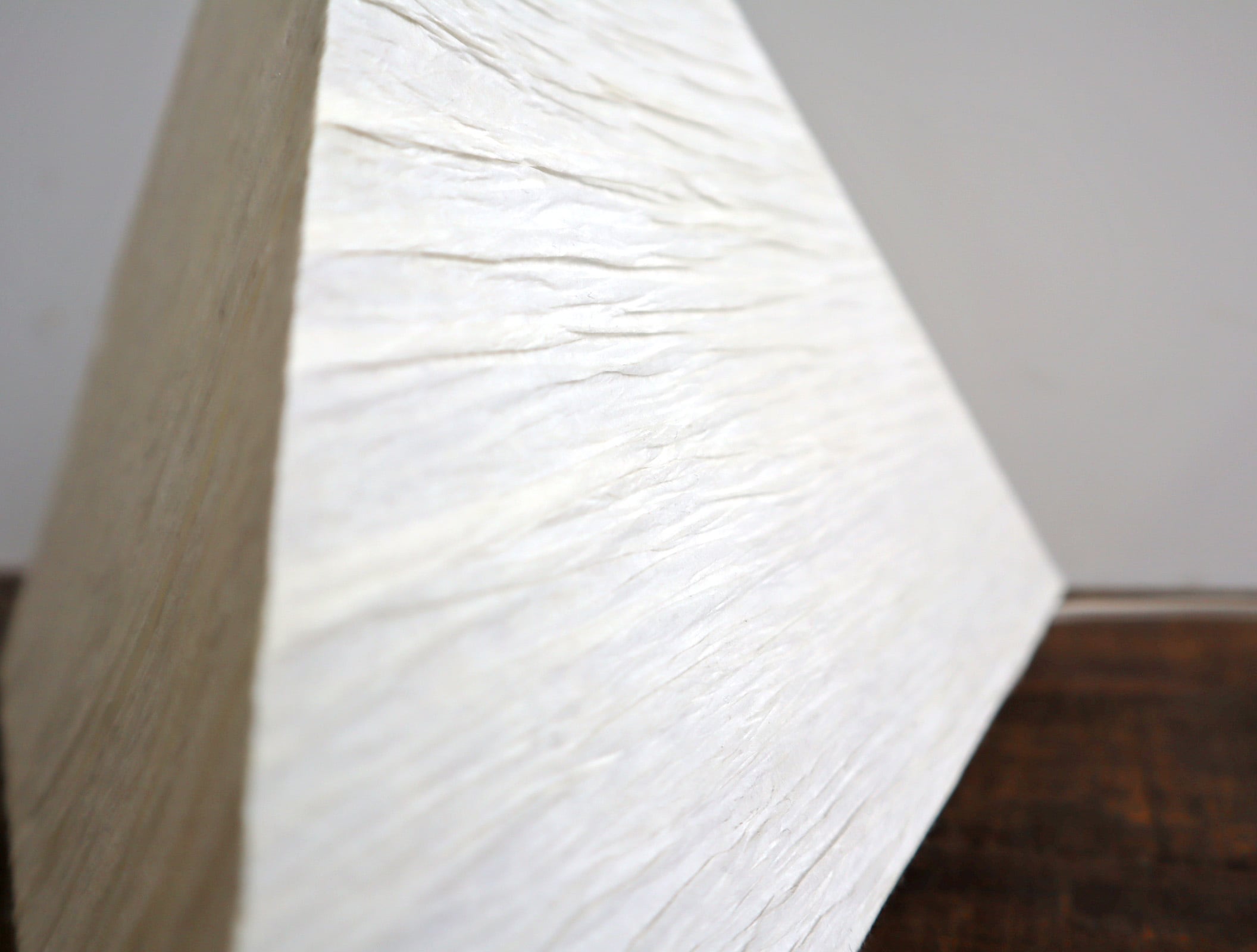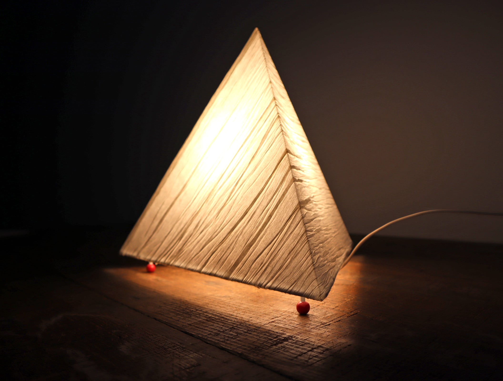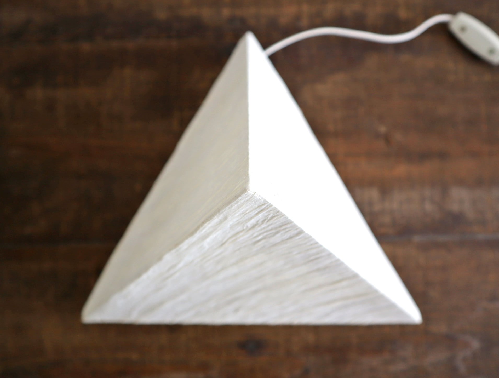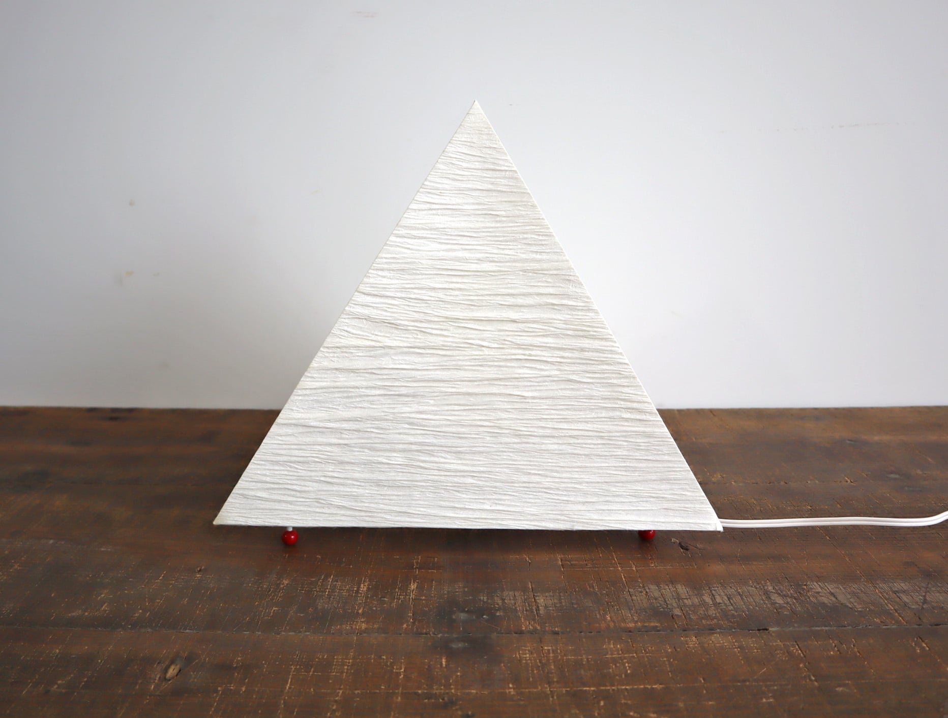 三角錐のミニマルなフォルムに、手仕事を感じさせる表情豊かな和紙シェードが組み合わさり、照明でありながらオブジェとしての魅力も併せ持つ一灯です。