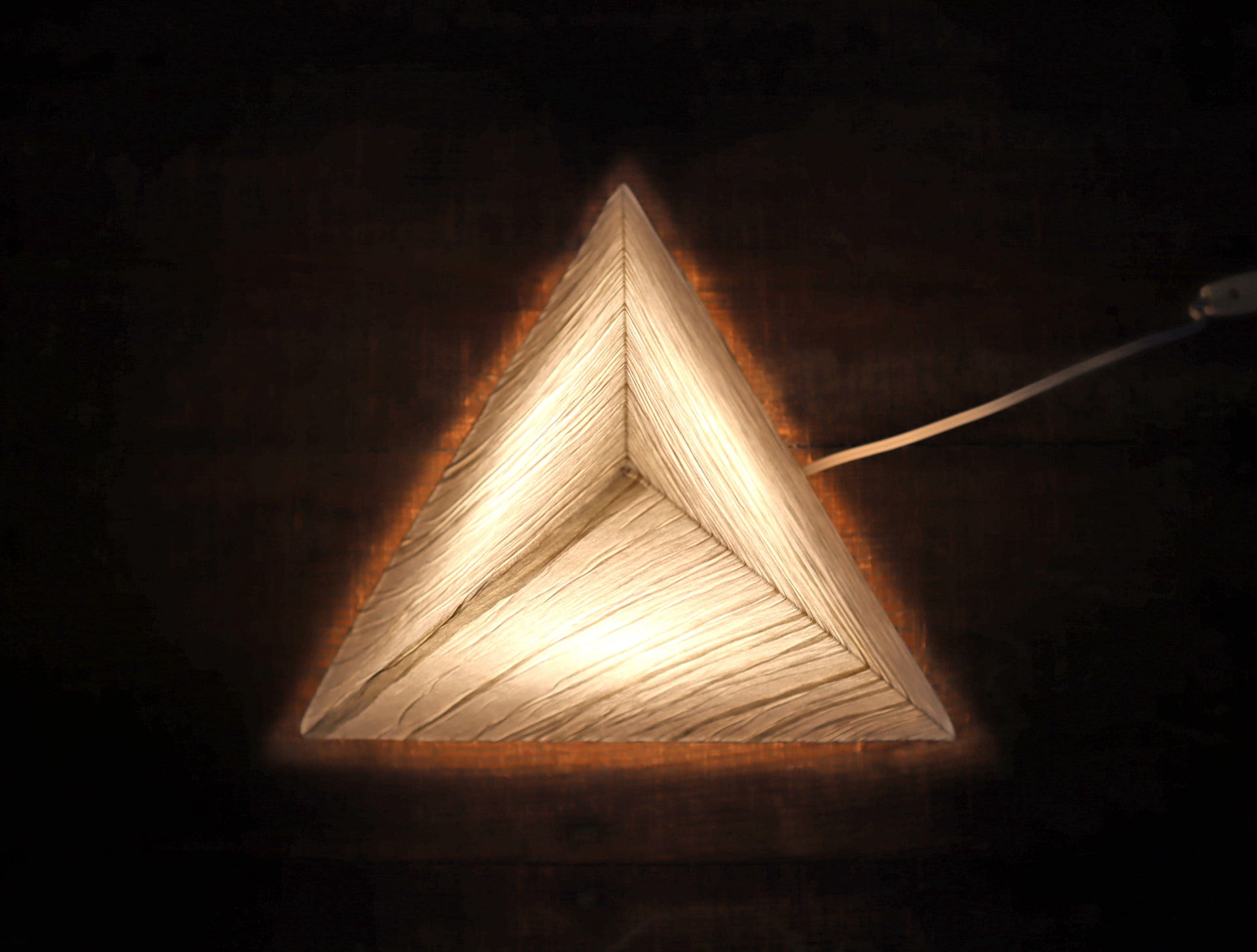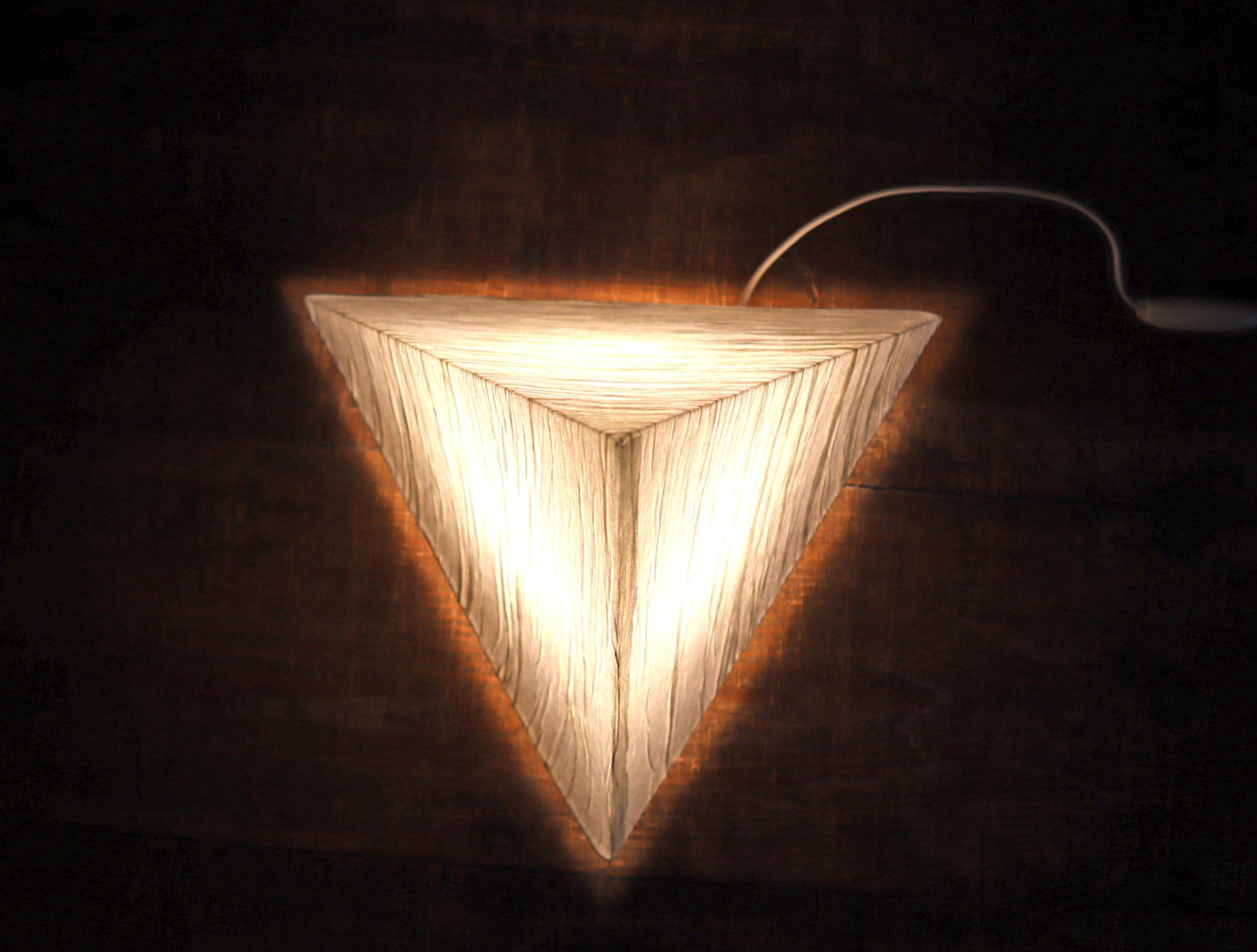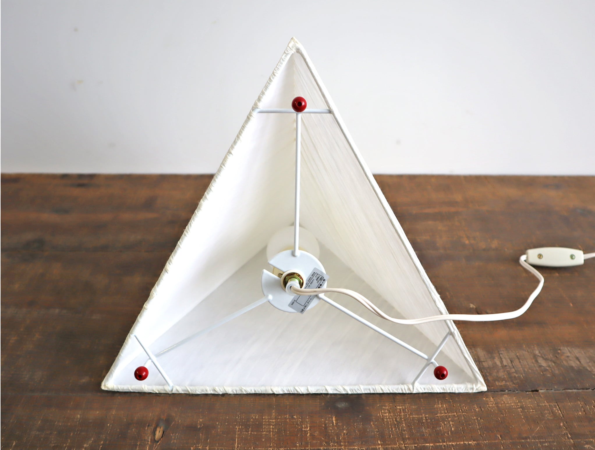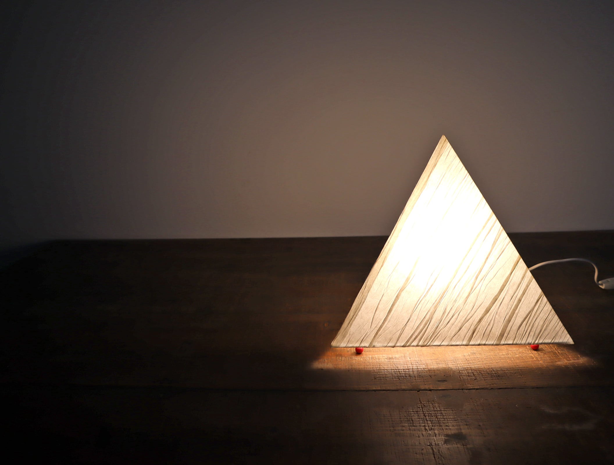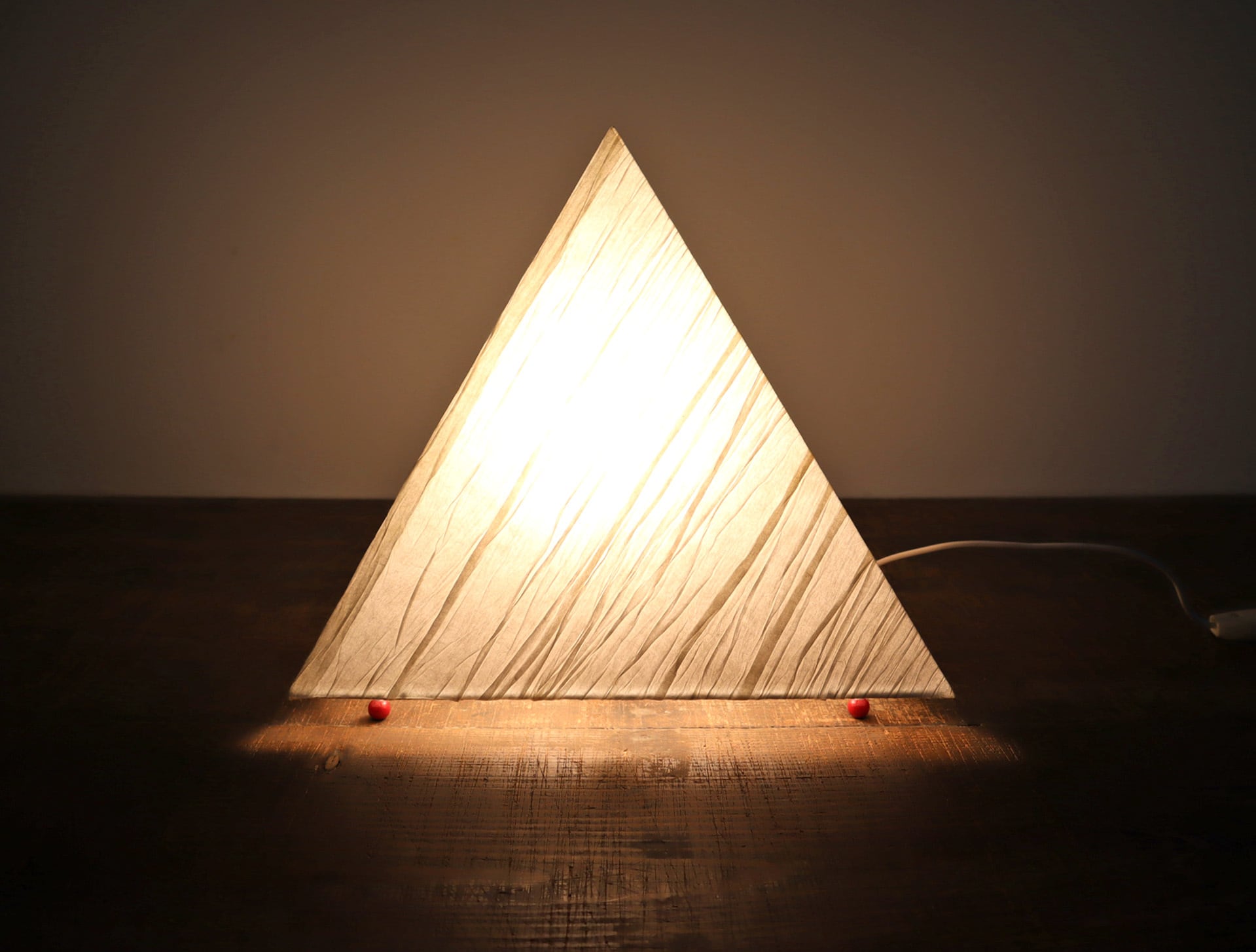三角錐のミニマルなフォルムに、手仕事を感じさせる表情豊かな和紙シェードが組み合わさり、照明でありながらオブジェとしての魅力も併せ持つ一灯です。