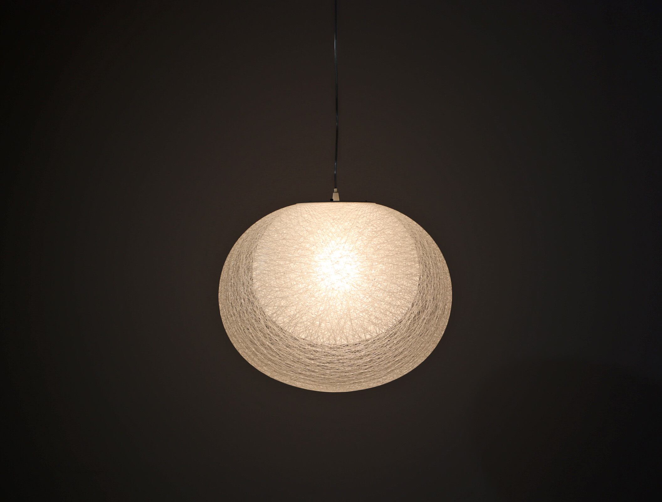 FRPの極細繊維を一つひとつ巻き重ねることで形成されたシェードは、見る角度によって表情を変え、点灯すると内側からにじむような柔らかな光が広がります。