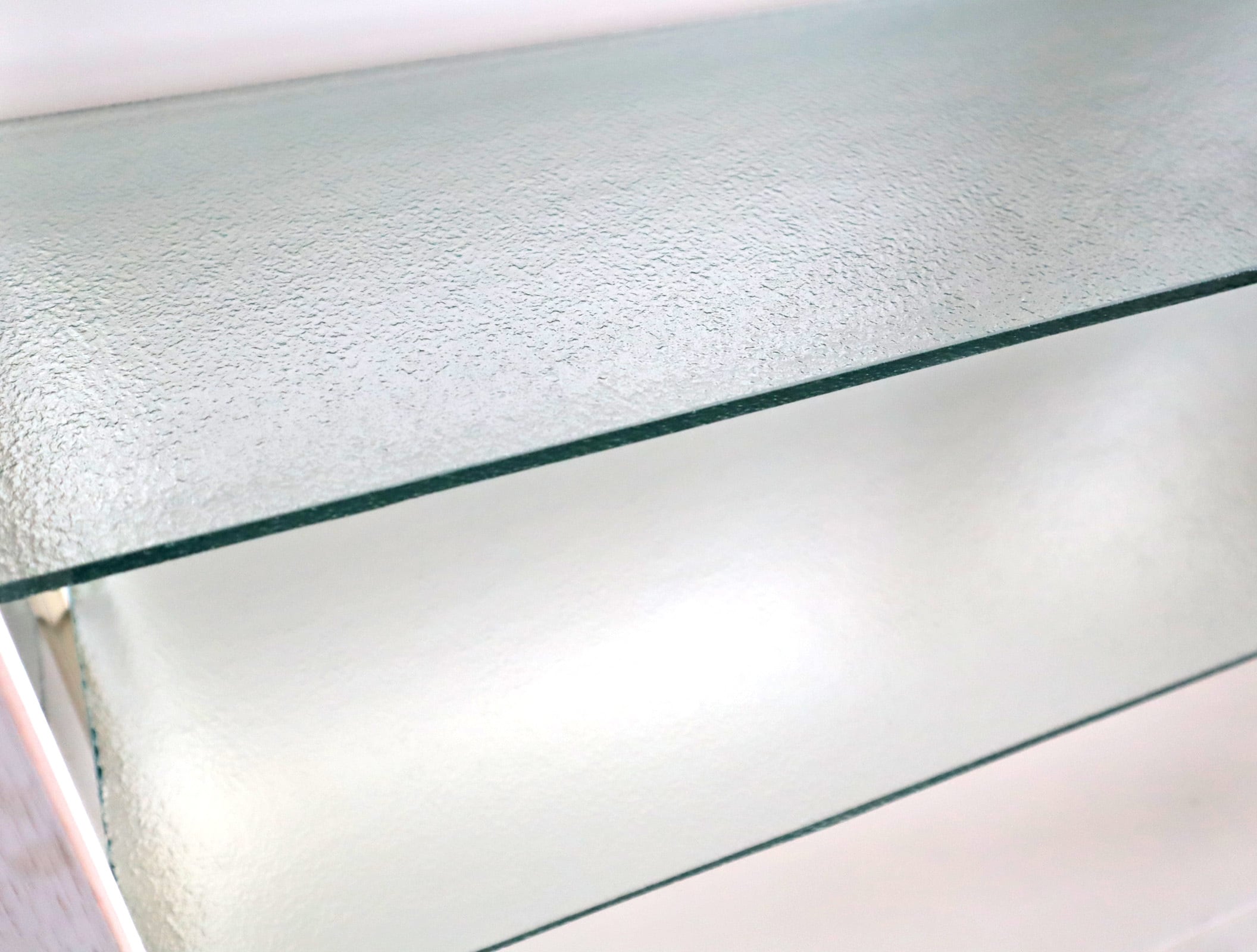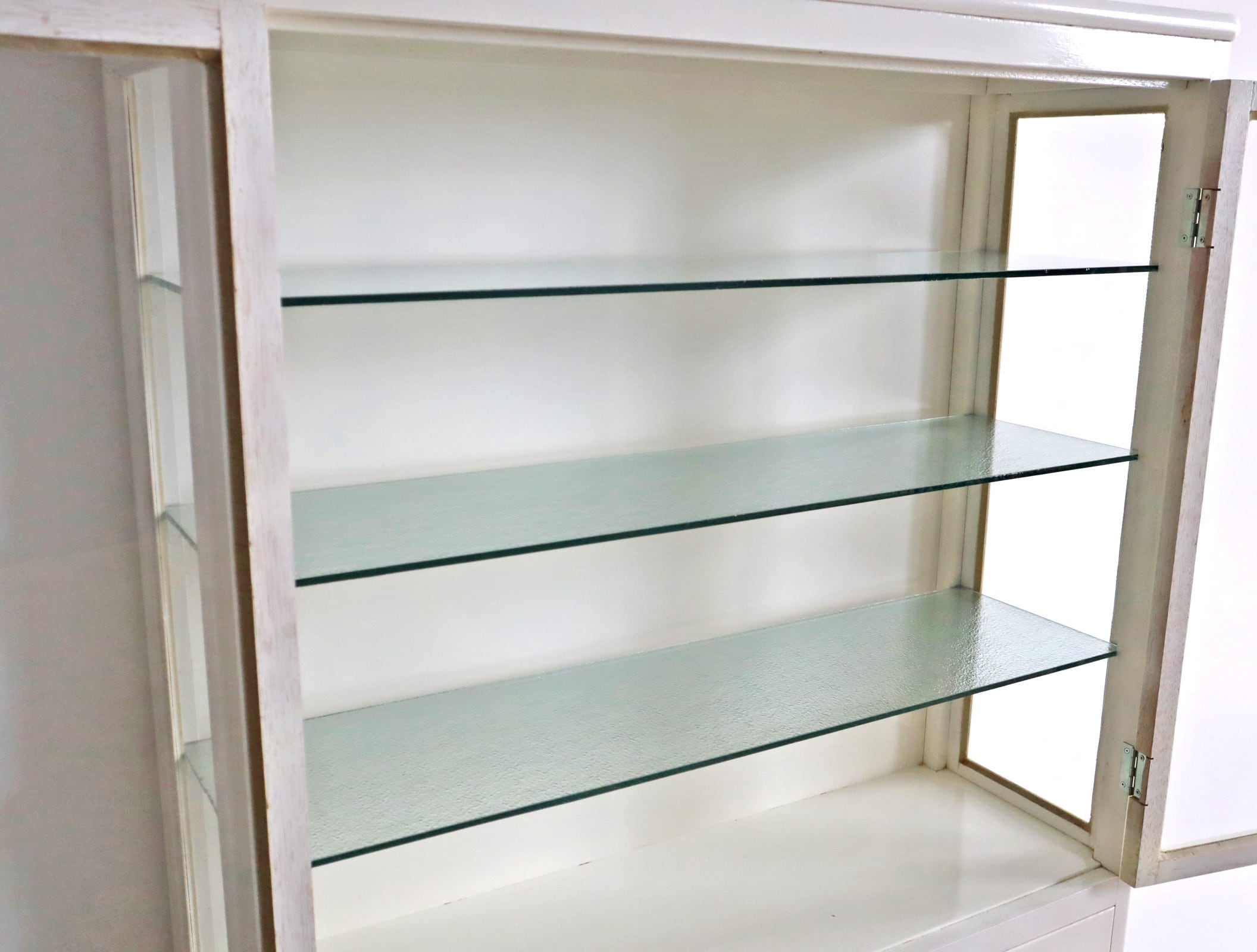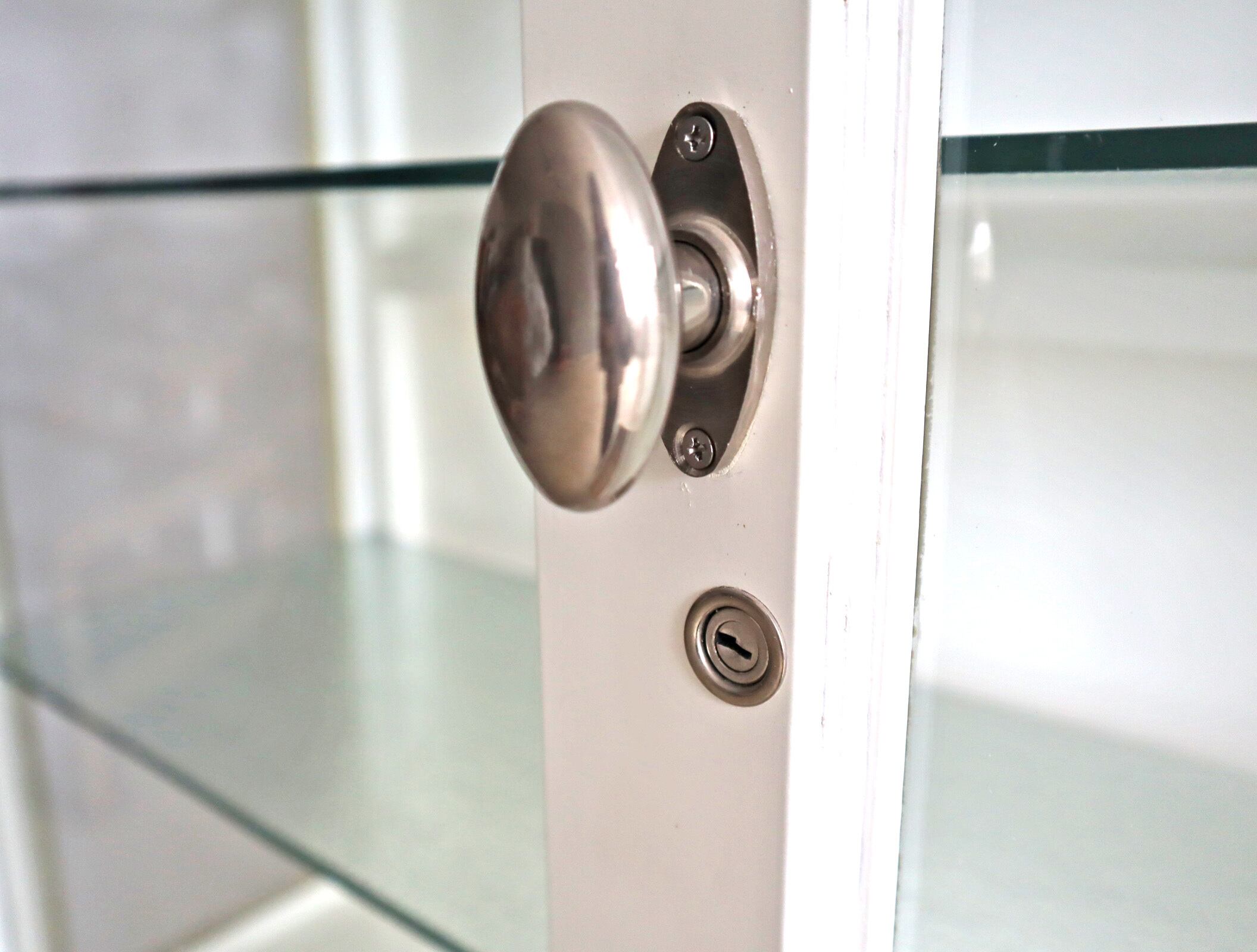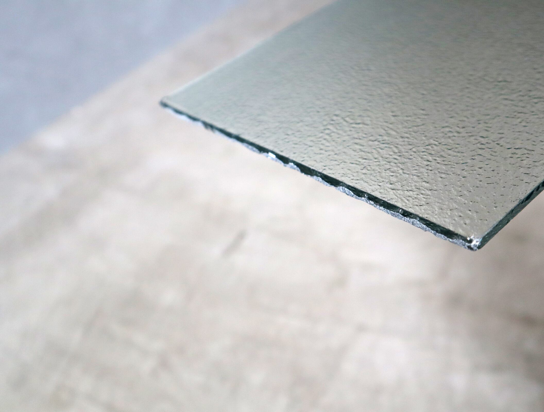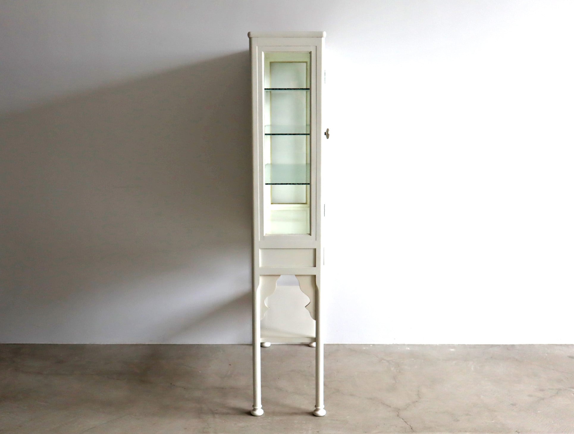 扉、側面のガラスはフラットですが、中の棚板は切りっぱなしの古いガラスで、器やグラス、薬瓶のような小さなオブジェ、アクセサリーや香水まで、光を透かしながら浮かび上がるようにディスプレイできます。