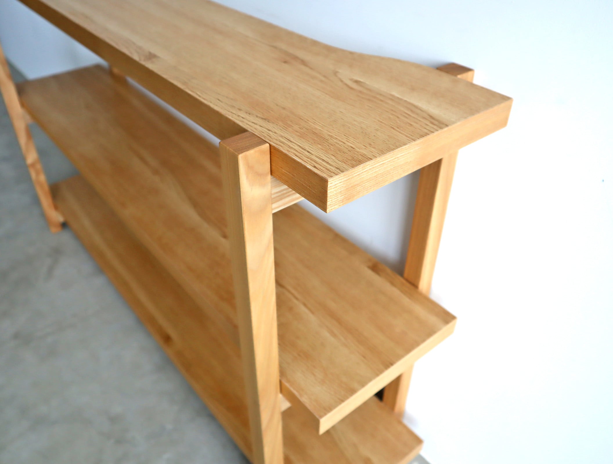 アッシュ無垢材フレームにオークプリント合板の棚板がシンプルな佇まいのオープンシェルフ。