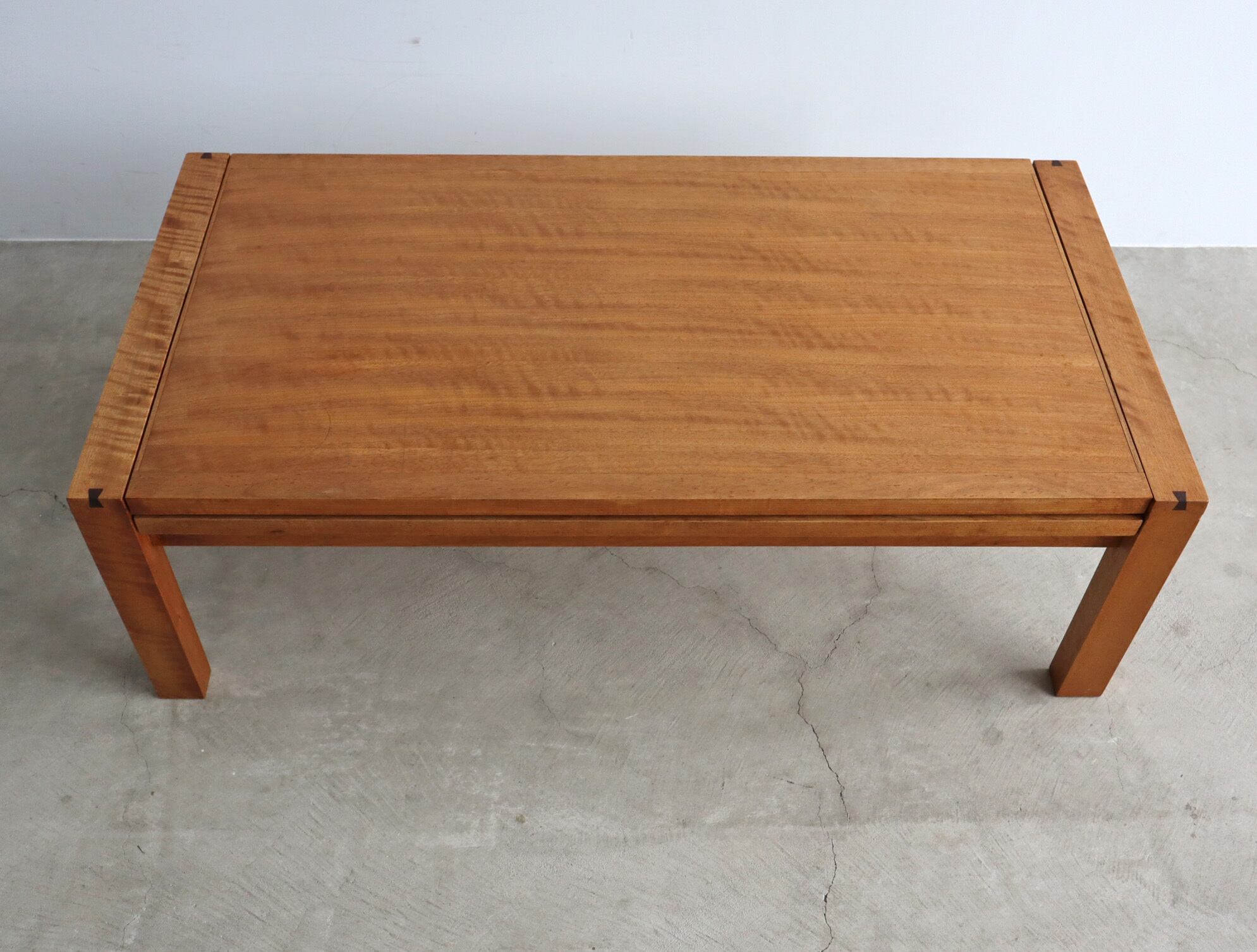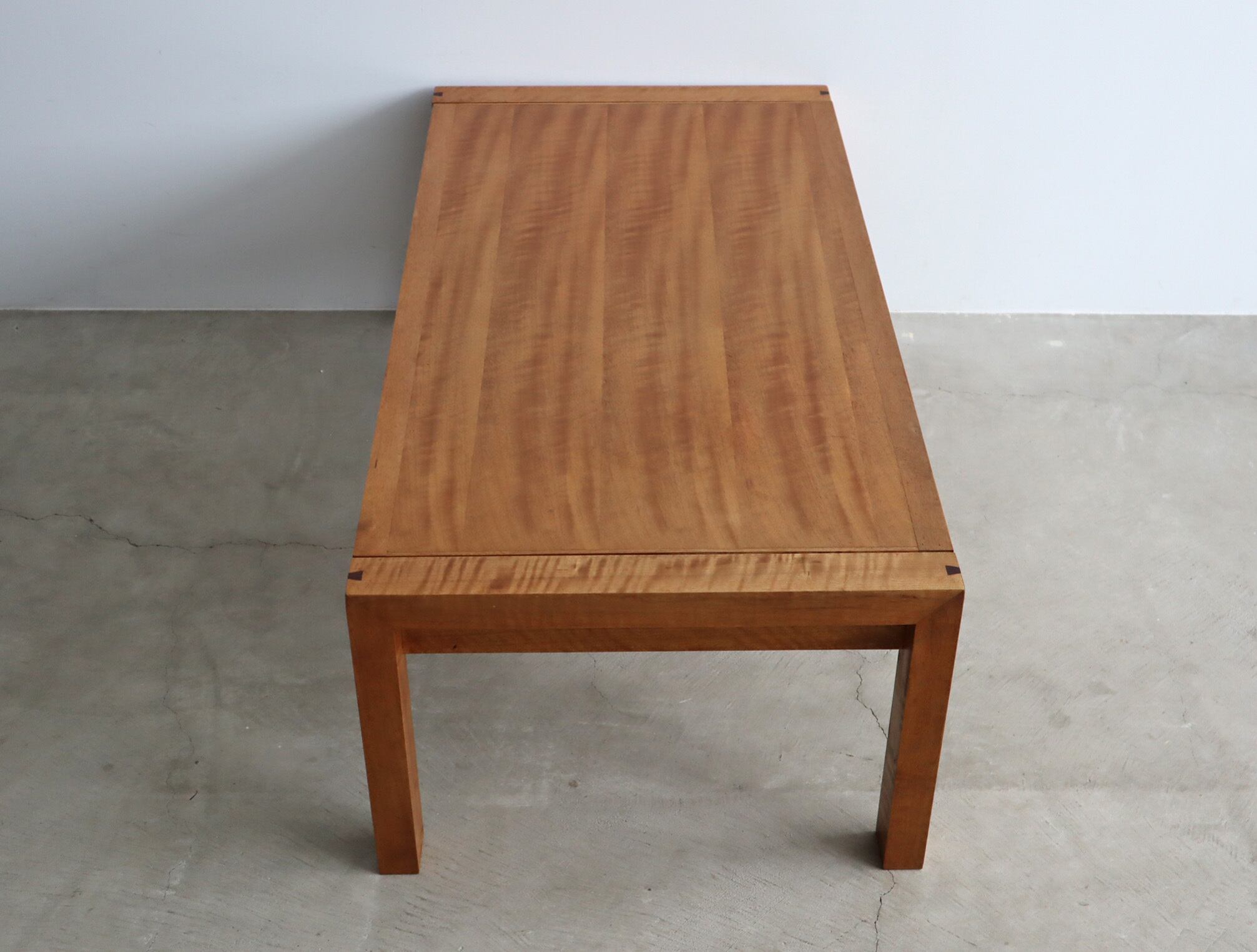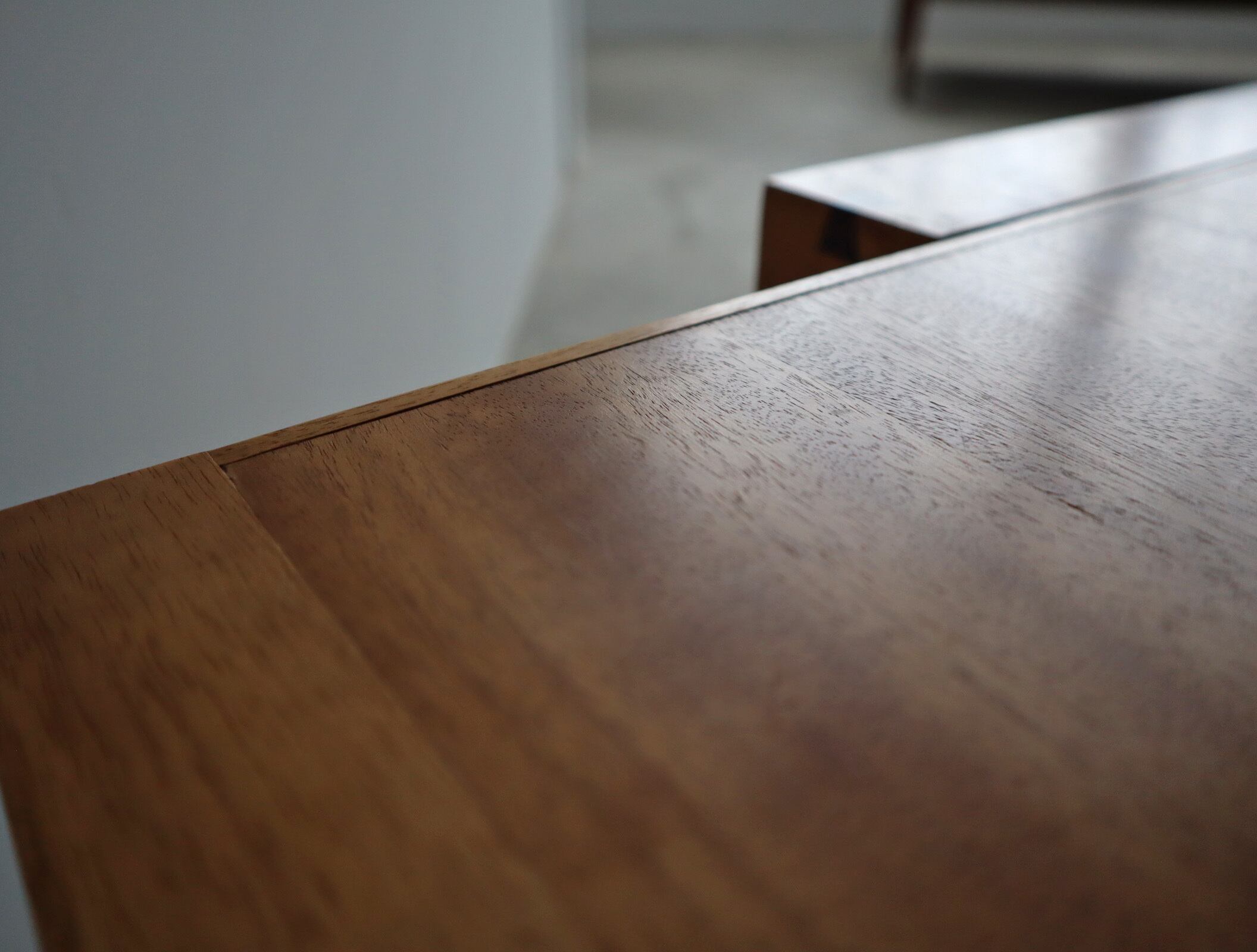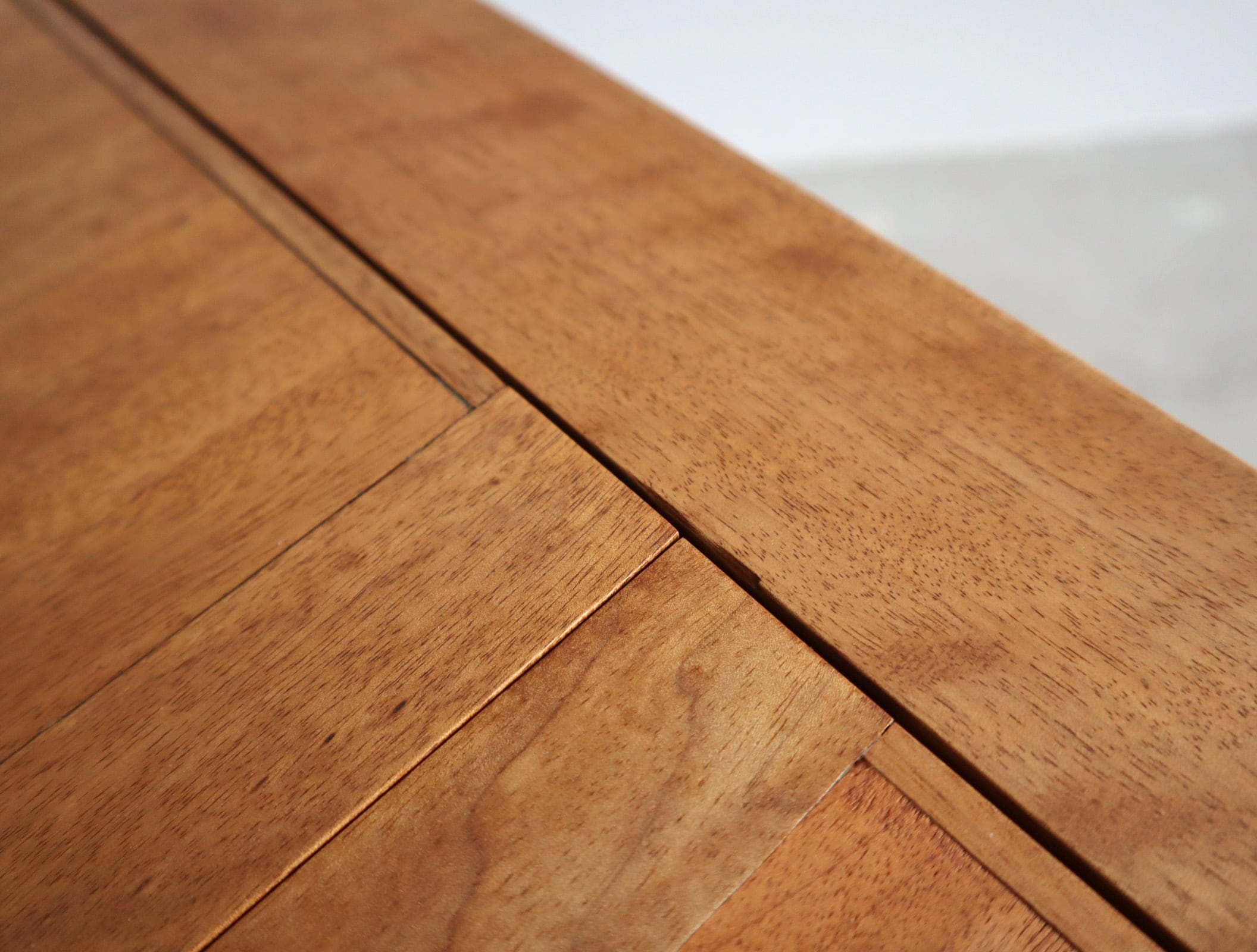 木目の流れが美しいニヤトー材突板仕上げの天板は、エッジを過度に丸ない直線的な仕上げ。