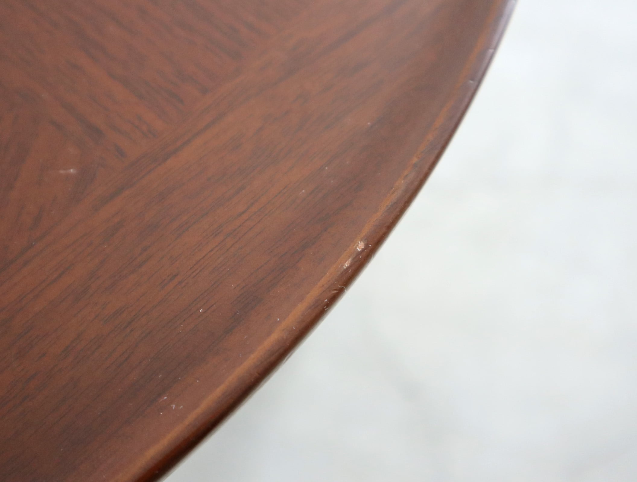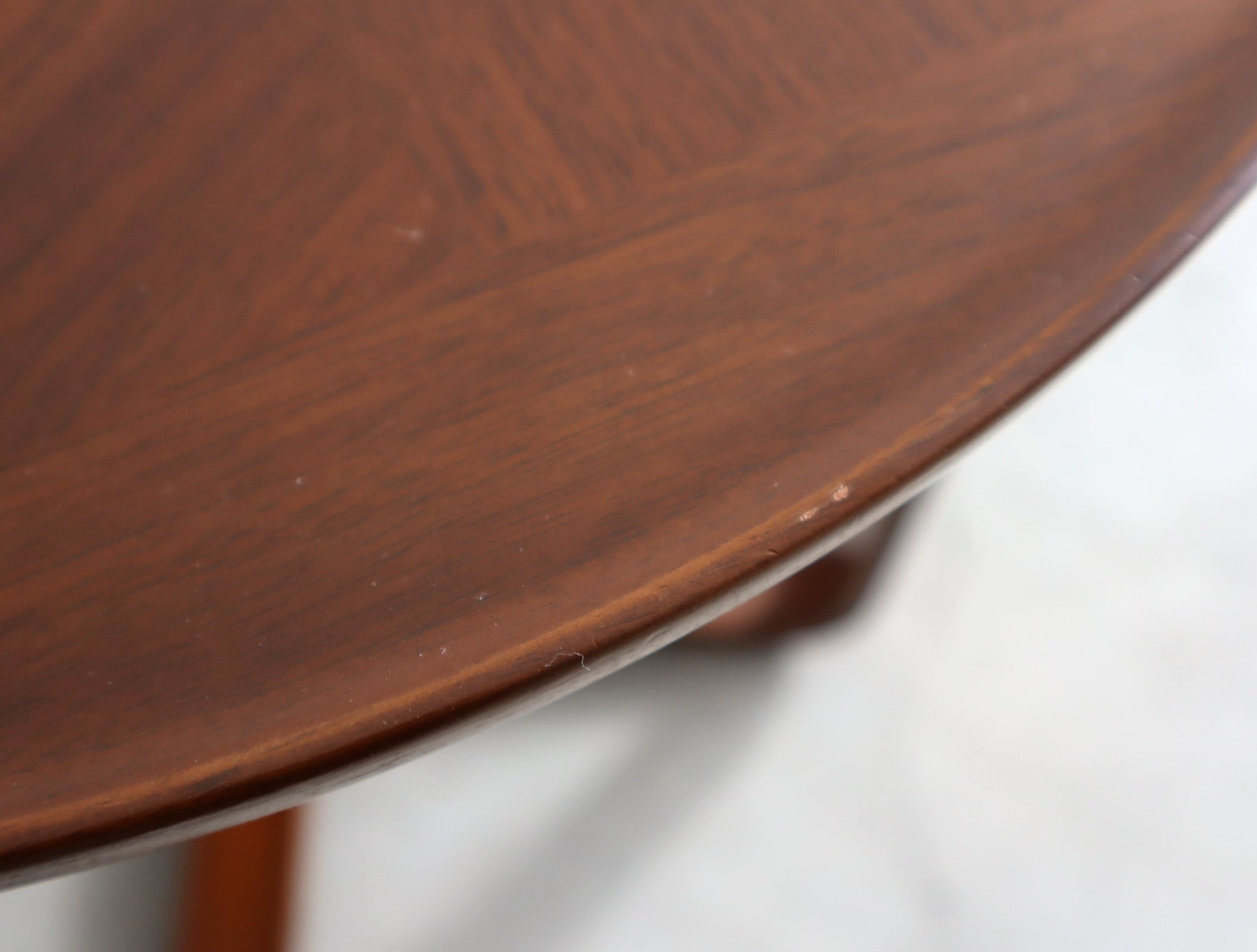 天板は突板寄木張りのラウンド形状。無垢材使用のエッジには「水返し」と呼ばれる古来から伝わる意匠が施され、柔らかく空間に馴染む印象に。