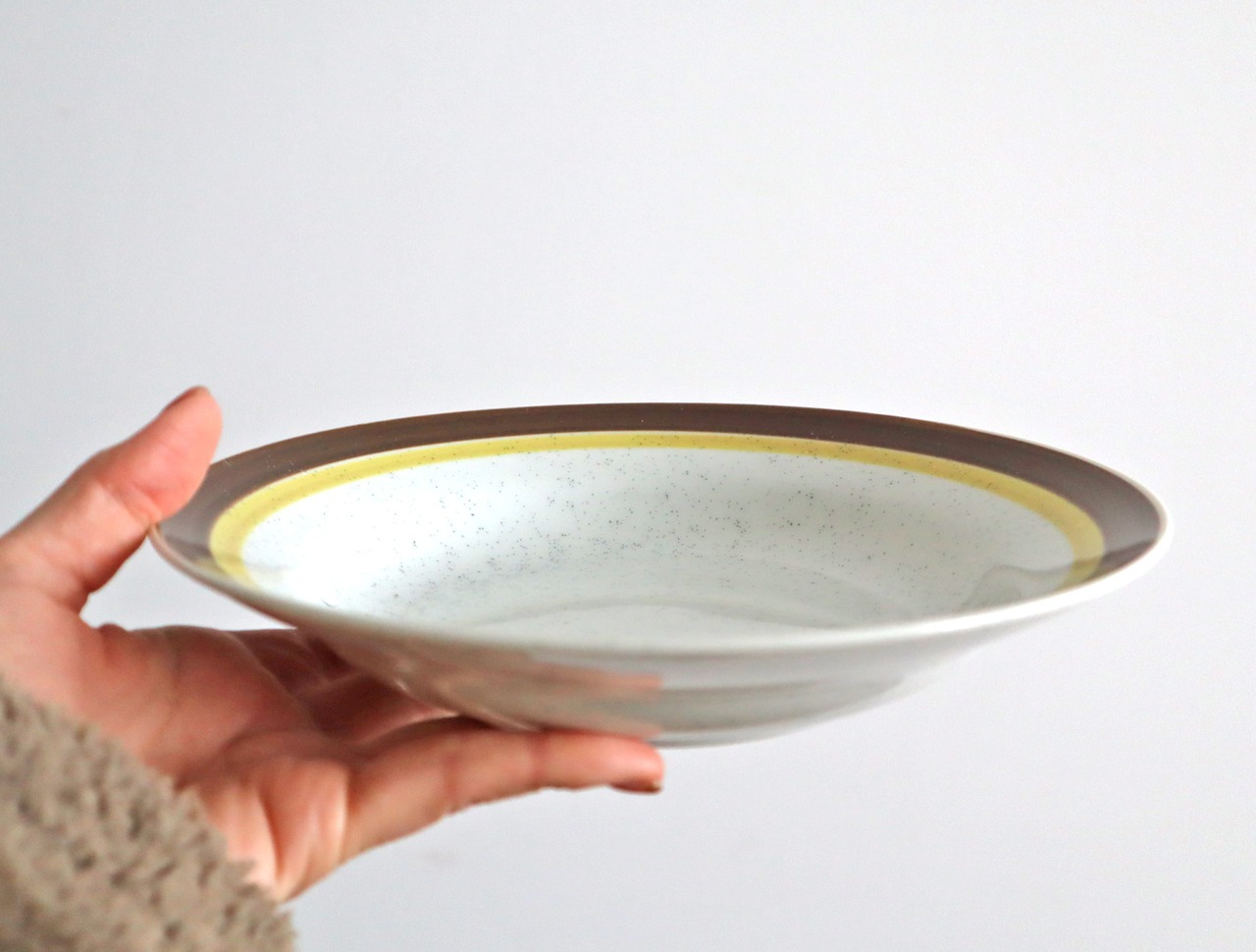 深みのあるブラウン、その内側に一周走るやわらかなイエローはどこか70〜80年代の空気をまといながら、主張しすぎず食卓にすっと溶け込みます。