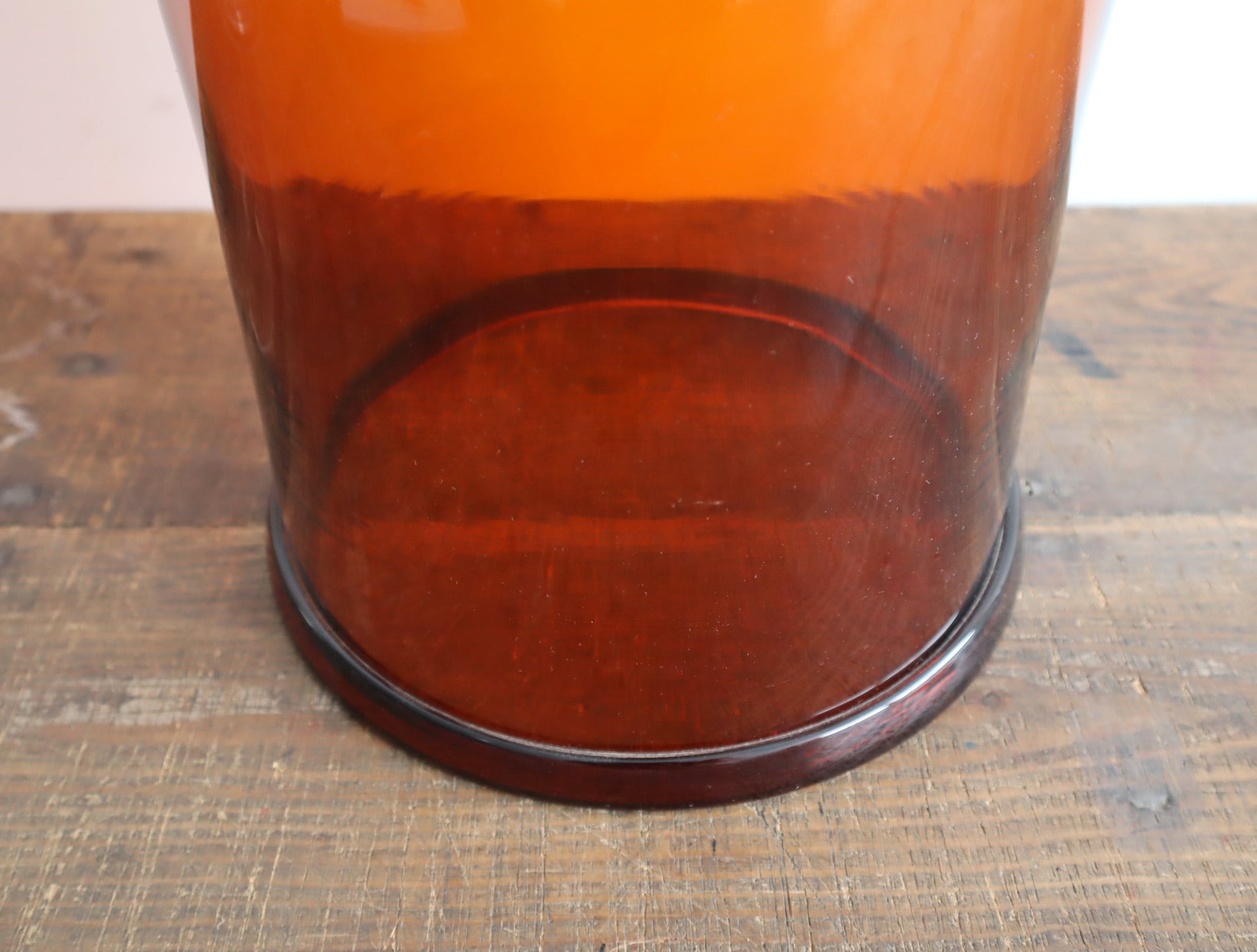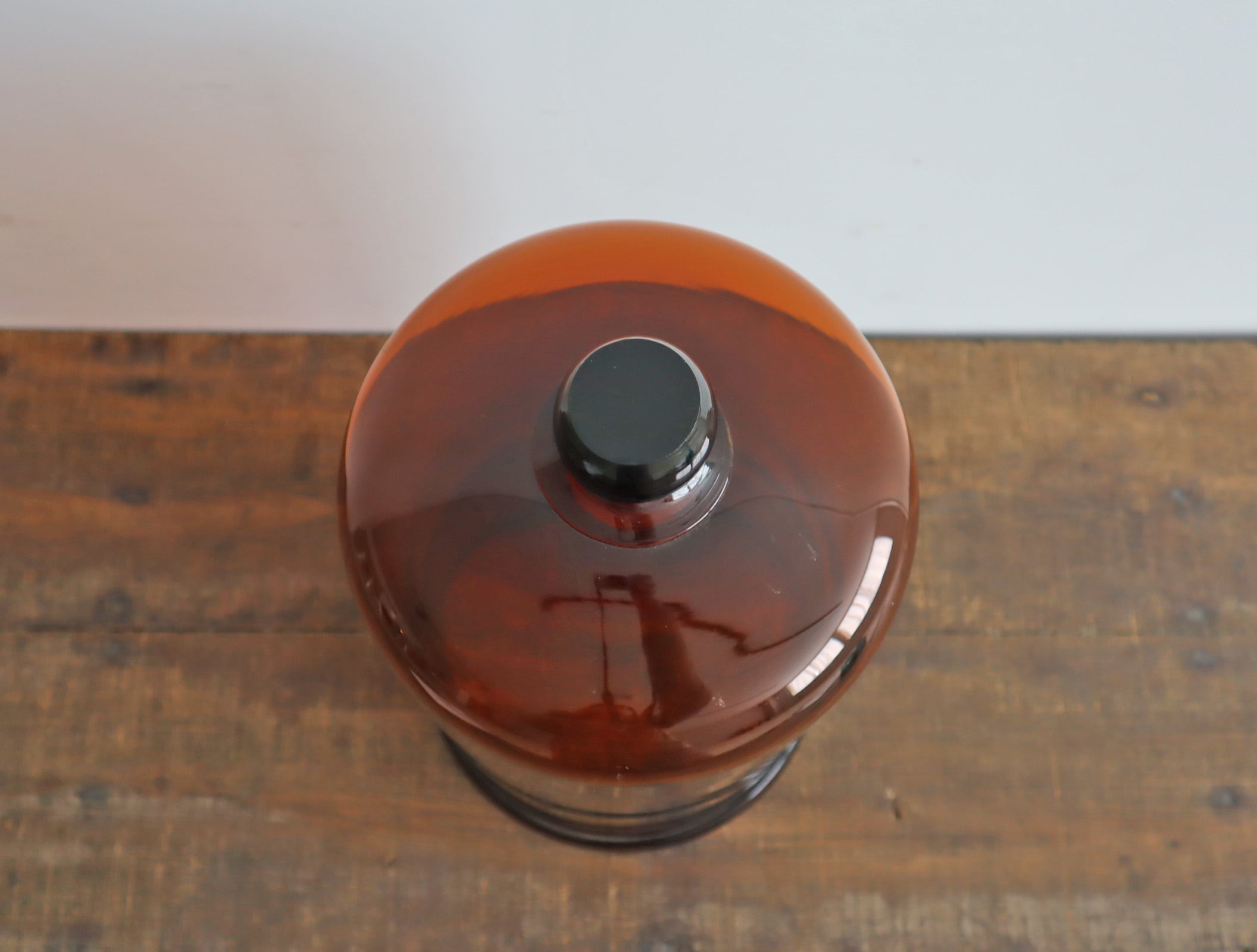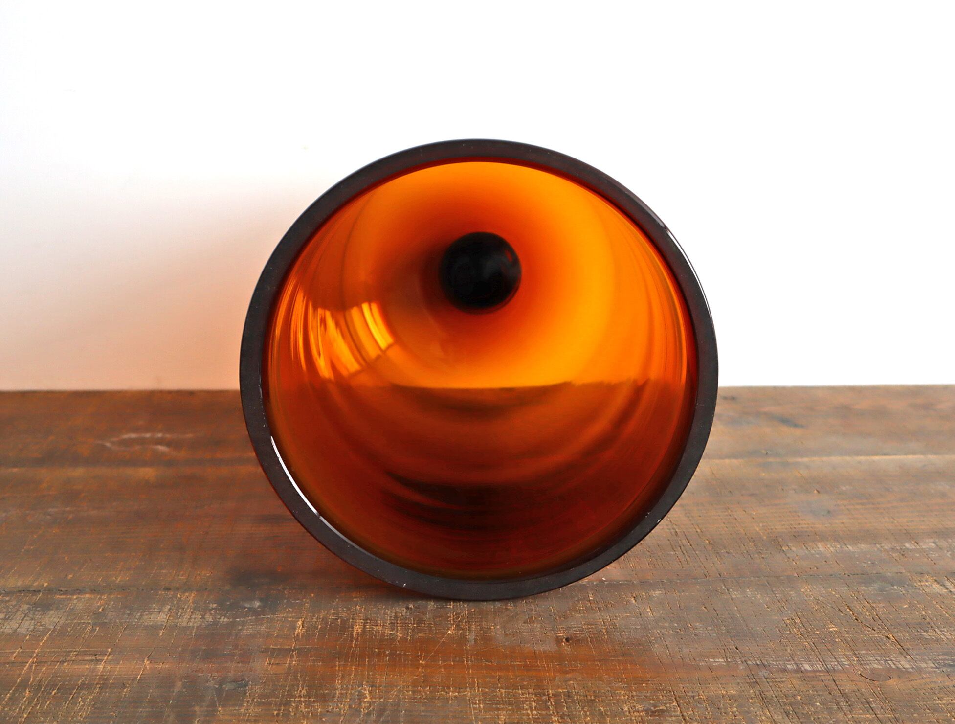 透明なガラスとは違い、どこか静けさと温度を感じる佇まい。ドーム上部の丸みのあるノブ、裾にかけてなだらかに広がるフォルム。均整が取れすぎていない、そのわずかな揺らぎがヴィンテージならではの魅力です。