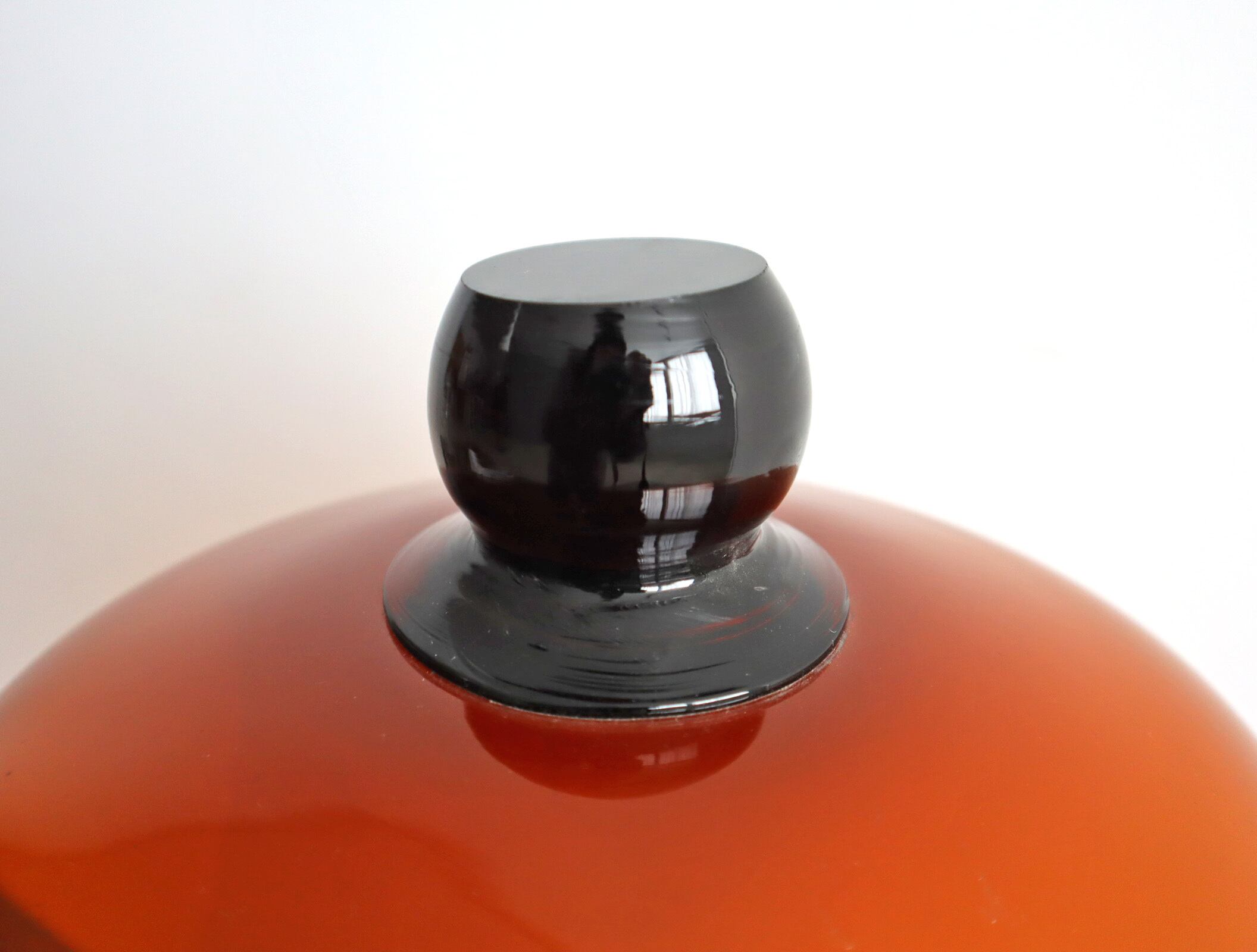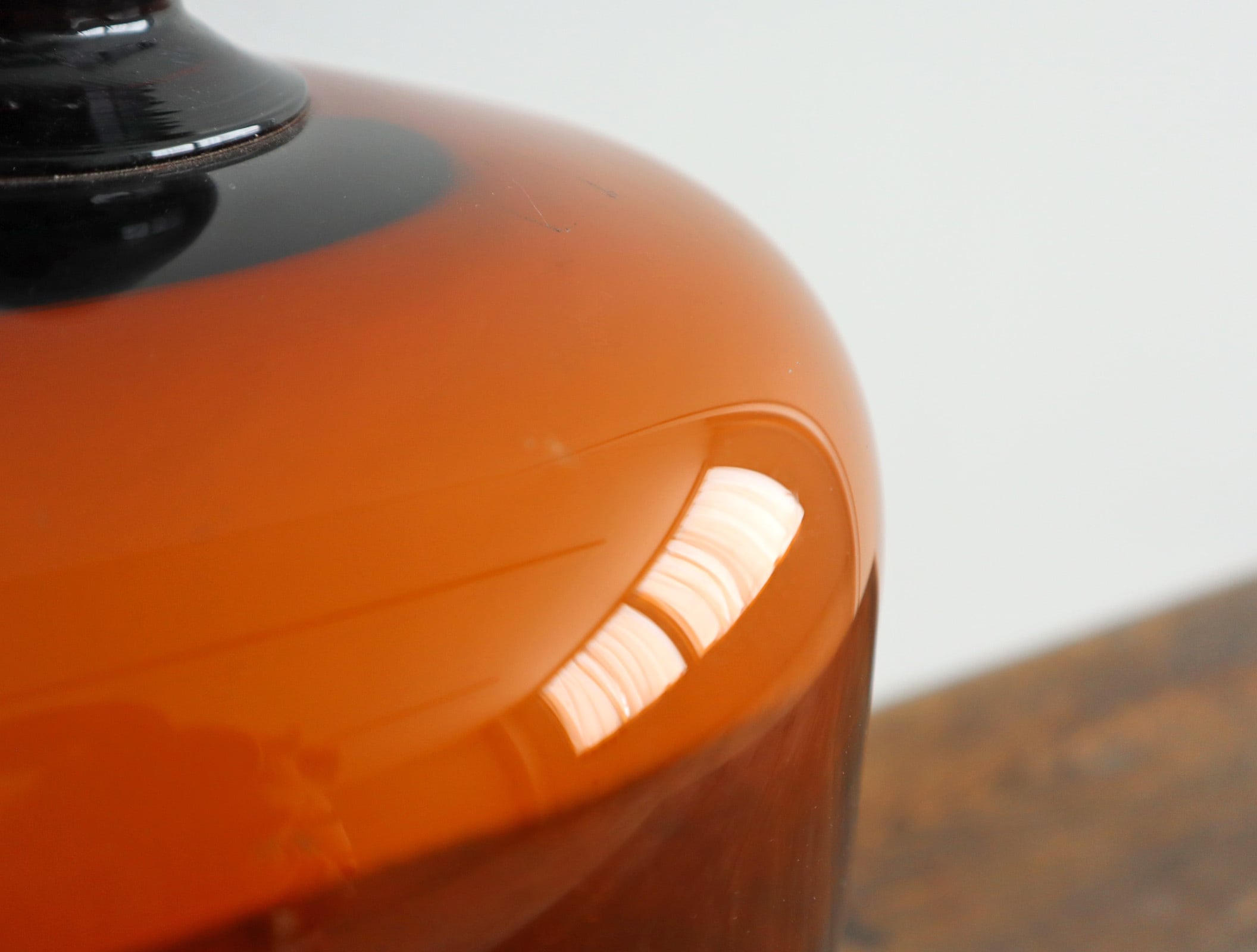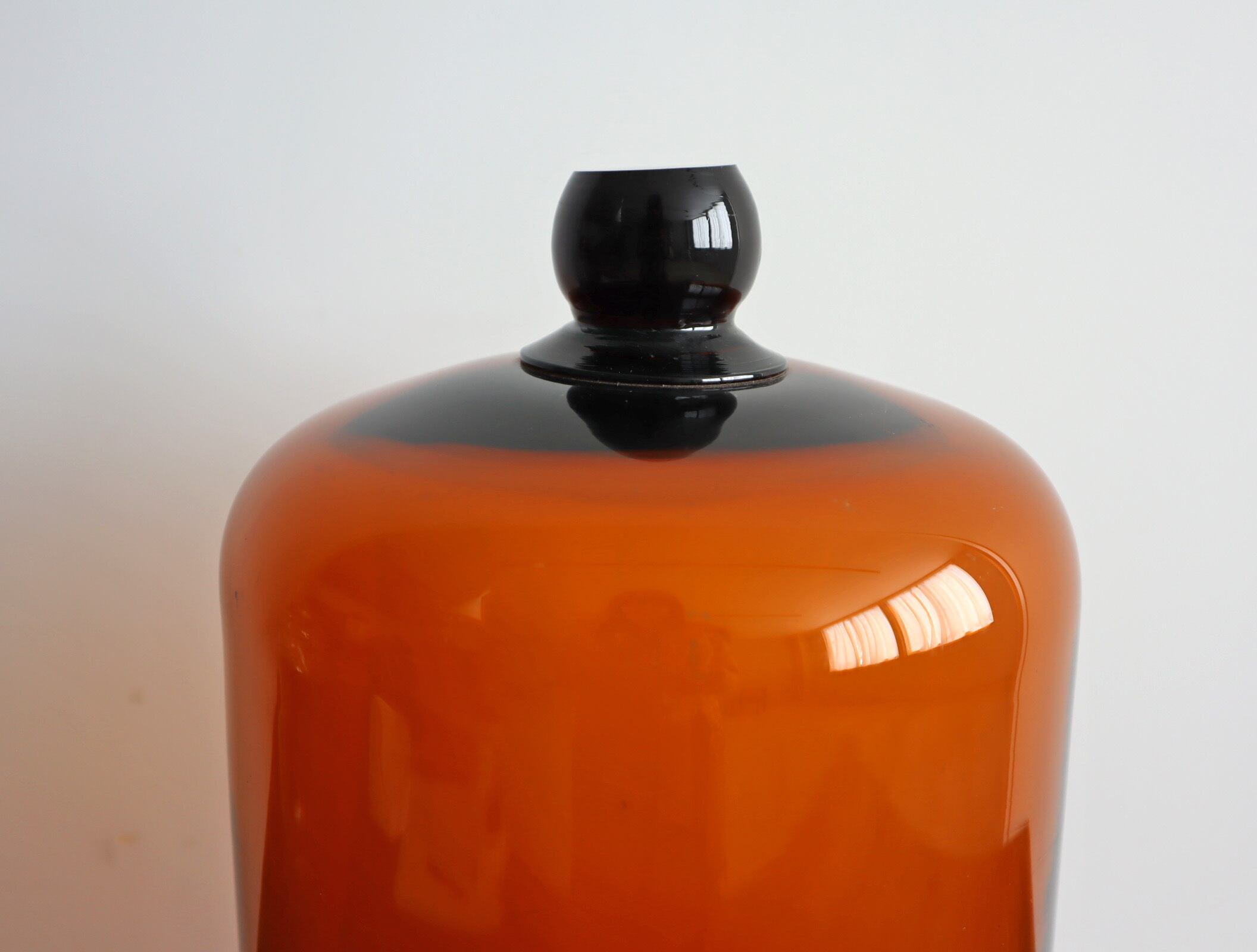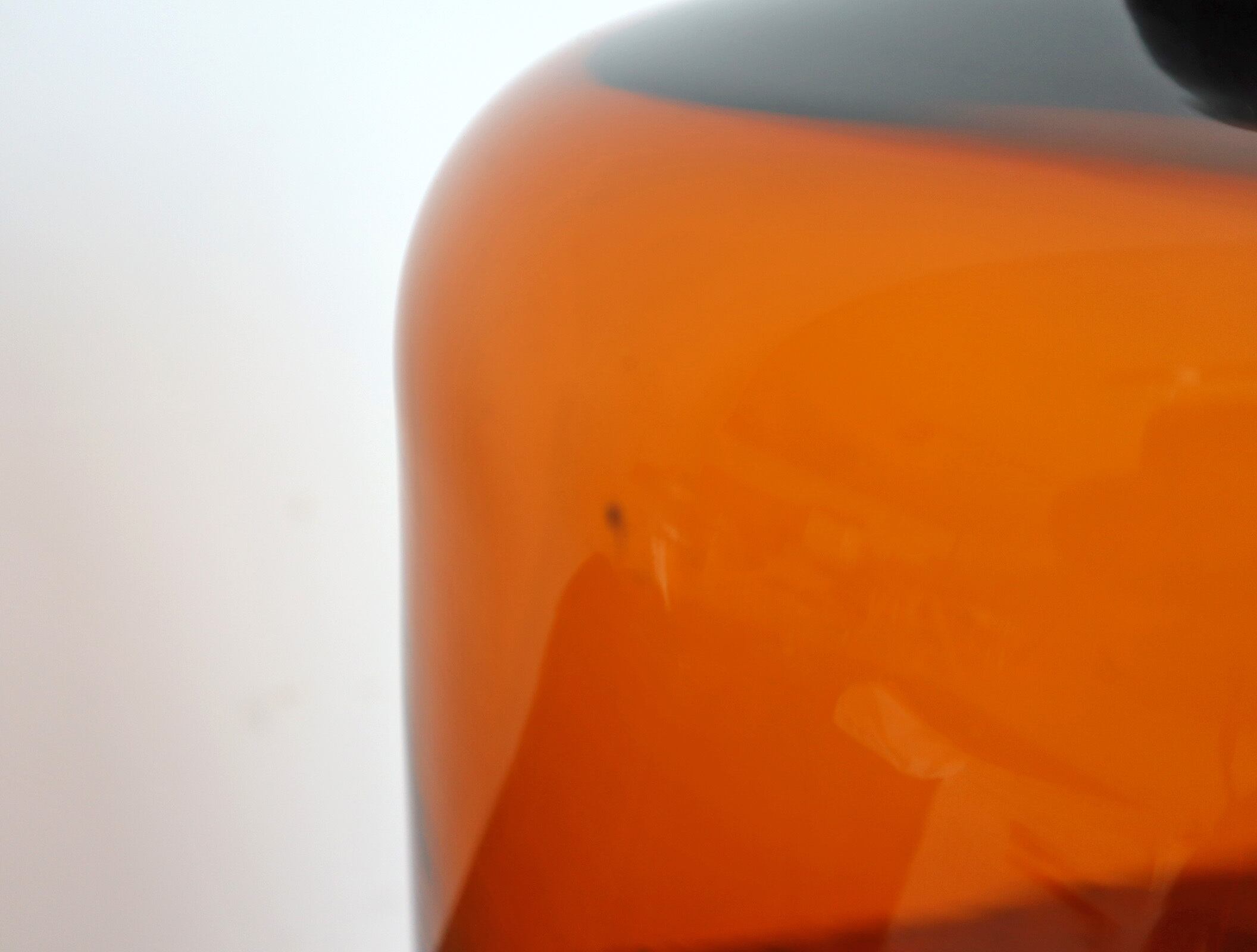 透明なガラスとは違い、どこか静けさと温度を感じる佇まい。ドーム上部の丸みのあるノブ、裾にかけてなだらかに広がるフォルム。均整が取れすぎていない、そのわずかな揺らぎがヴィンテージならではの魅力です。