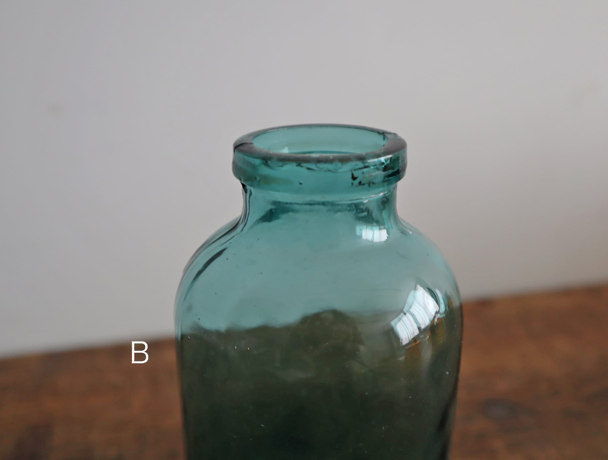 時を重ねたガラスだけが持つ、やわらかな揺らぎと深みのある表情。かつて薬品瓶や保存容器として使われていたヴィンテージのガラスボトルです。