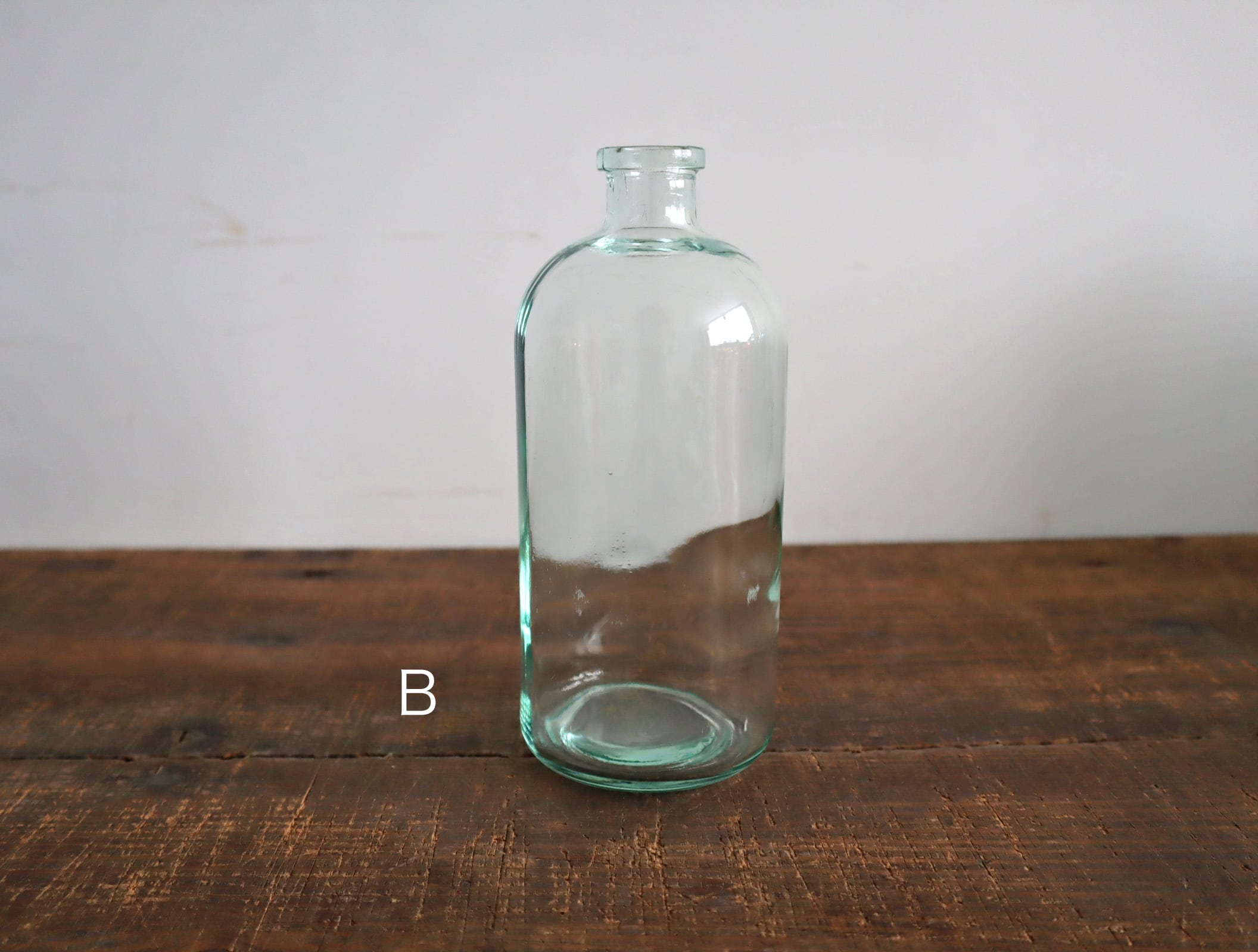 時を重ねたガラスだけが持つ、やわらかな揺らぎと深みのある表情。かつて薬品瓶や保存容器として使われていたヴィンテージのガラスボトルです。