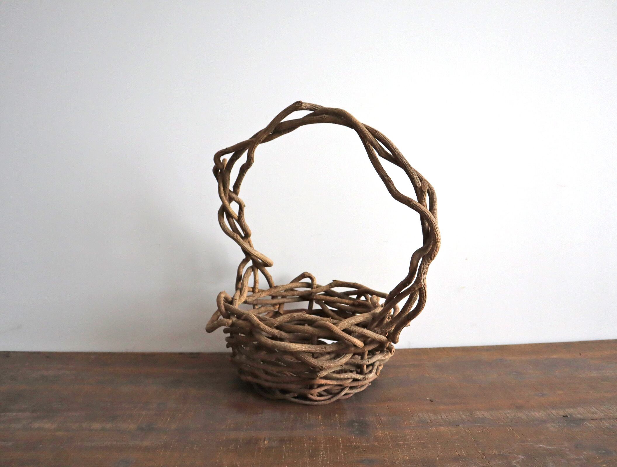 年月を重ねた蔓ならではの色味や乾いた質感、歪みや節も含めて、このかごだけの個性です。