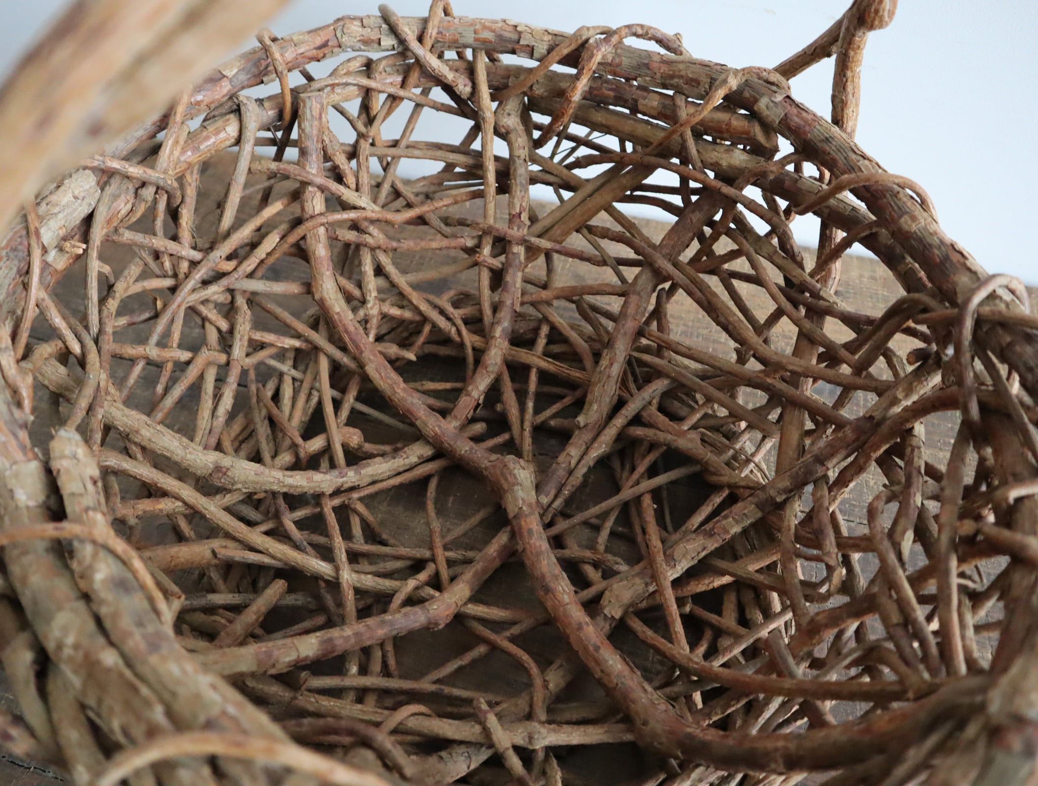 まるで大自然の中で植物が生い茂るかのように無造作に編み込まれたかご。