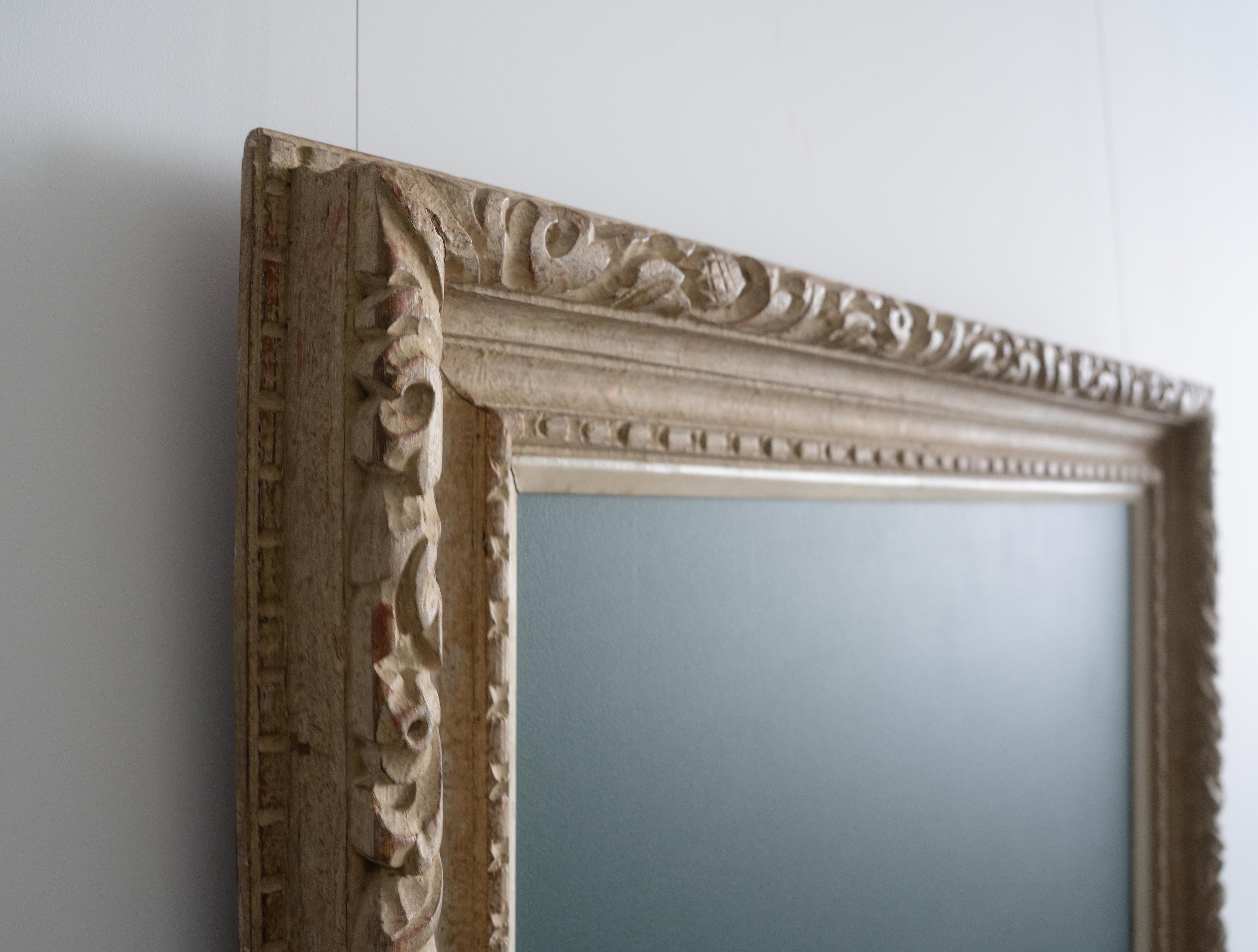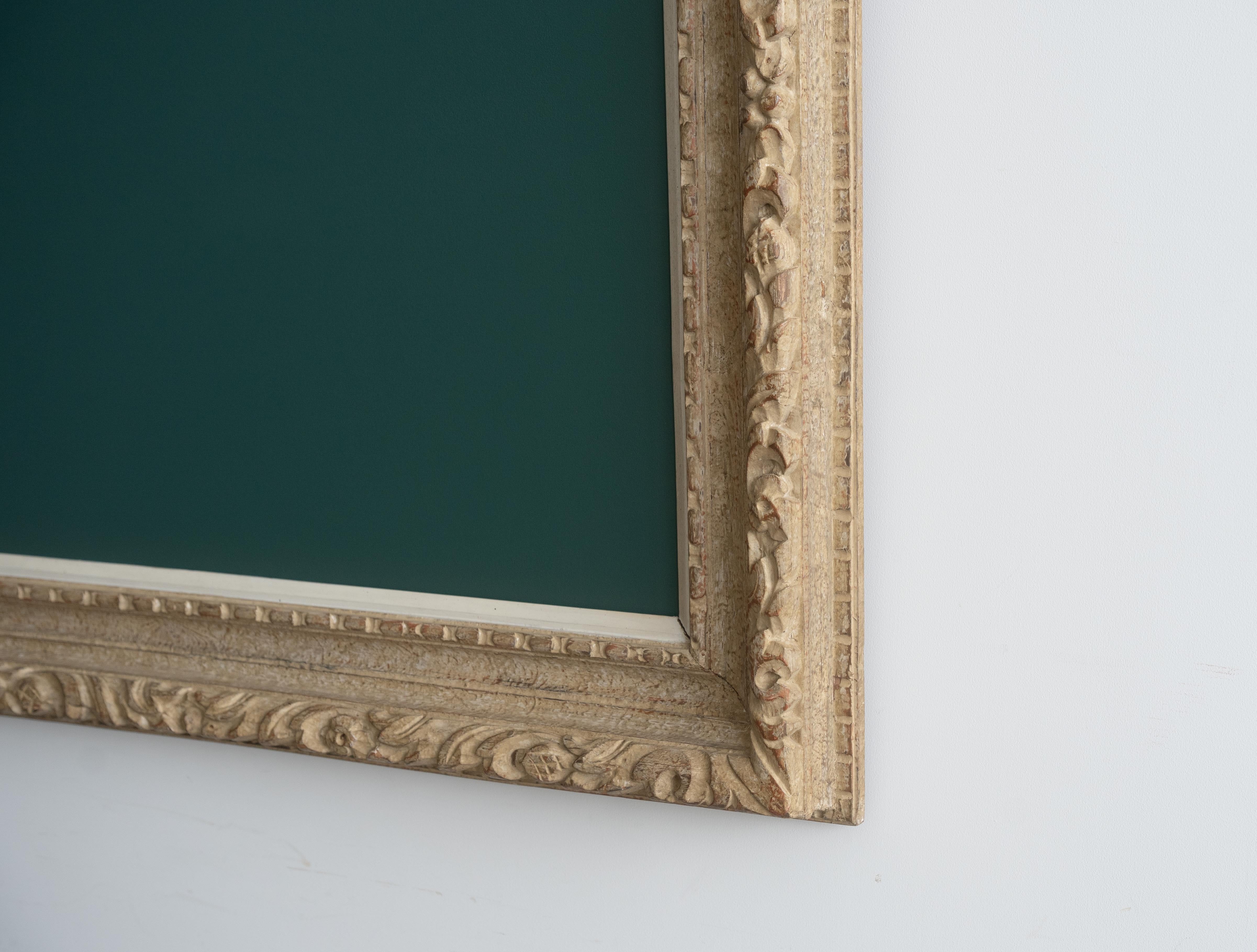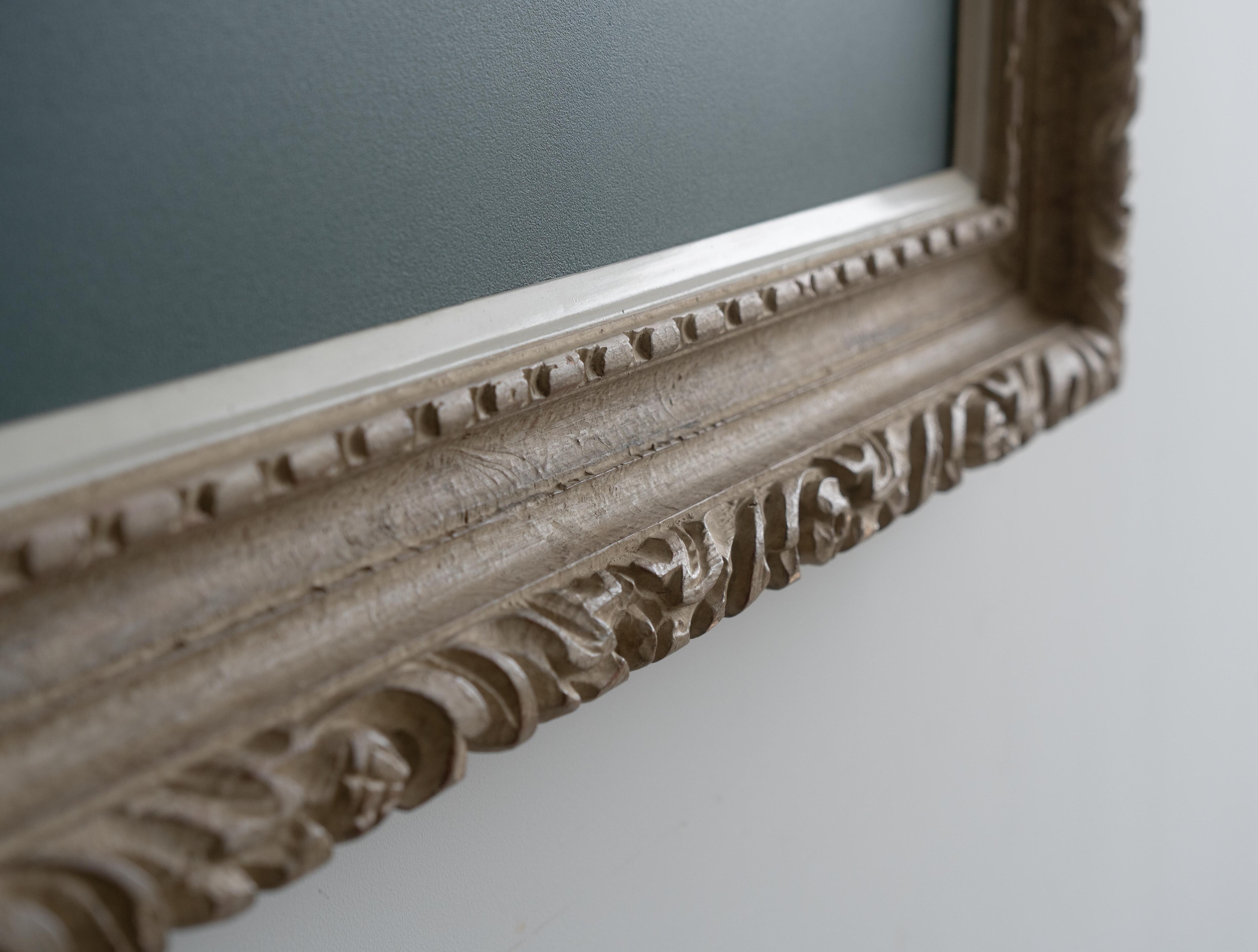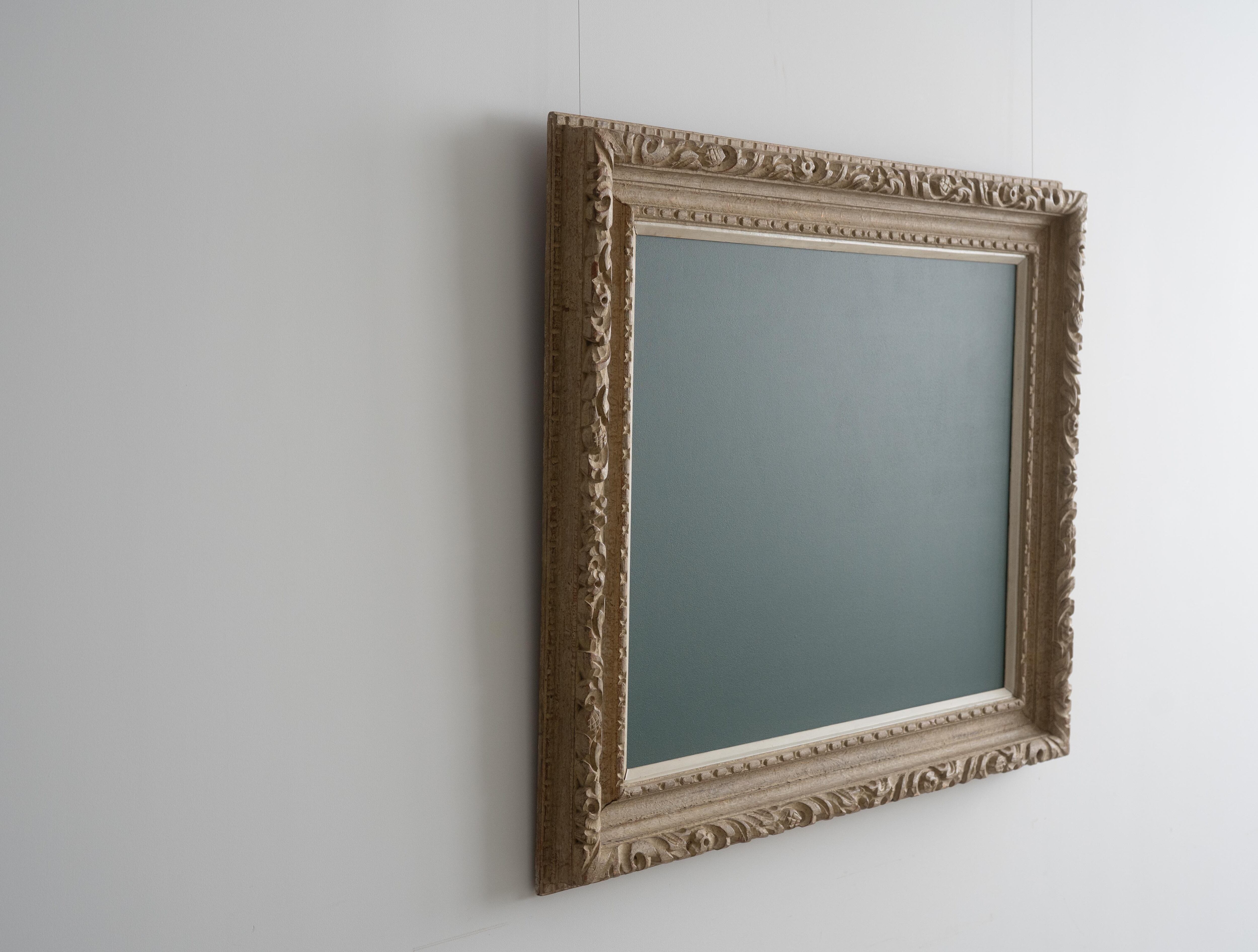装飾性の高い彫刻フレームが持つクラシカルな存在感と、グリーンカラーのチョークボードペイントによる素朴で実用的な表情。そのコントラストが、空間にほどよい緊張感と遊び心をもたらします。