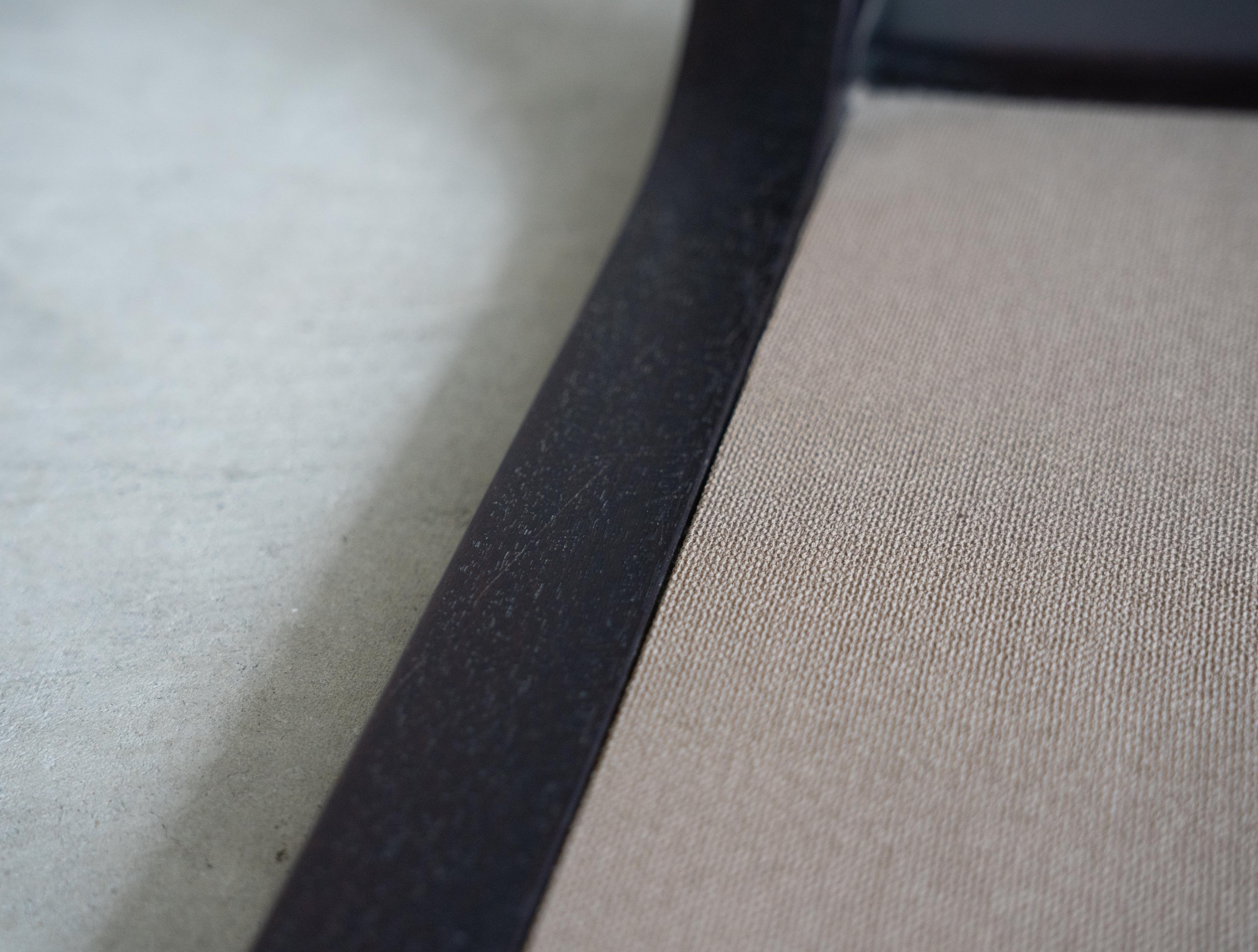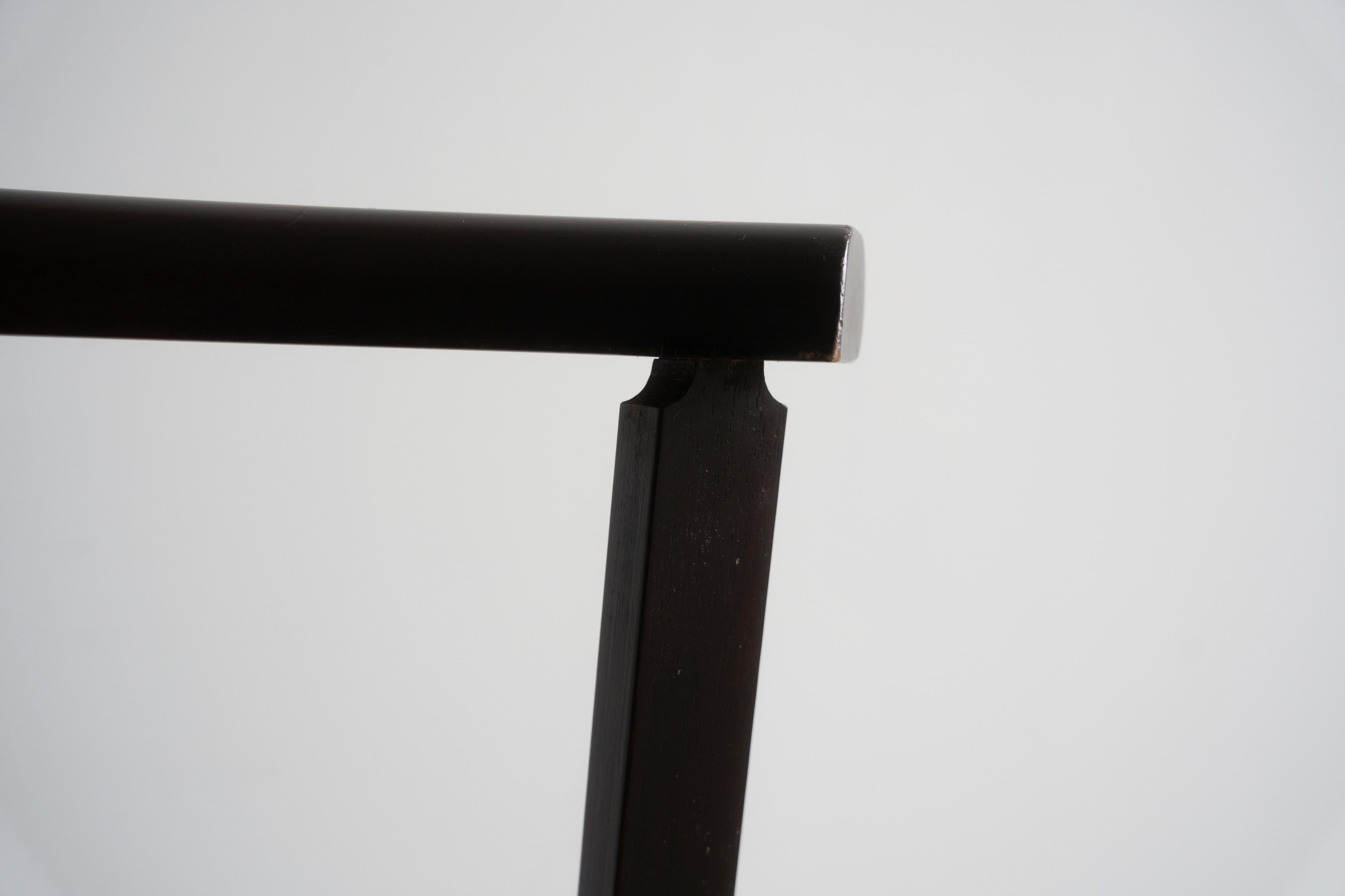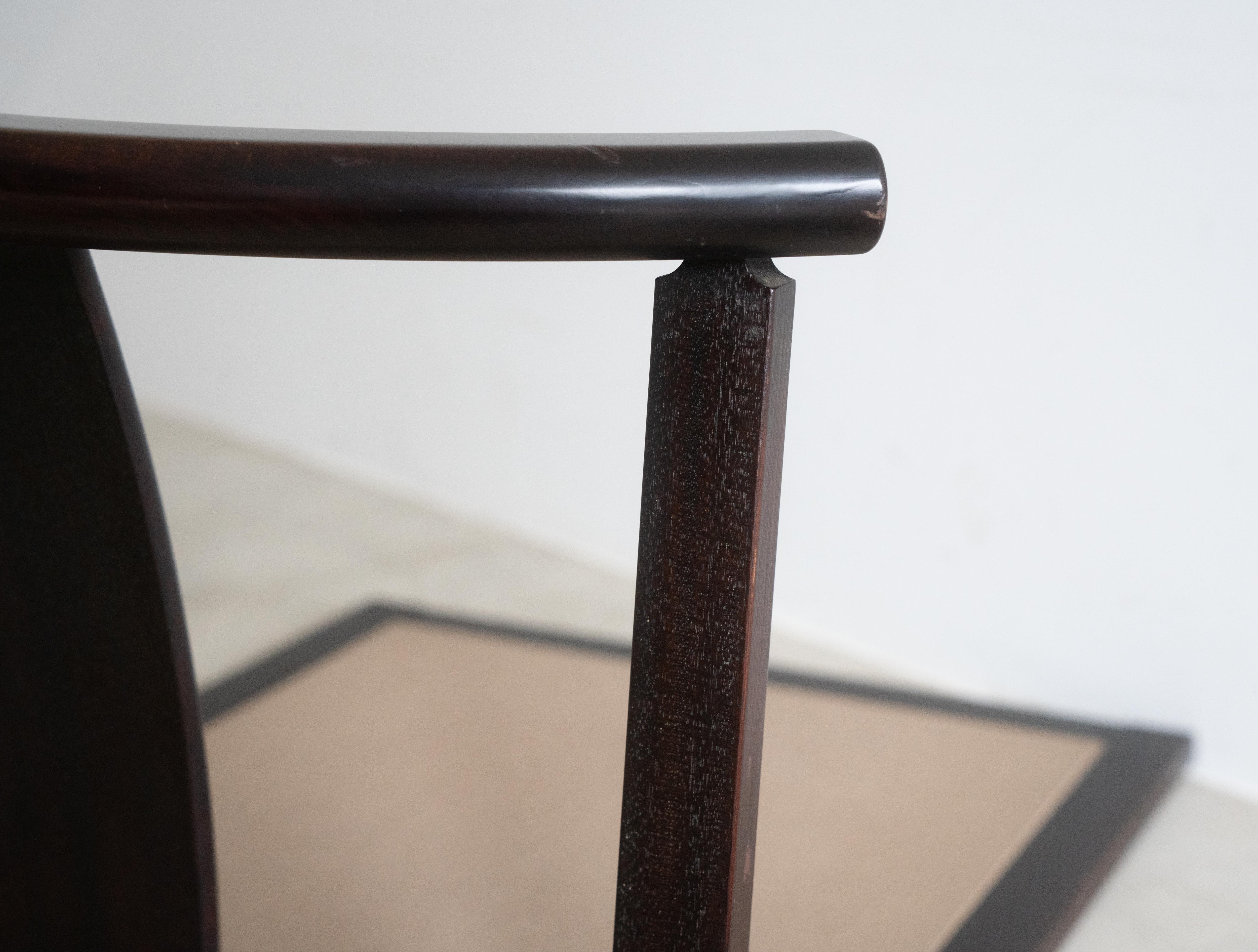 バーチ材と思われる無垢材削り出しの美しい曲線に成型された背もたれ笠木にコマ入れ仕様のプライウッドフレーム表面材は希少なローズウッド、からだに寄り添い安らぎと落ち着きを演出する凛としたシルエットが特徴で、さらにスタッキングできる点にも機能美がうかがえます。