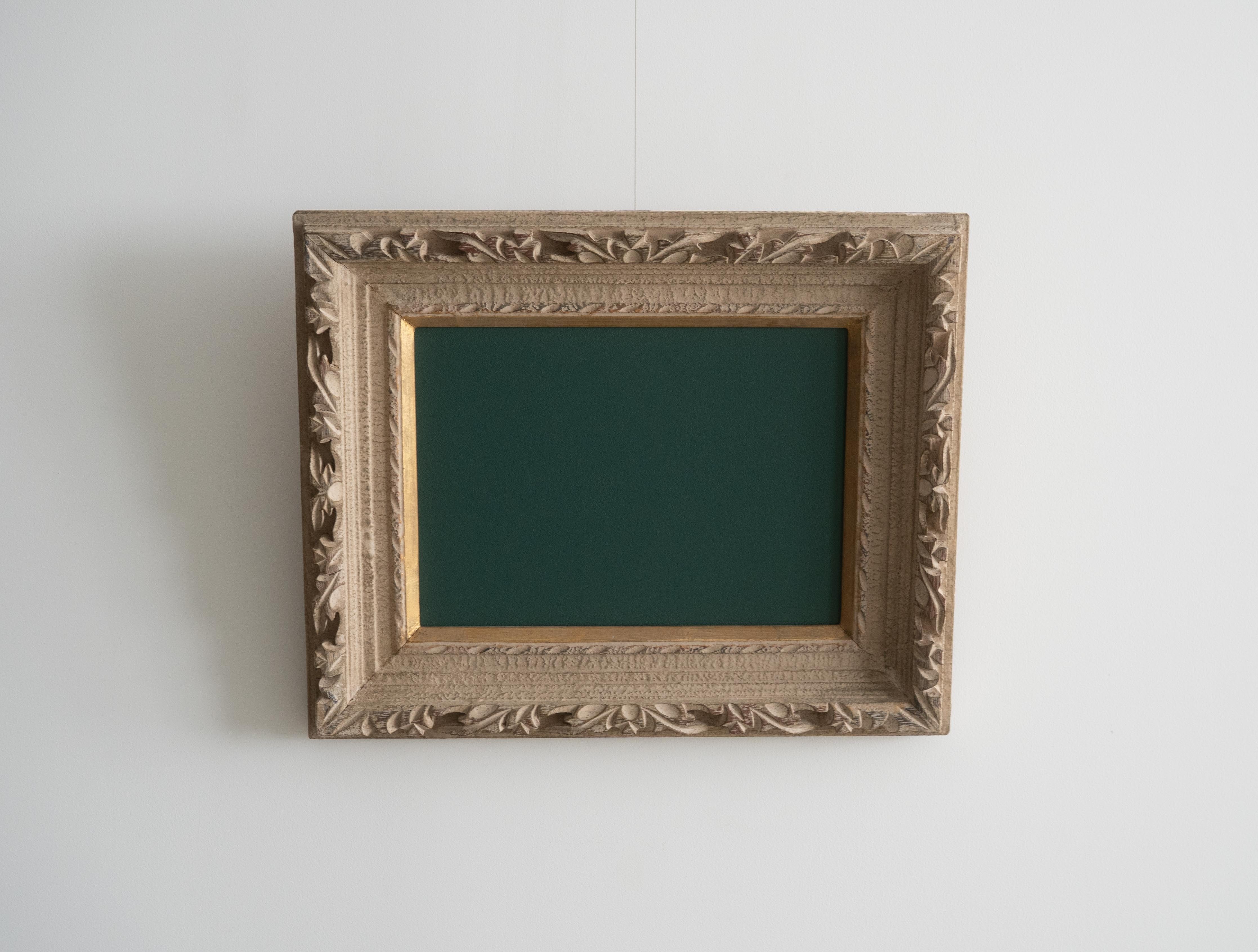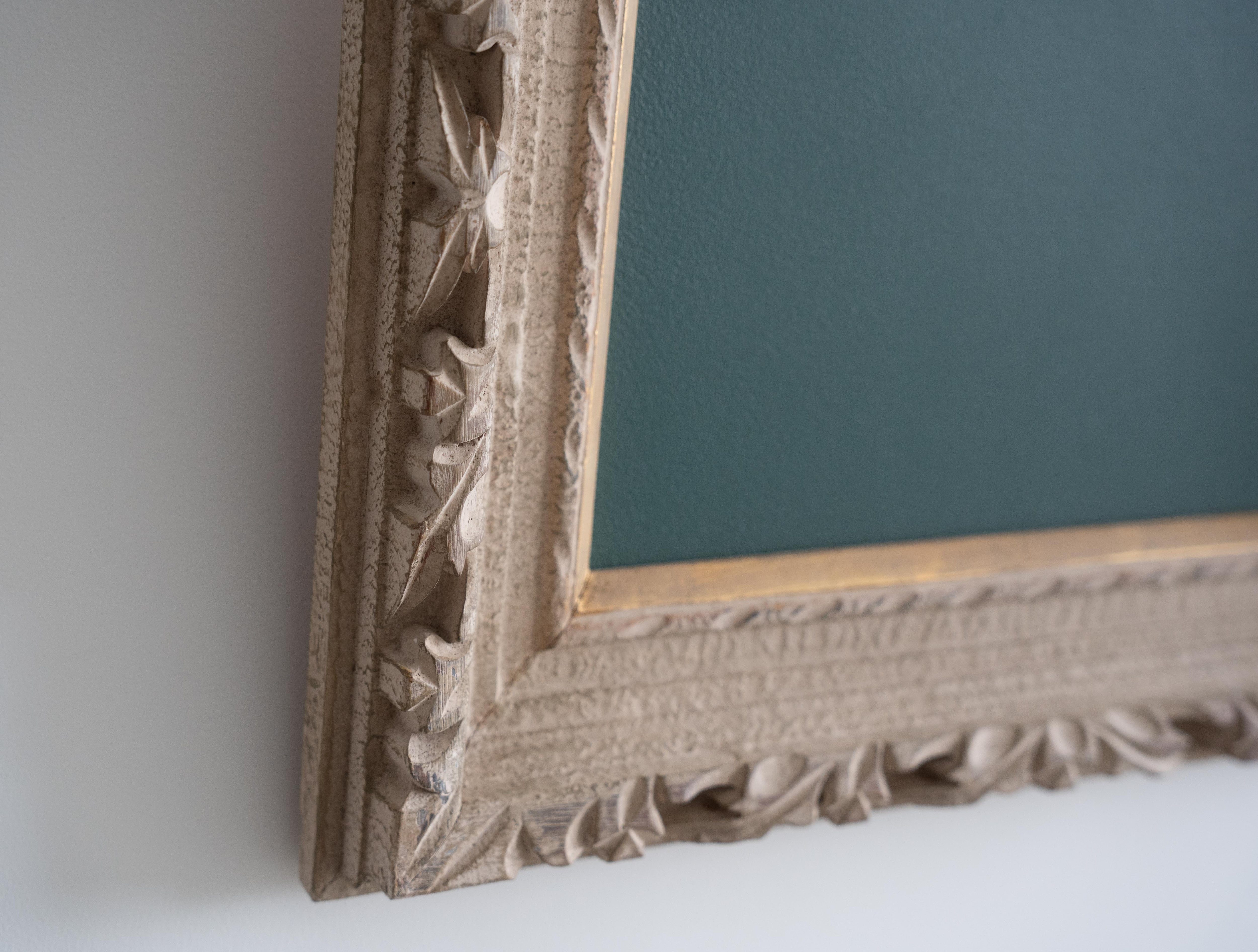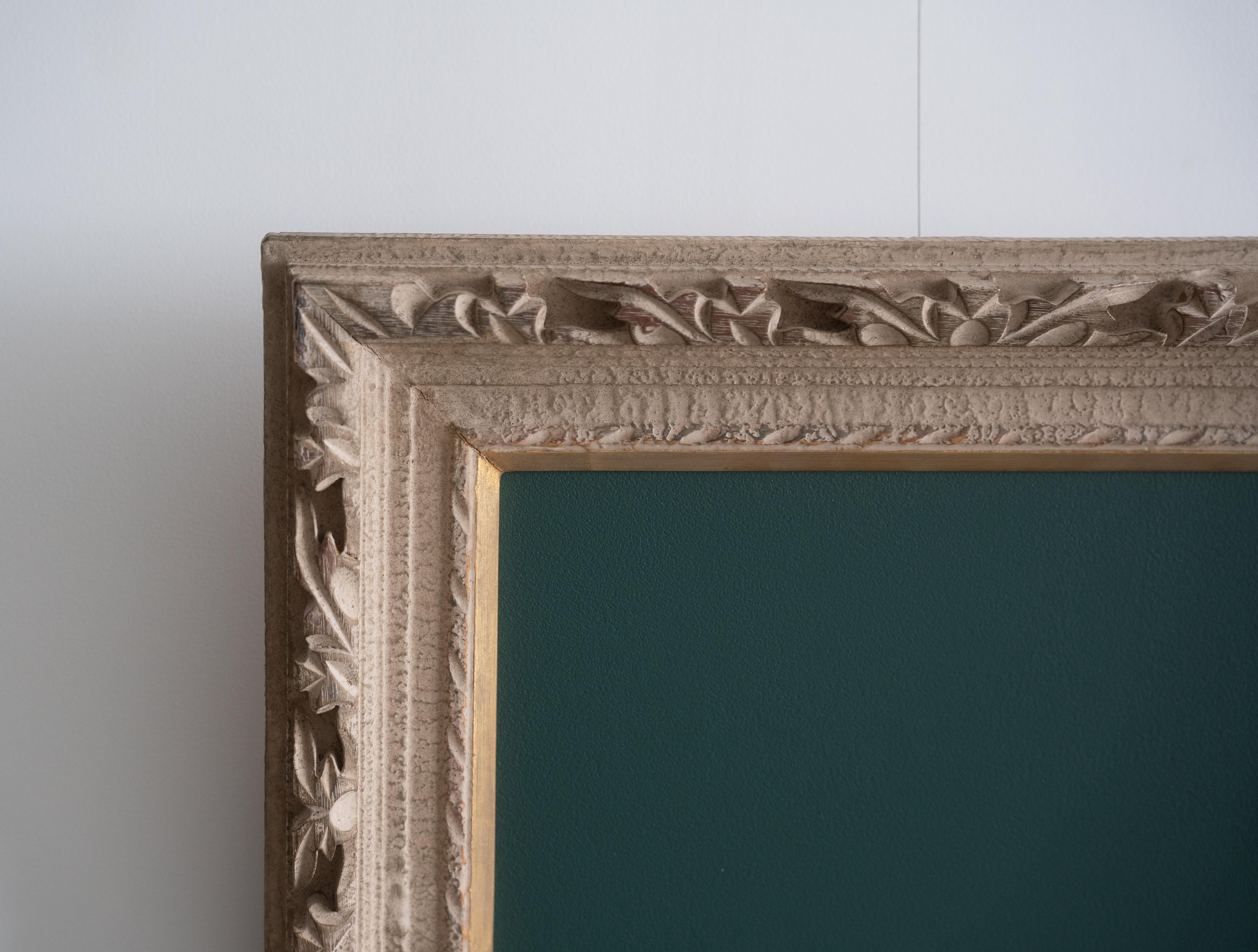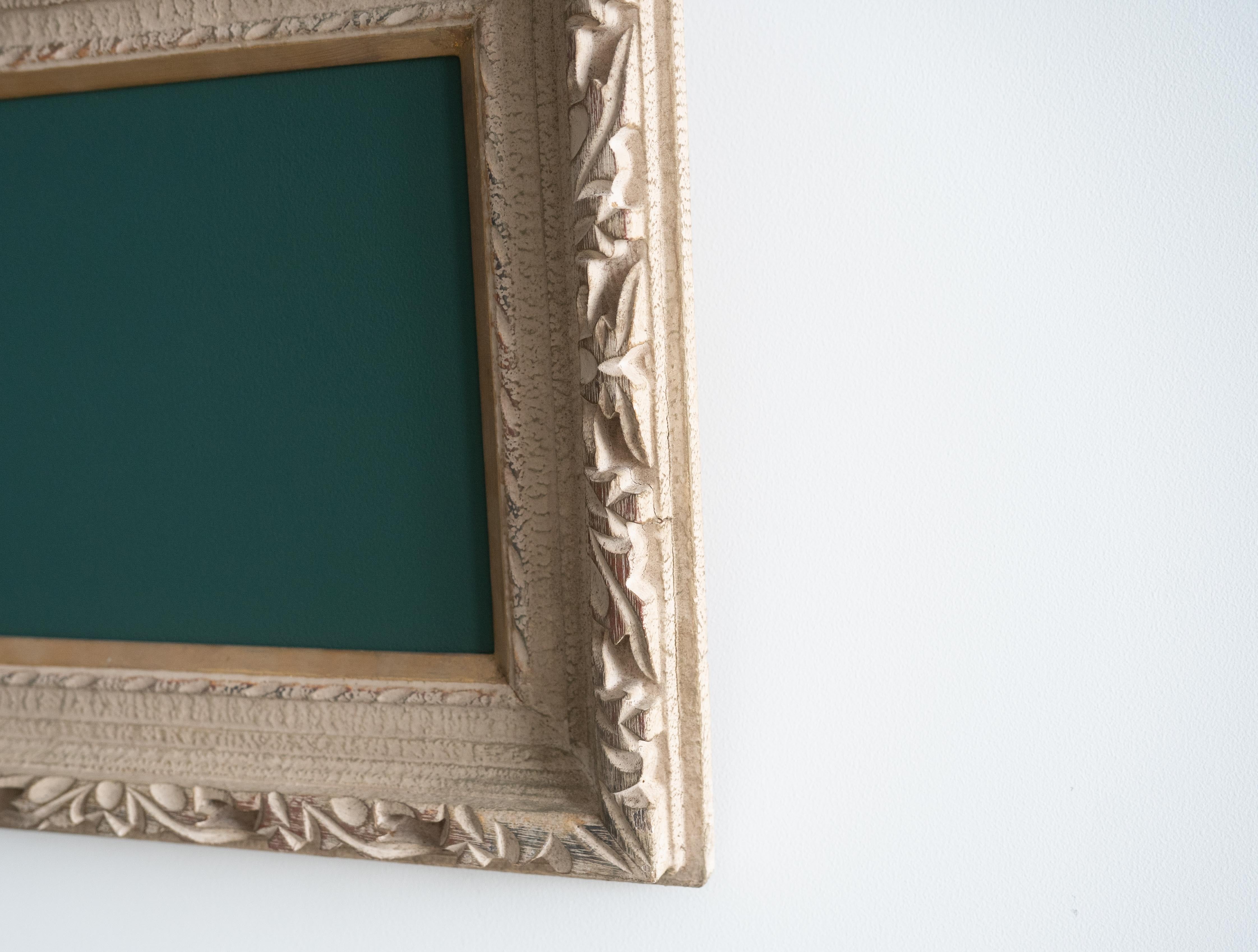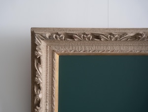 装飾性の高い彫刻フレームが持つクラシカルな存在感と、黒板の素朴で実用的な表情。そのコントラストが、空間にほどよい緊張感と遊び心をもたらします。