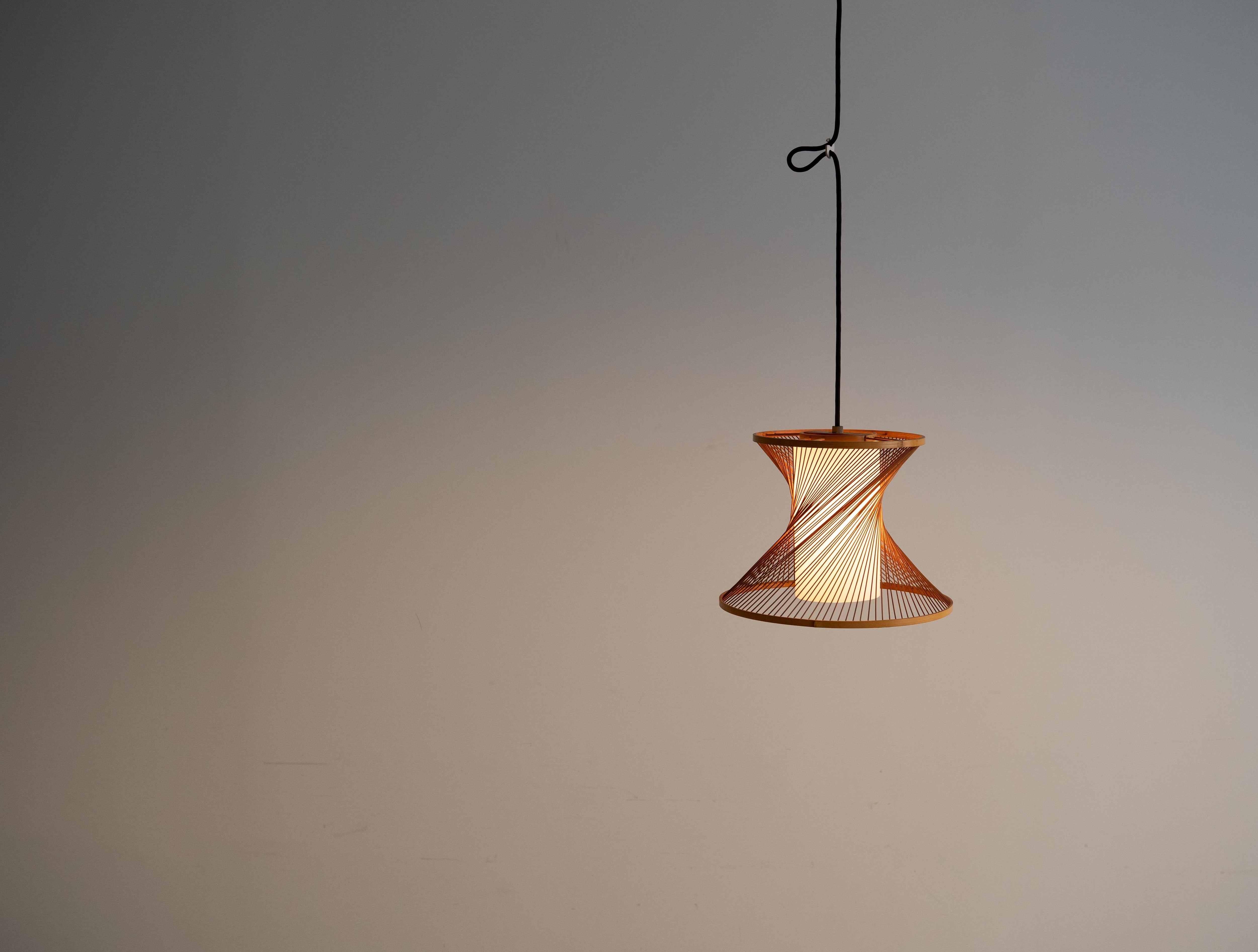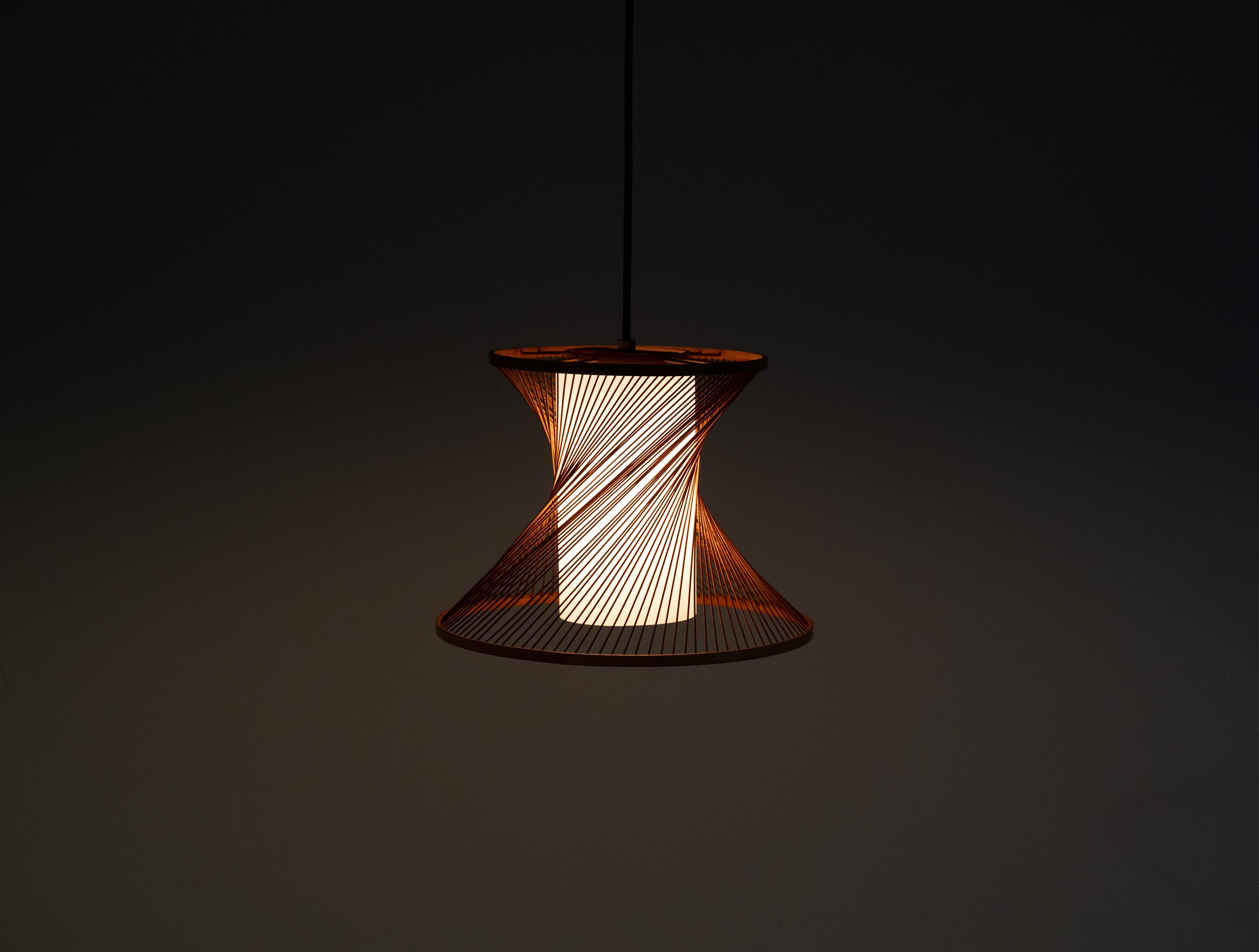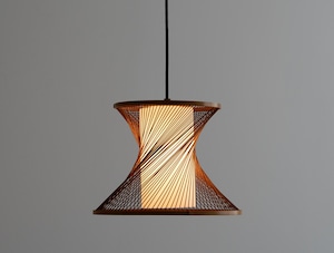細く整えられた竹ひごがツイスト状に張り廻られ、灯りをともすとその隙間から光がやさしくこぼれ、空間に静かな奥行きを生み出します。