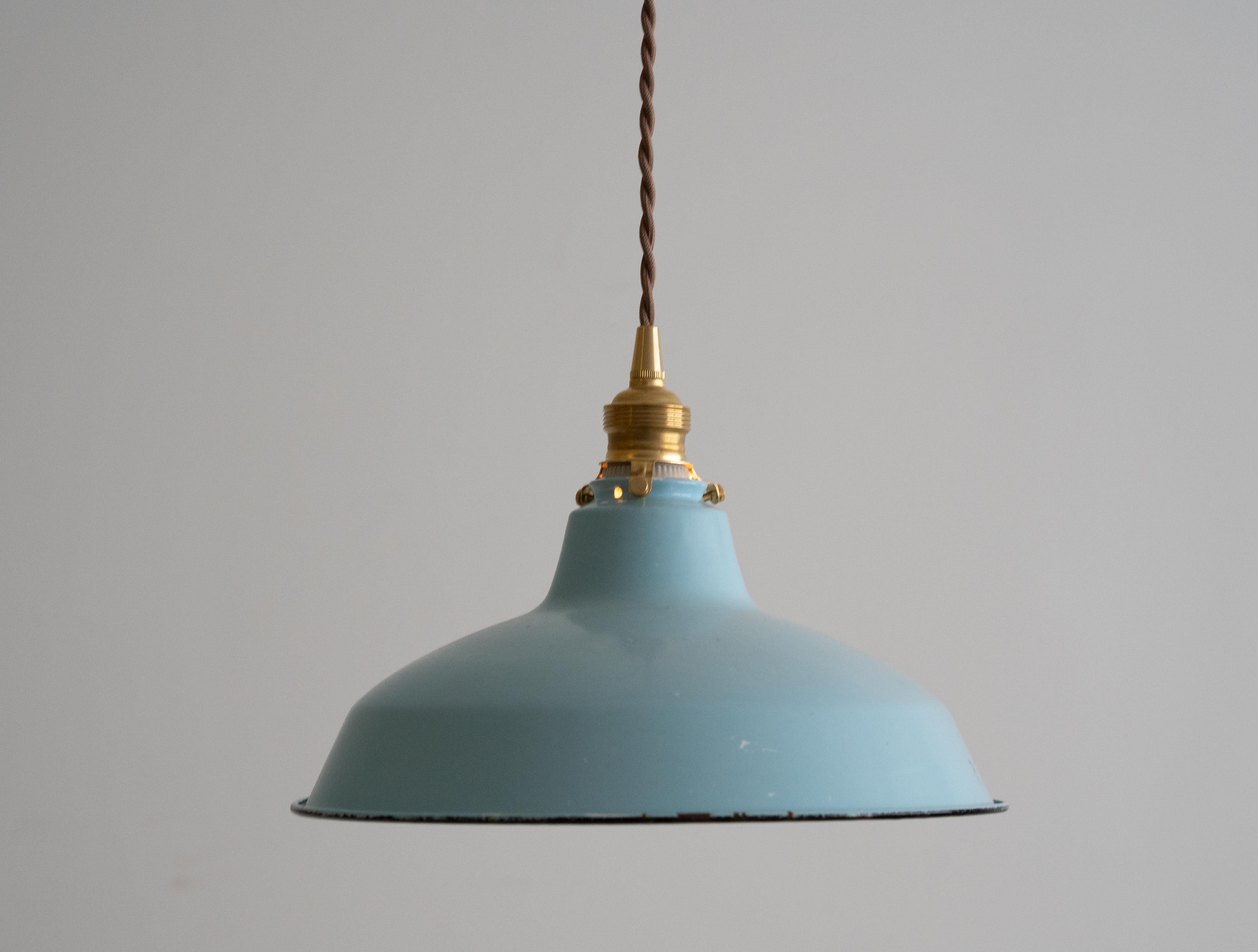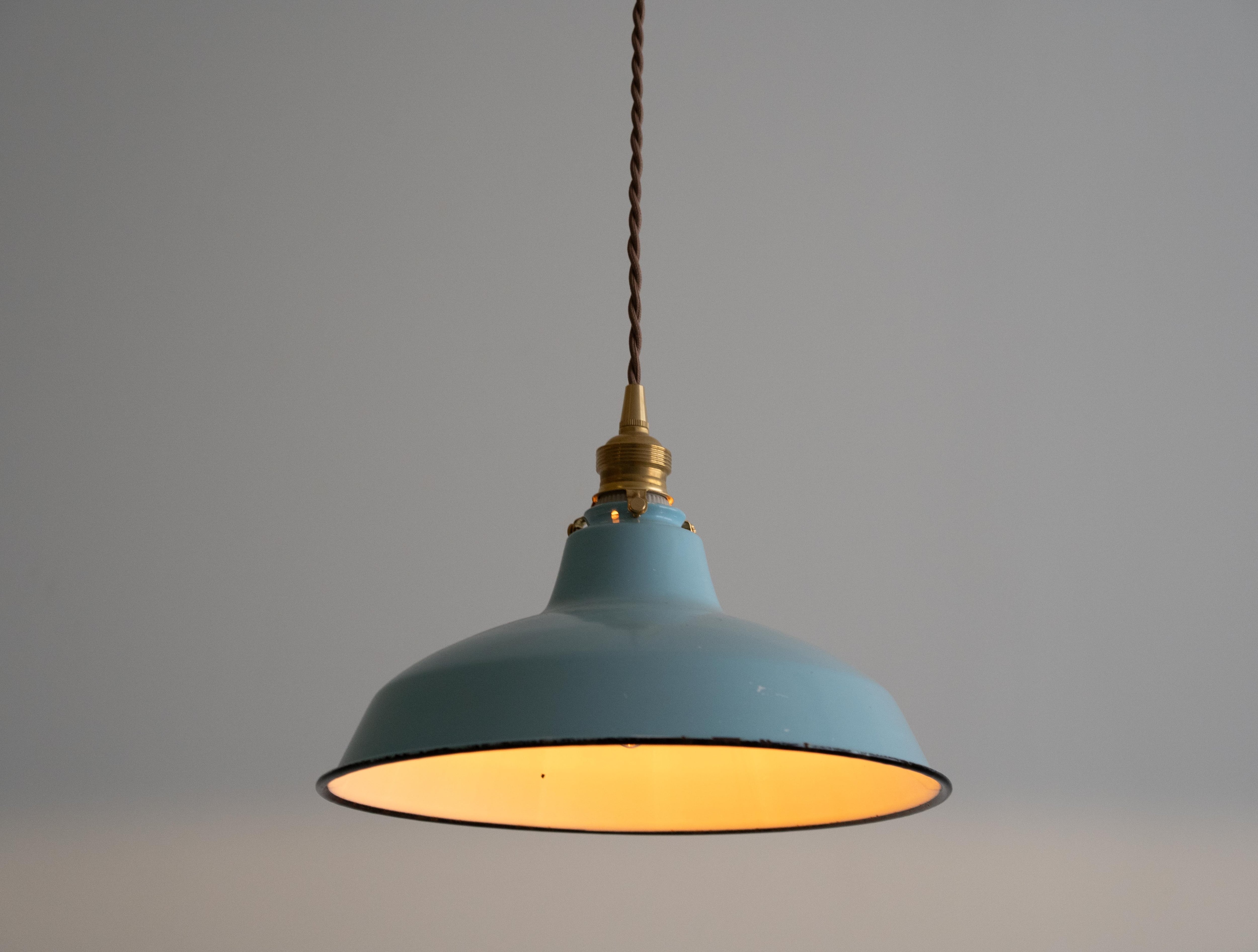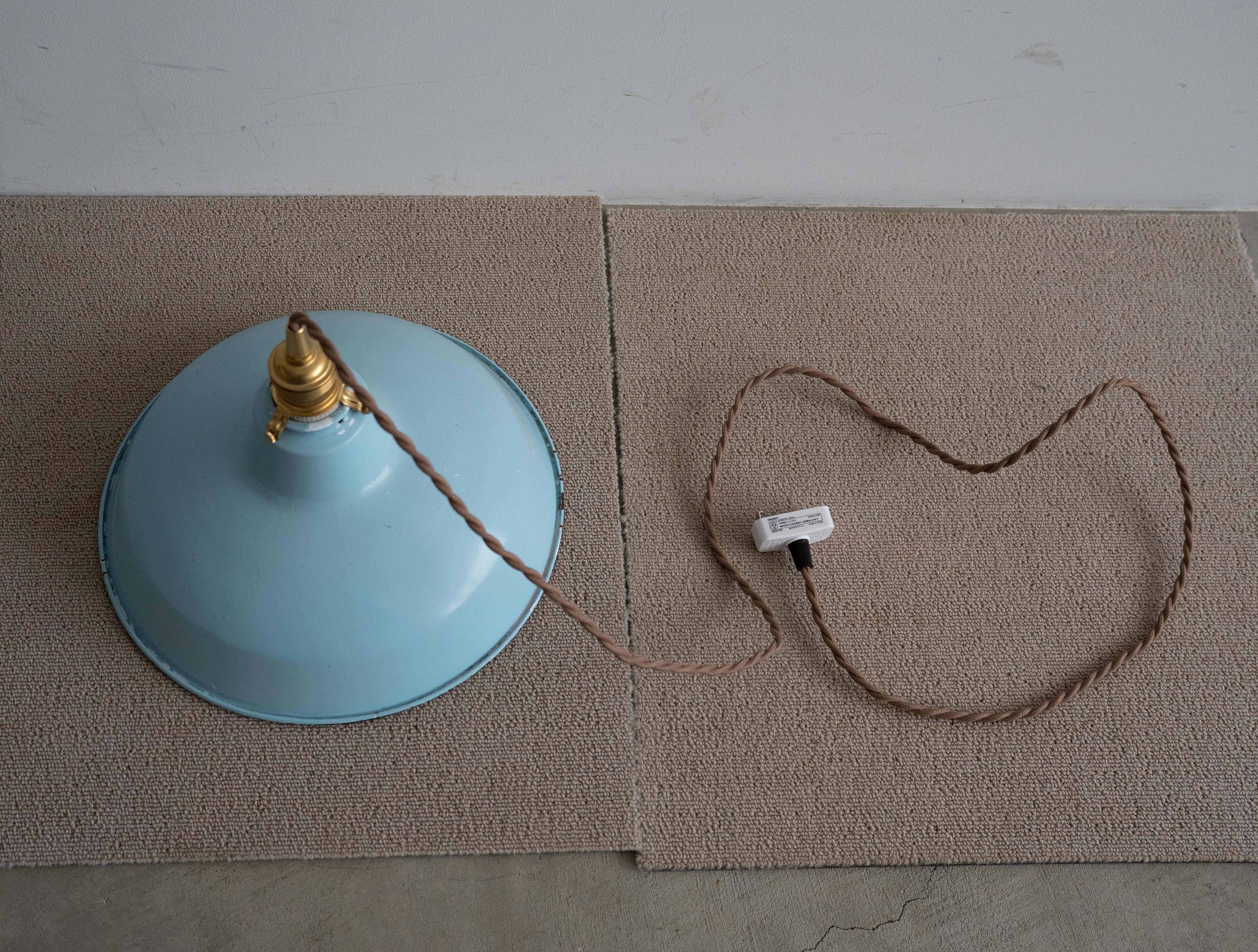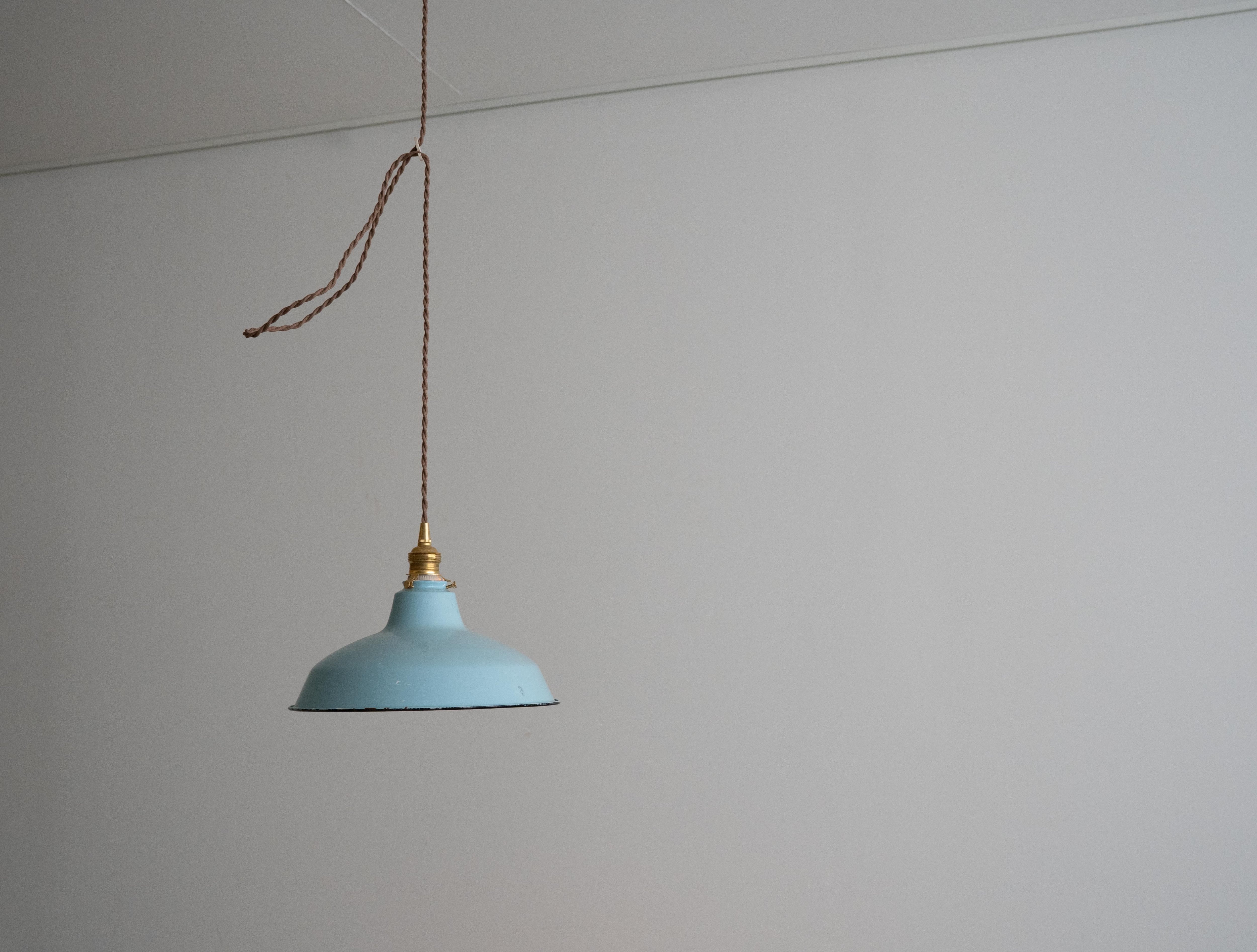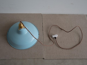 シェードは味わい深い古い琺瑯シェードで、白熱仕様のフィラメント電球、真鍮ソケット、ブラウンのツイストコード、敢えてカバー無しにしたシーリングは全て新調いたしました。