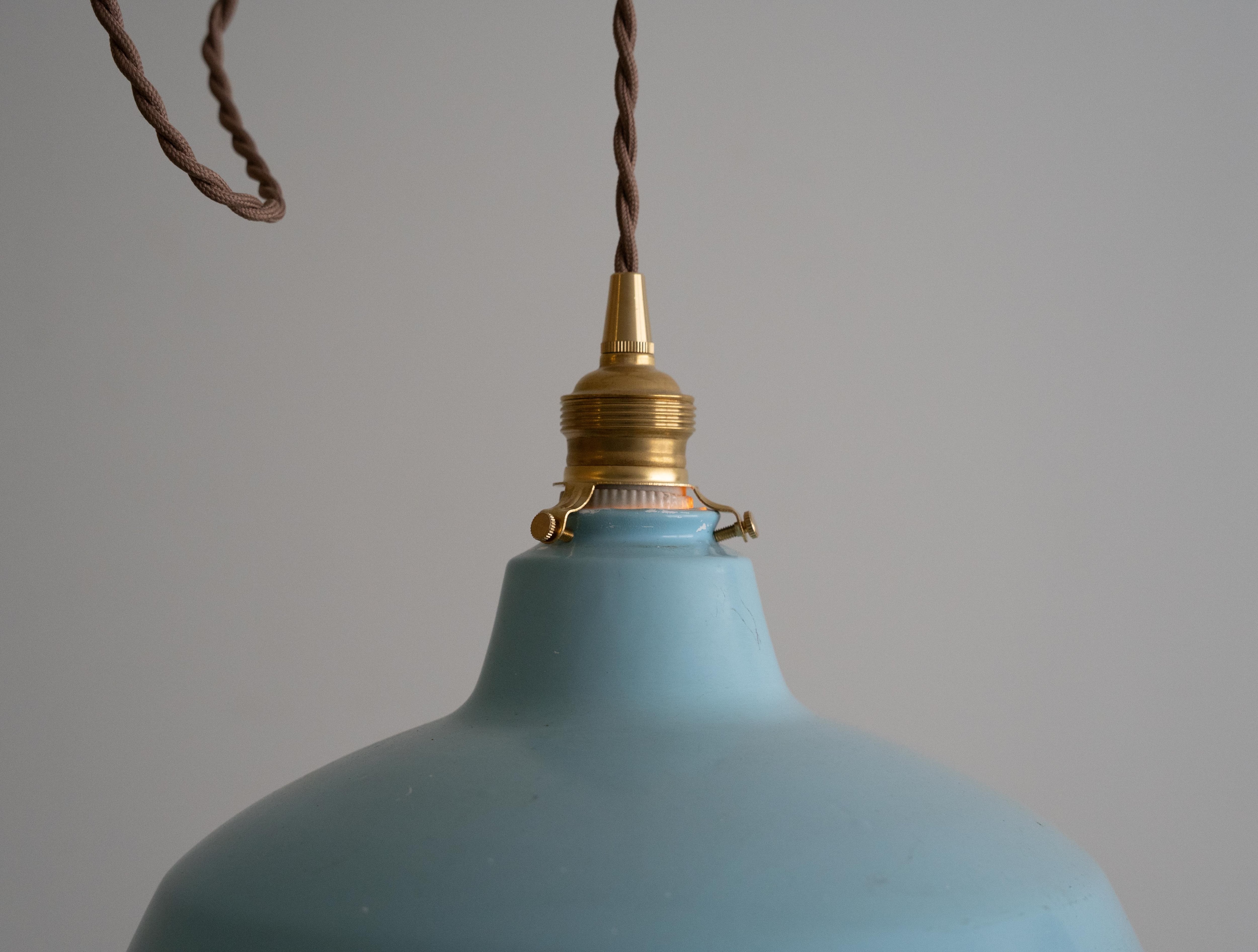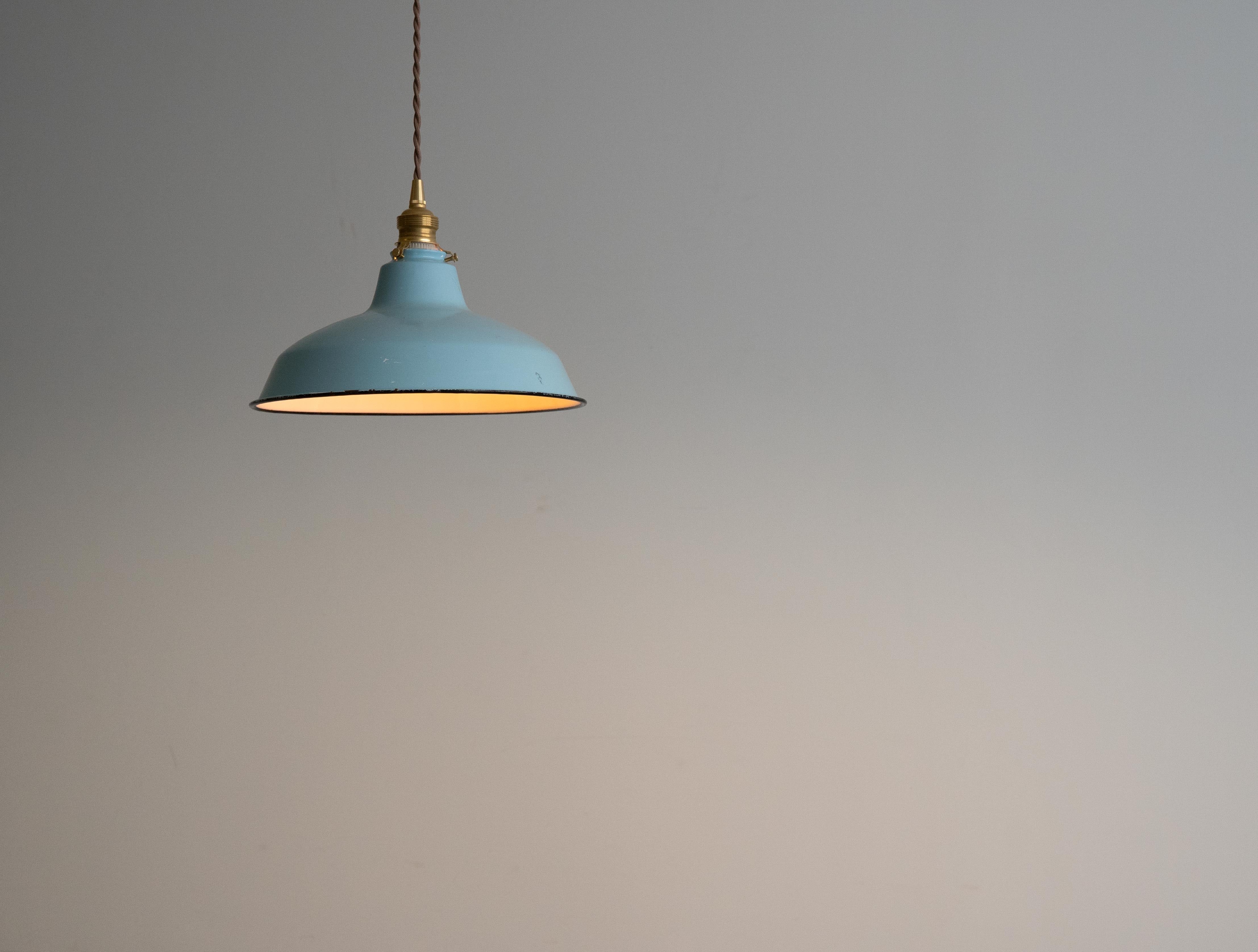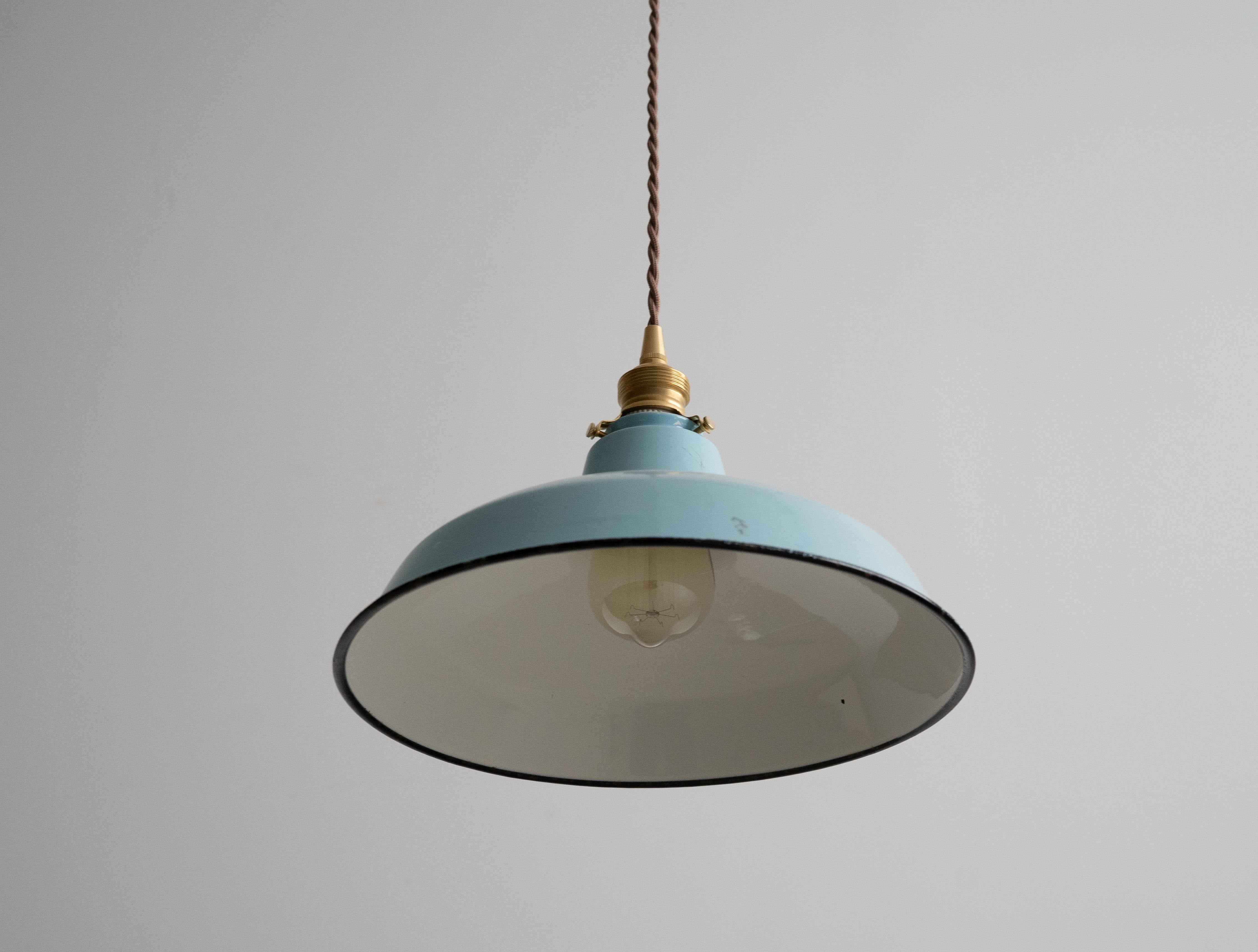 シェードは味わい深い古い琺瑯シェードで、白熱仕様のフィラメント電球、真鍮ソケット、ブラウンのツイストコード、敢えてカバー無しにしたシーリングは全て新調いたしました。