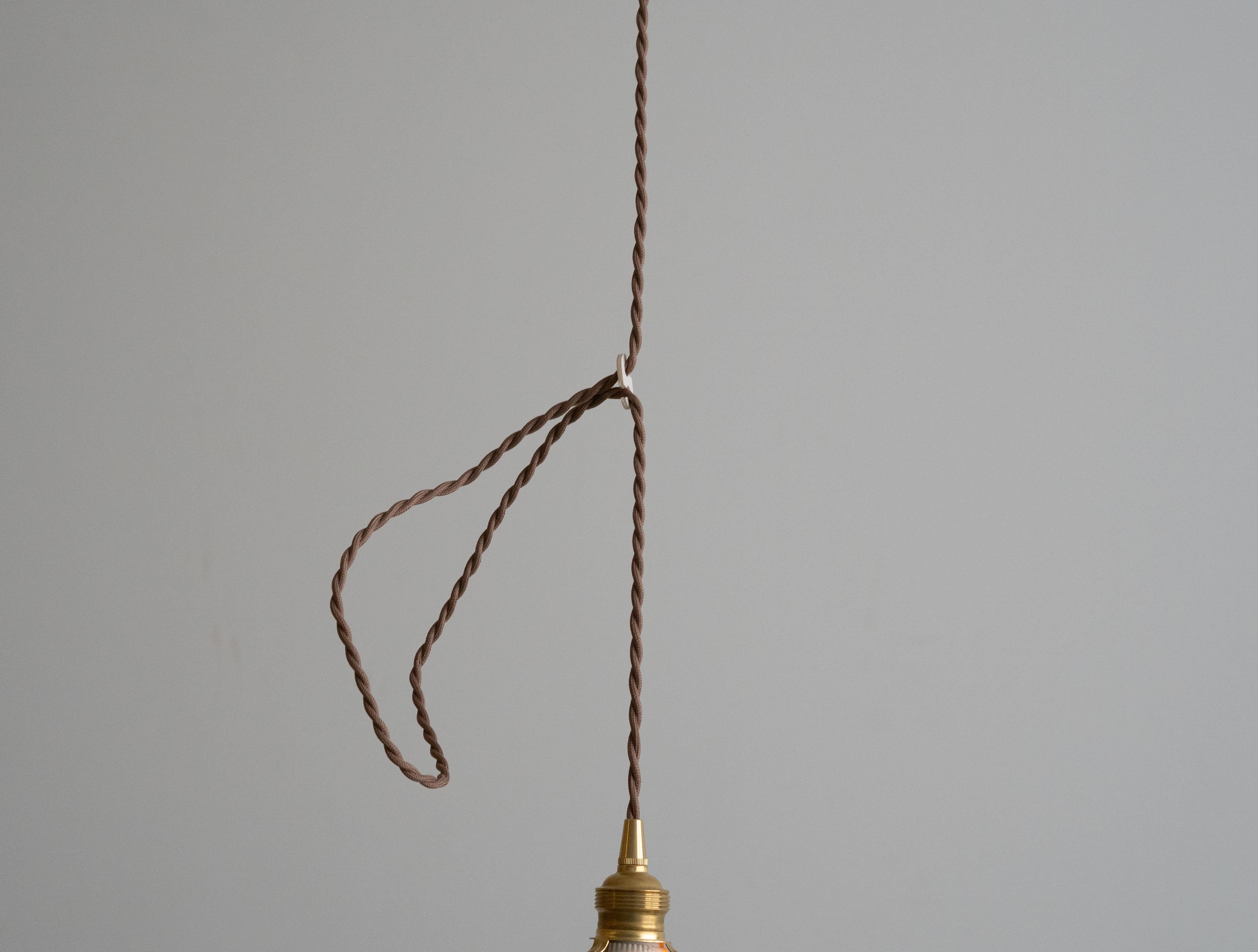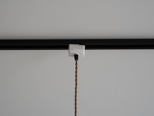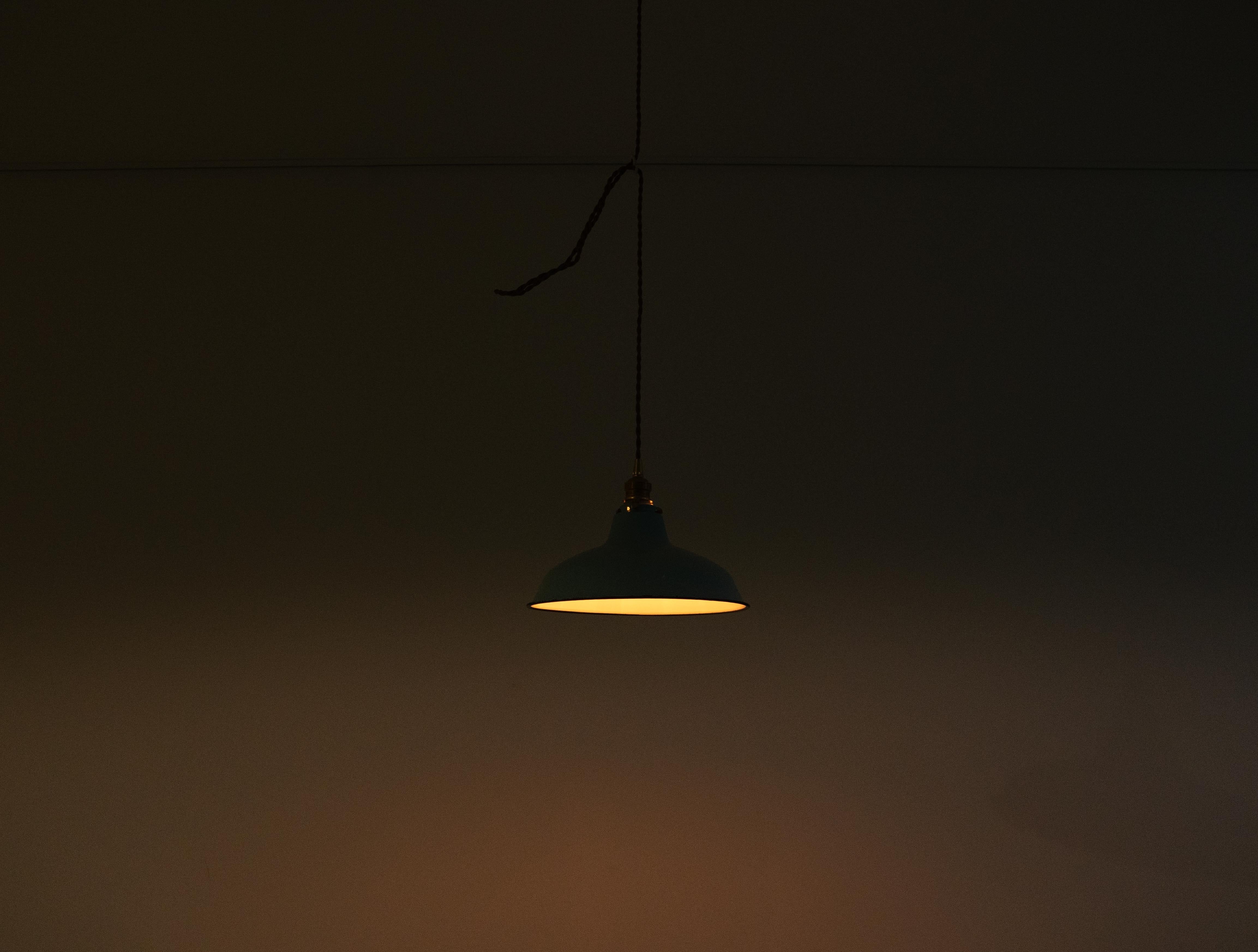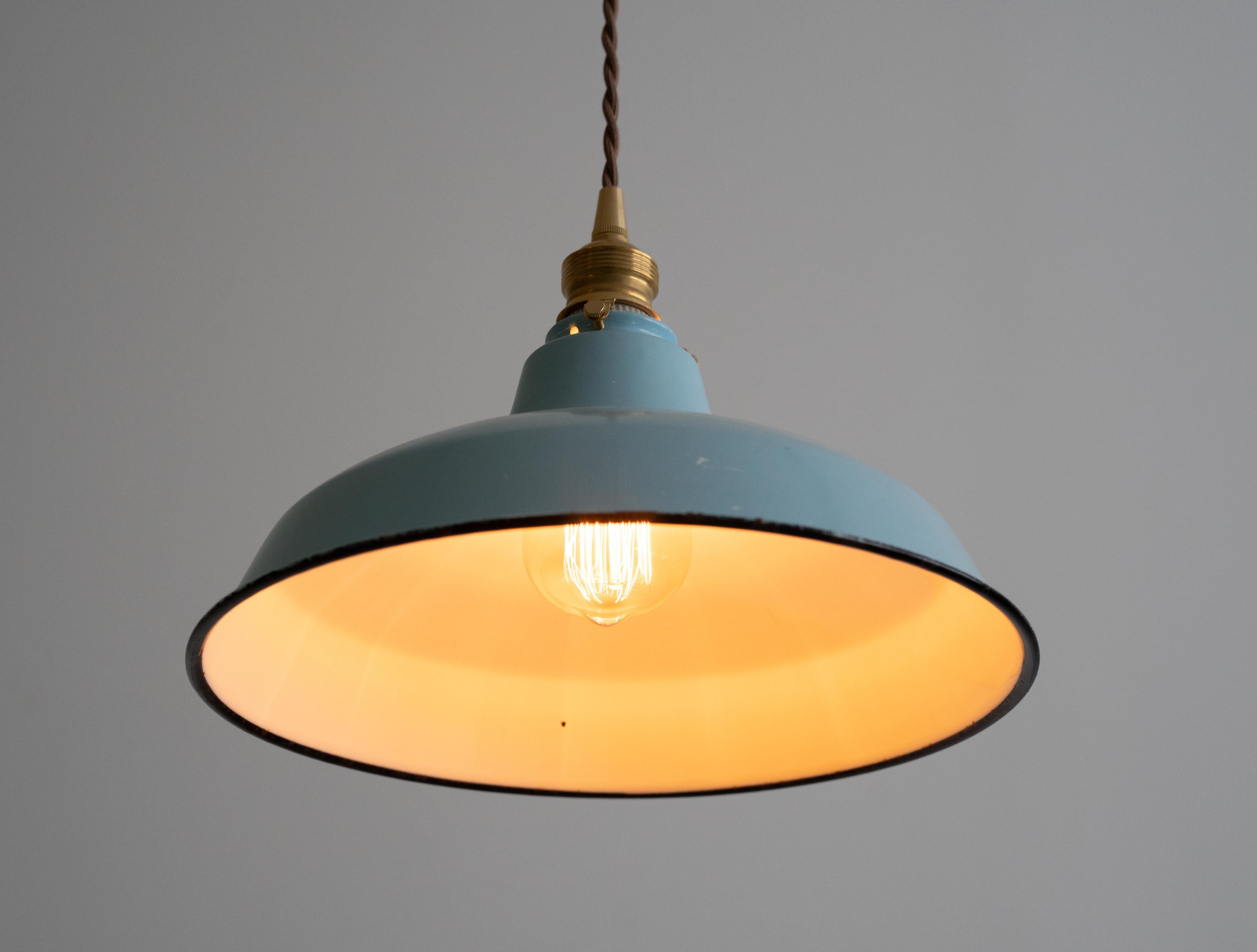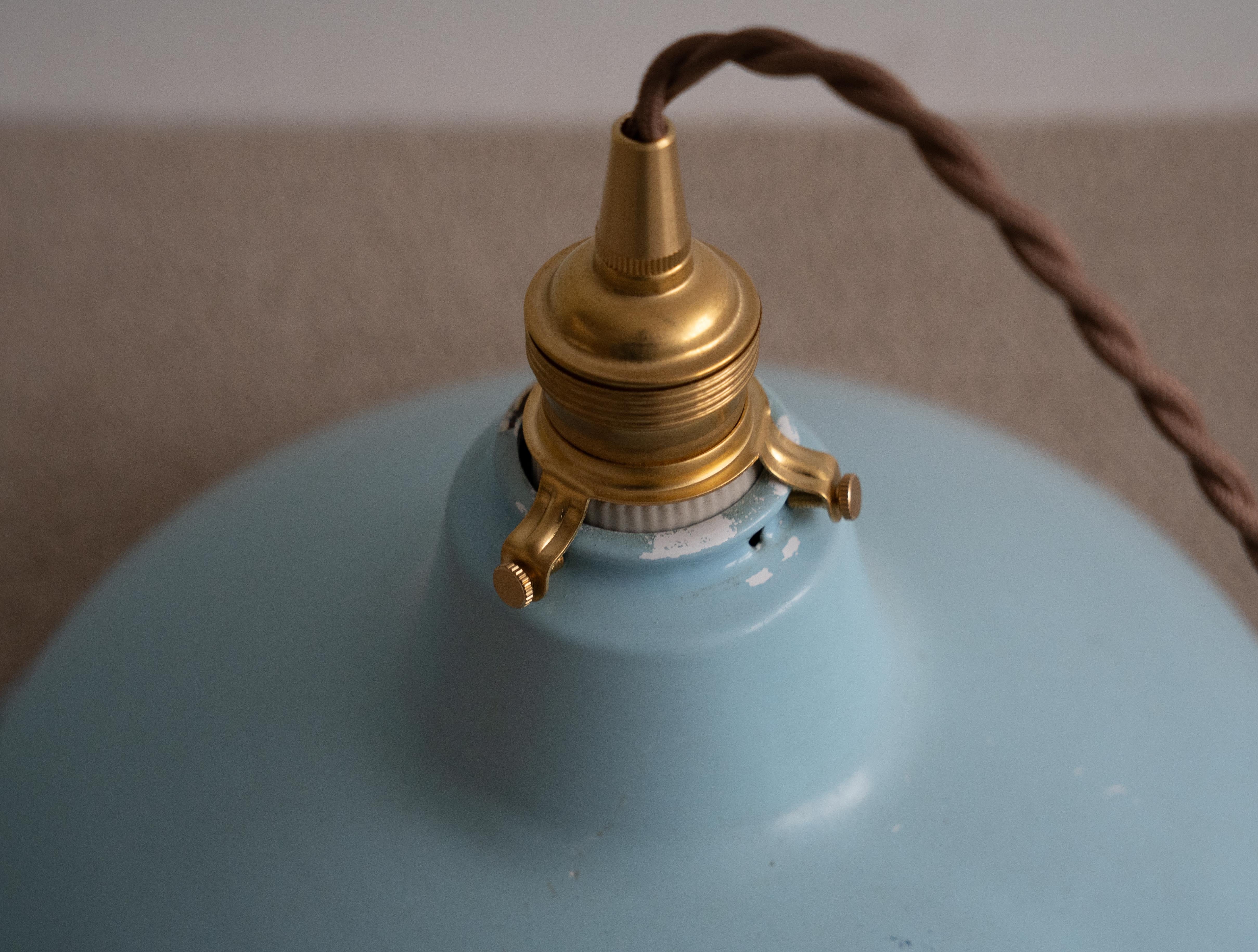 シェードは味わい深い古い琺瑯シェードで、白熱仕様のフィラメント電球、真鍮ソケット、ブラウンのツイストコード、敢えてカバー無しにしたシーリングは全て新調いたしました。
