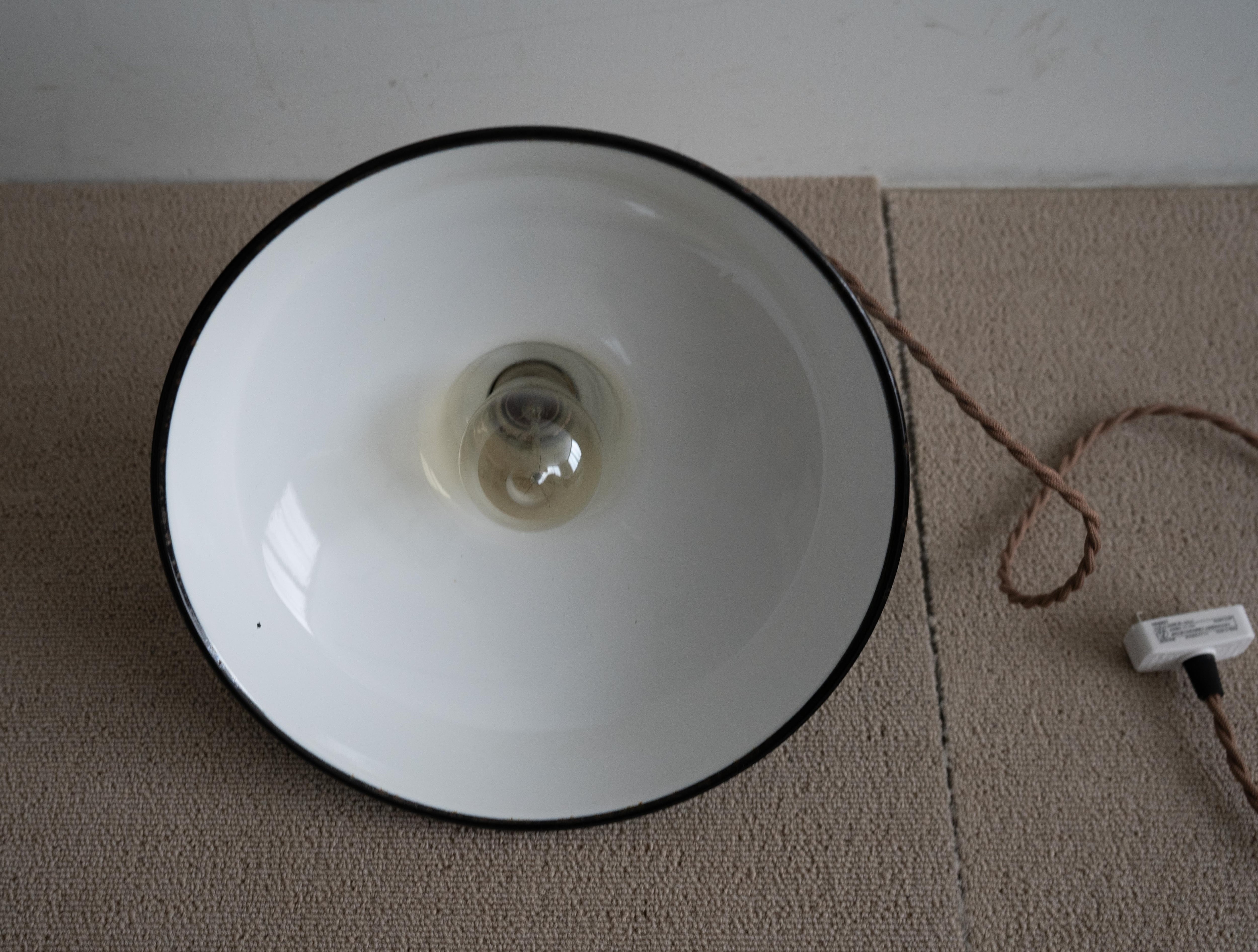 やれたヴィンテージ琺瑯シェードを新品の配線でしつらえたペンダントライト。
