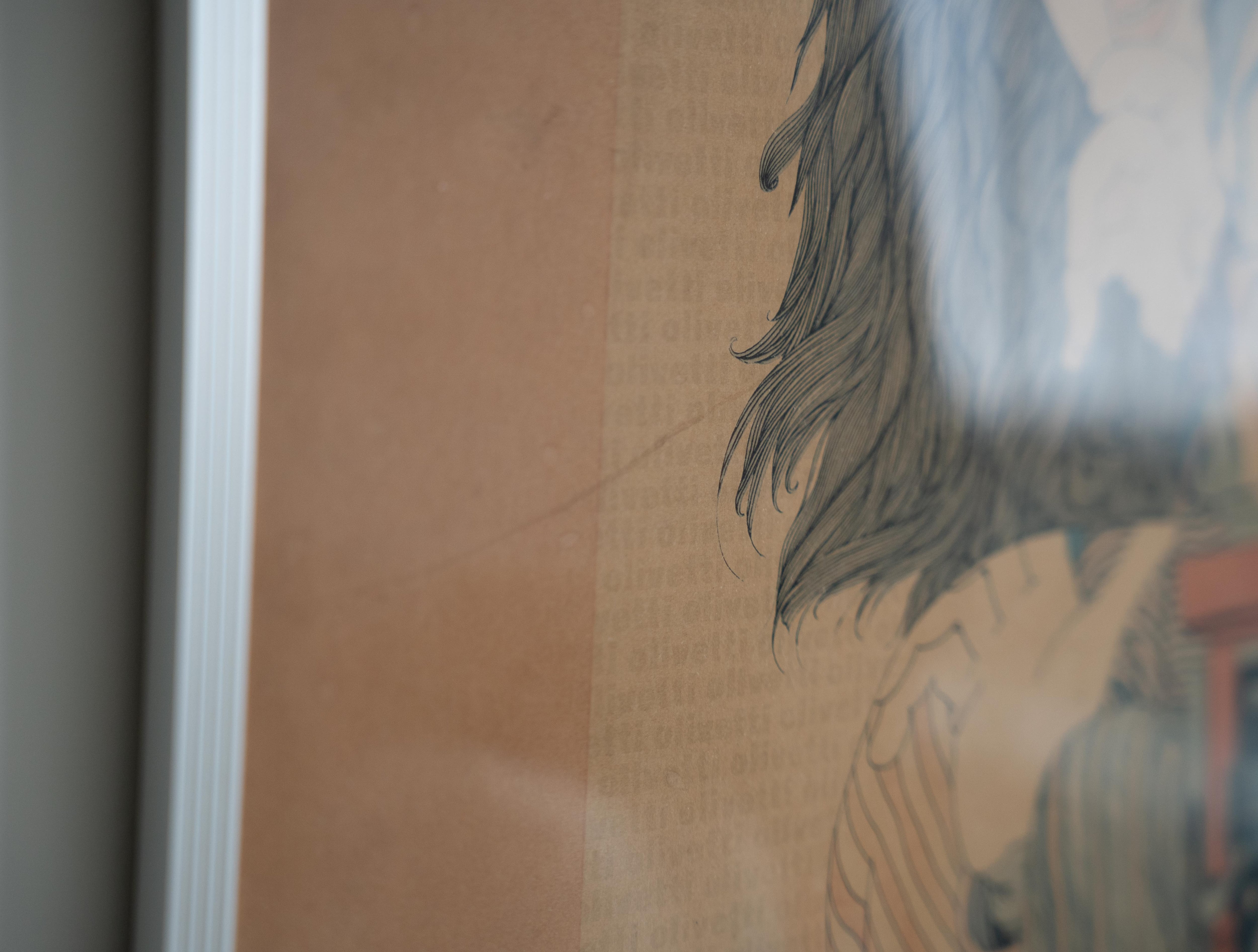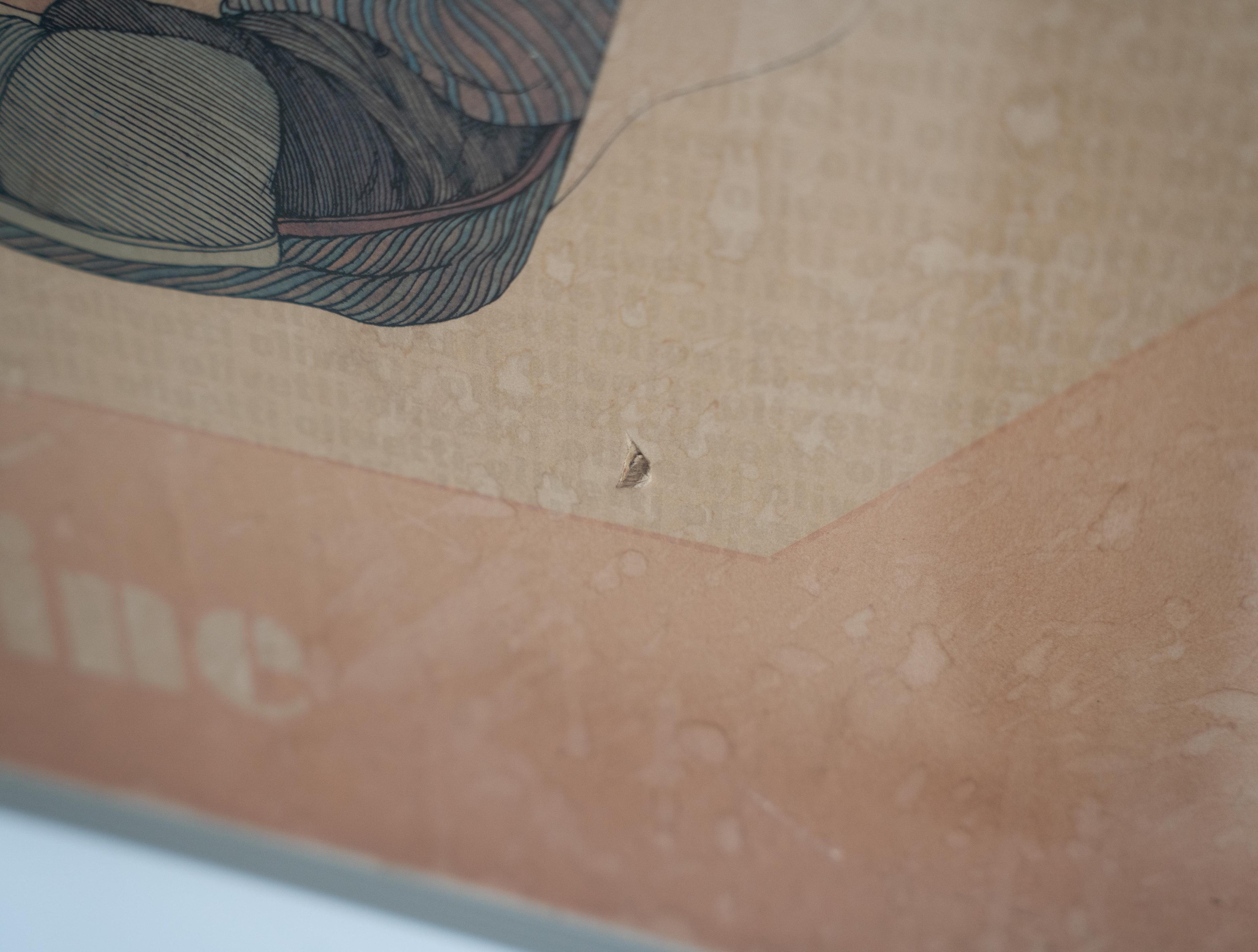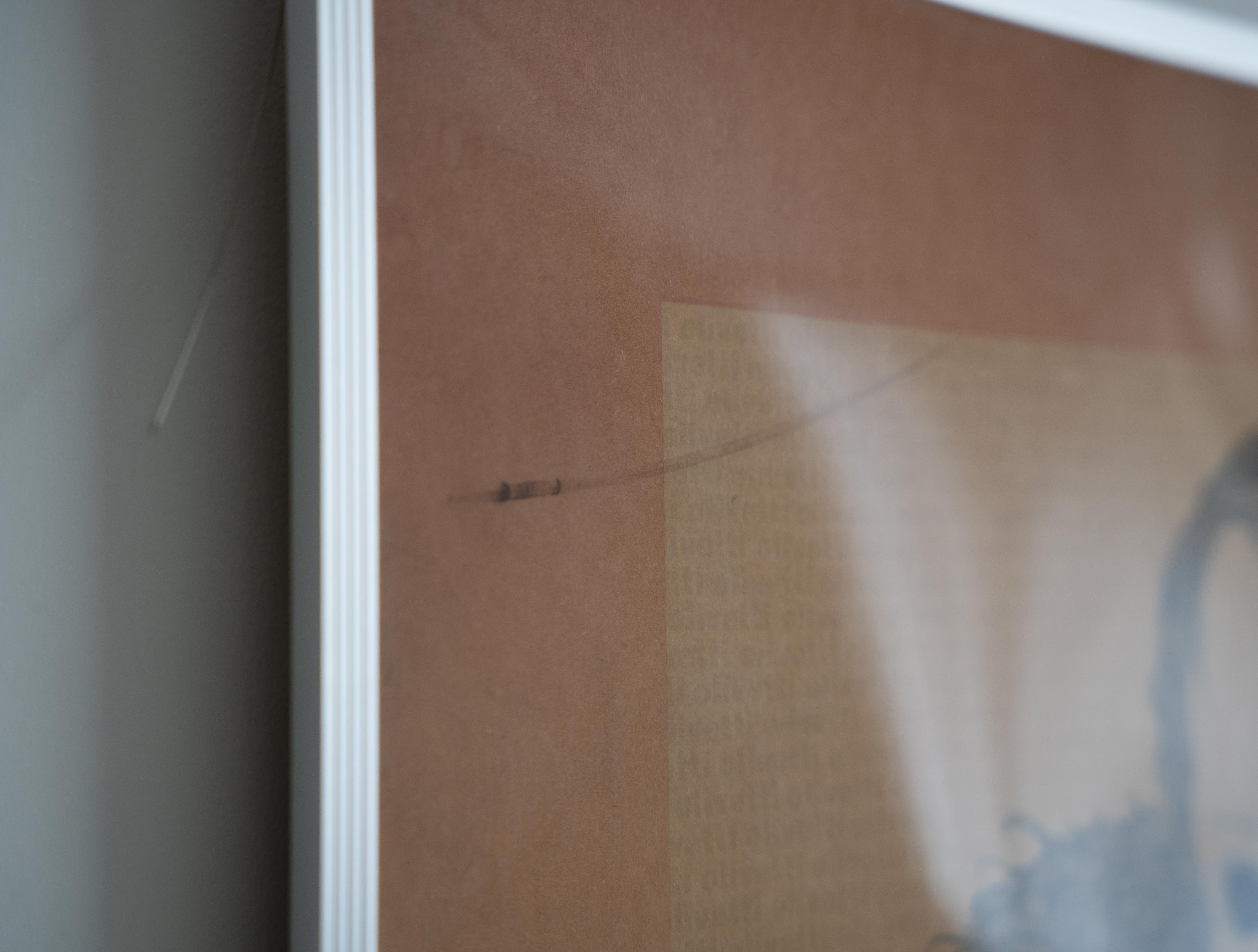 激しく褪色し、元のポスターフレームの裏張りが固着、反り上がった状態の物を新しいポスターフレームに納めたため、全体的に歪んでおり、アクリルが光を乱反射しておりますので画像にてご確認ください。