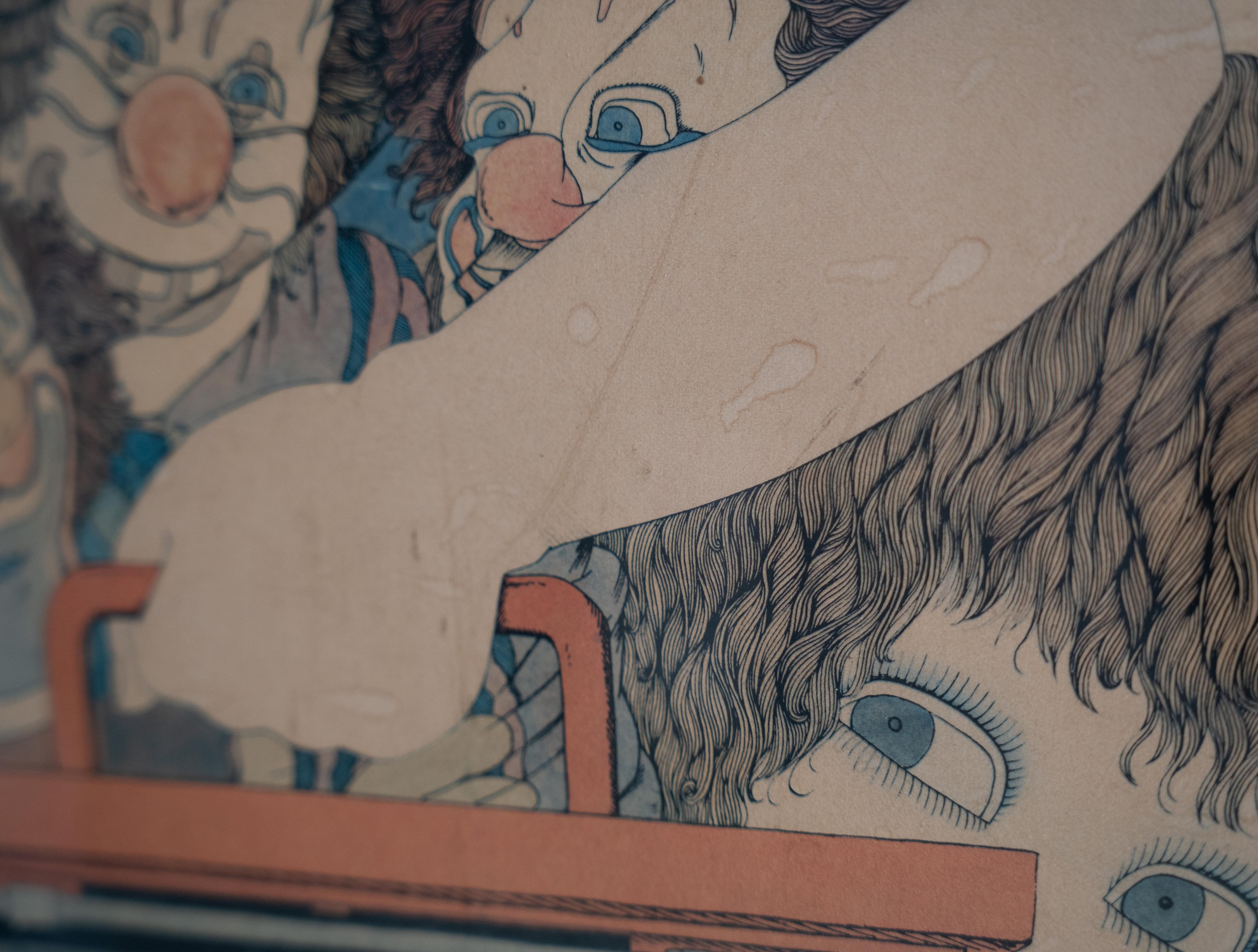 赤いタイプライターを中心に、幻想的な人物たちが重なる独特の構図は、伊坂芳太良ならではの詩的で繊細な世界観を感じさせます。