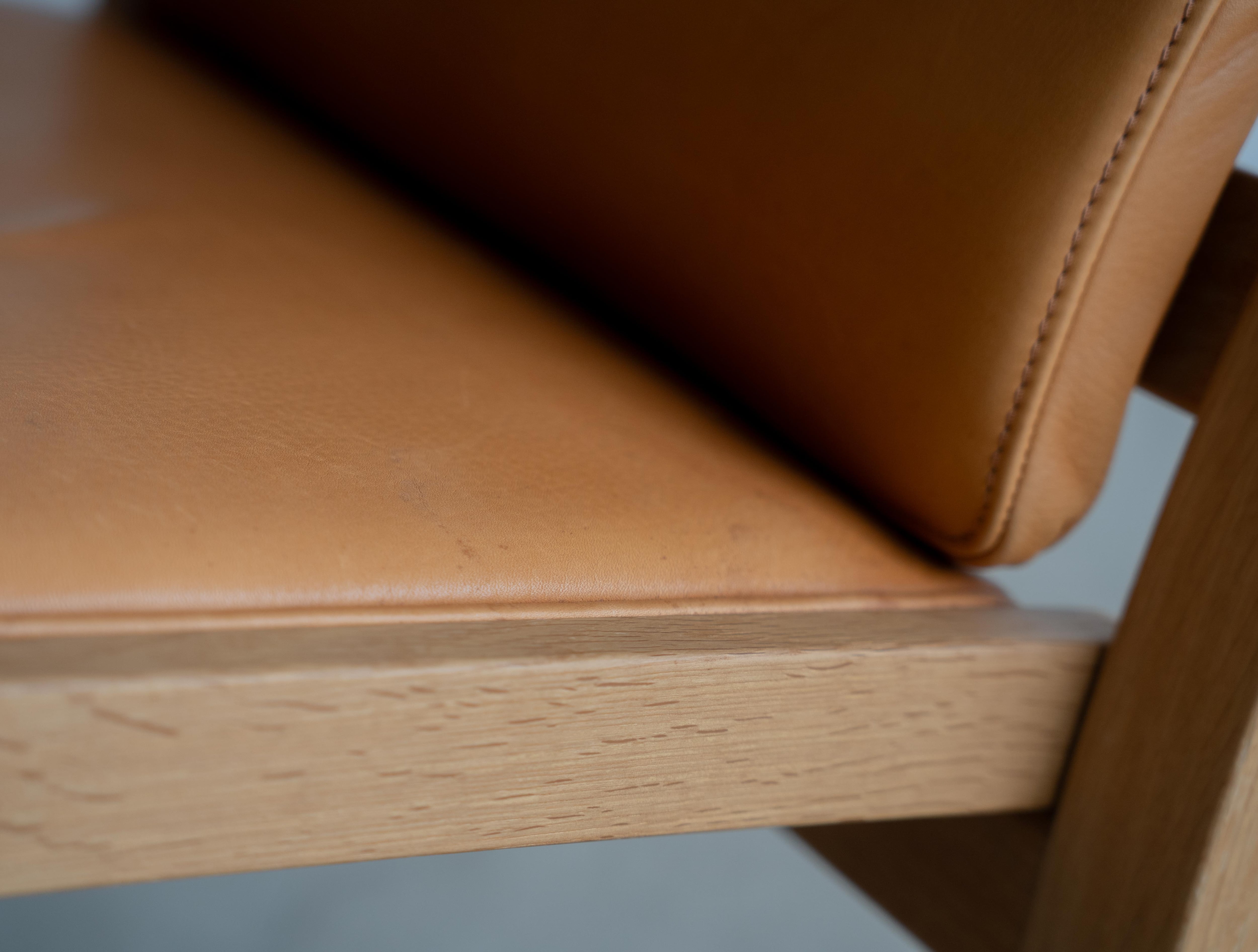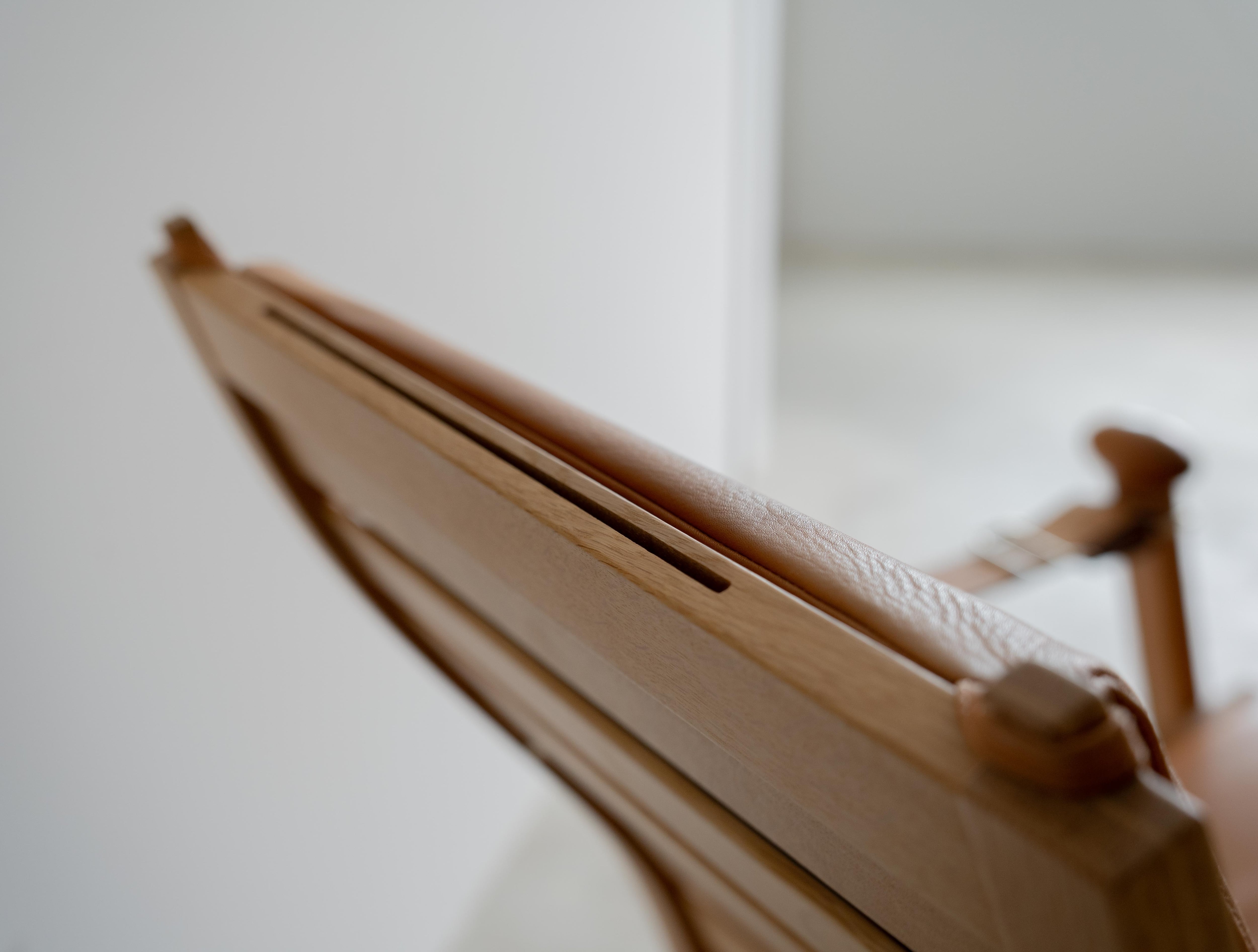 ユニークなアームの握りや、北海道産のナラ材を使用したフレームなど、計算し尽くされ座る人を最優先に想ったデザインになっています。