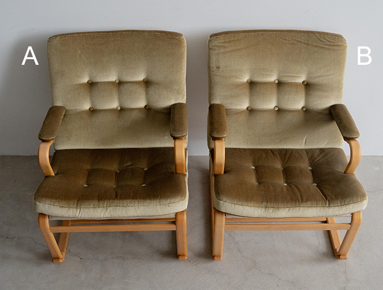 クッションファブリックに経年による褪色がありますが、ヴィンテージならではの風合いとしてご使用いただけます。フレーム部分は使用感が少なく、座り心地も違和感なく快適な座り心地です。
