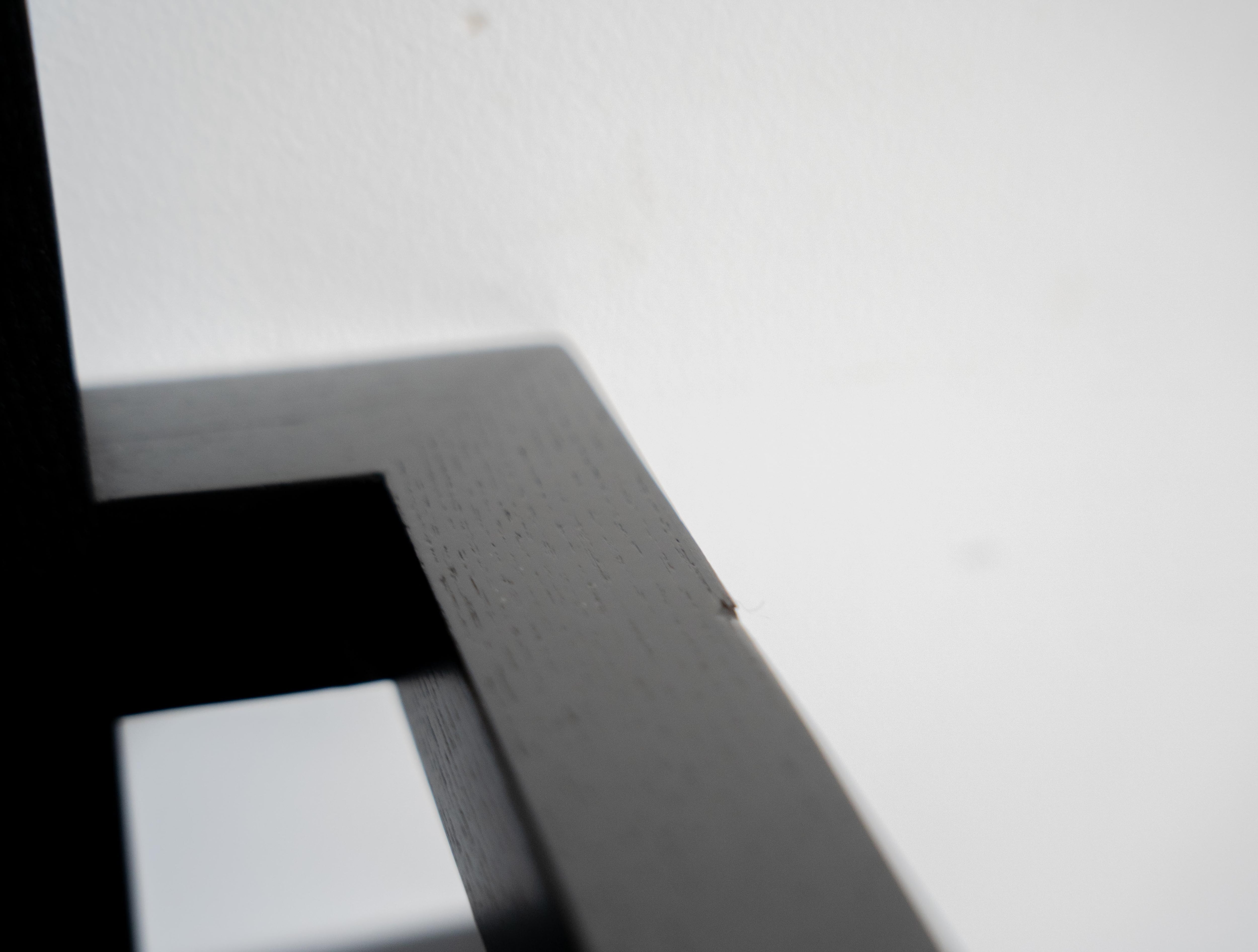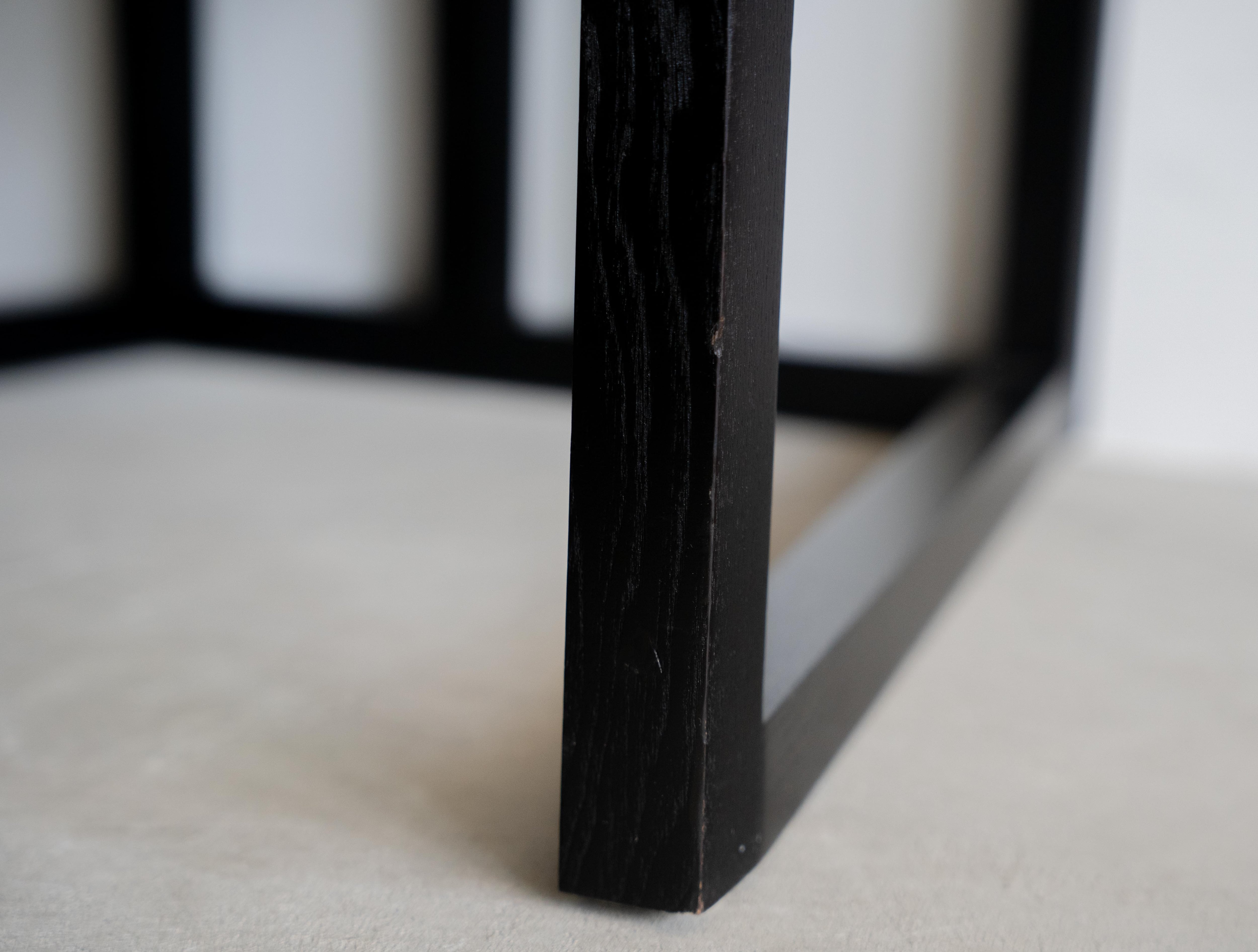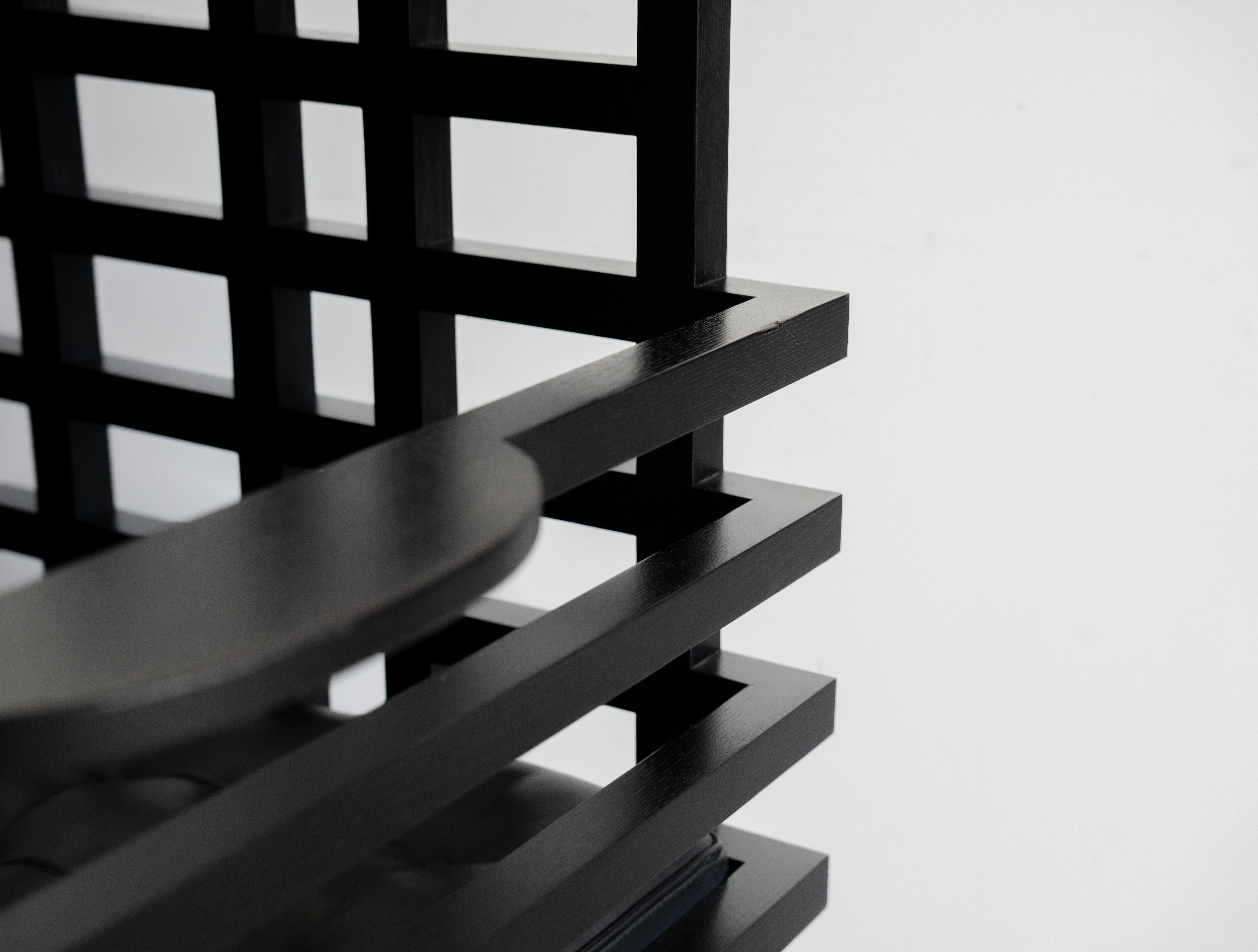 また、ボリューム感のあるレザークッションはボタン留めの装飾がされておりモダンな印象が重厚感を和らげ、木製の黒染めフレームは垂直・水平で構成されることで洗練された空間を演出します。