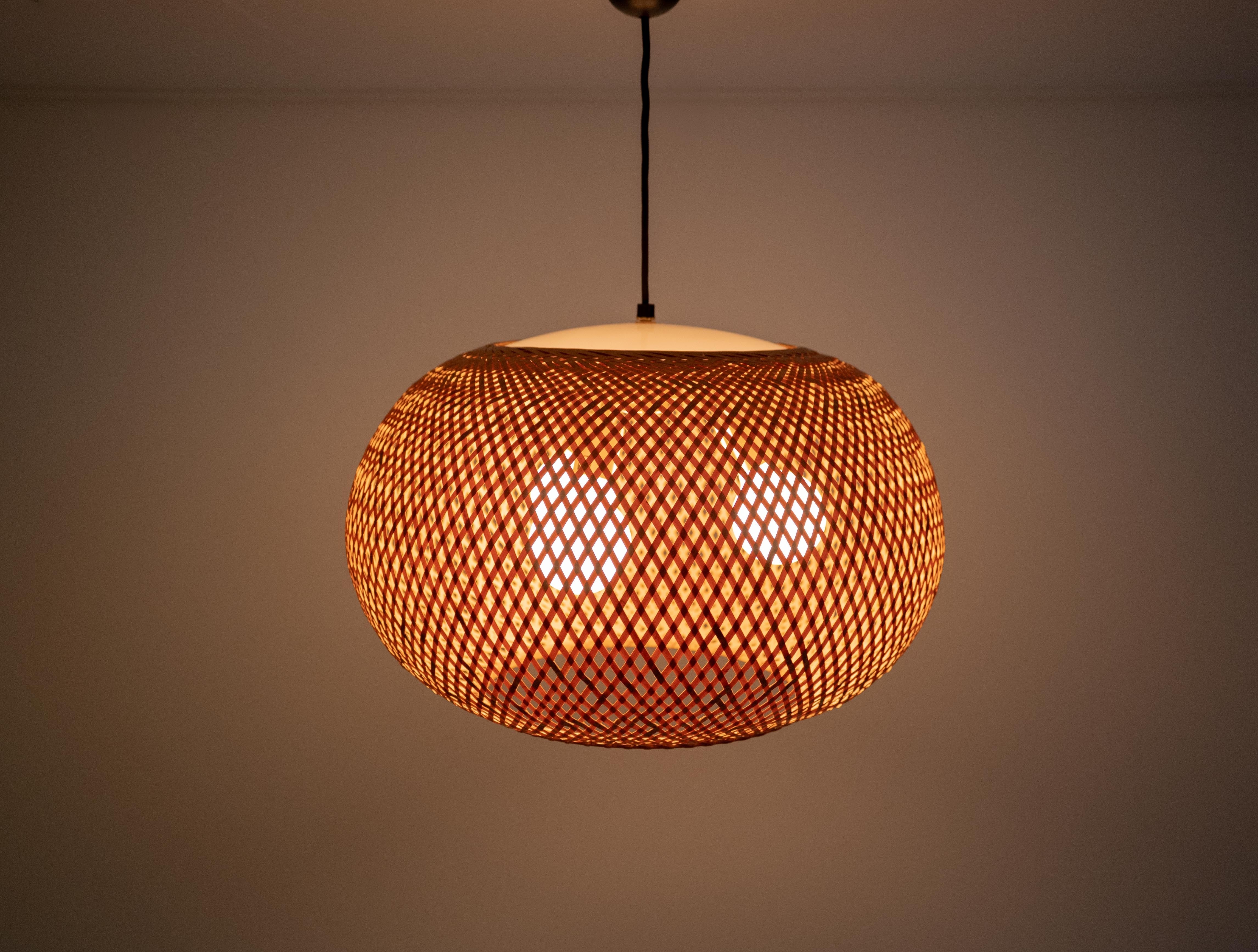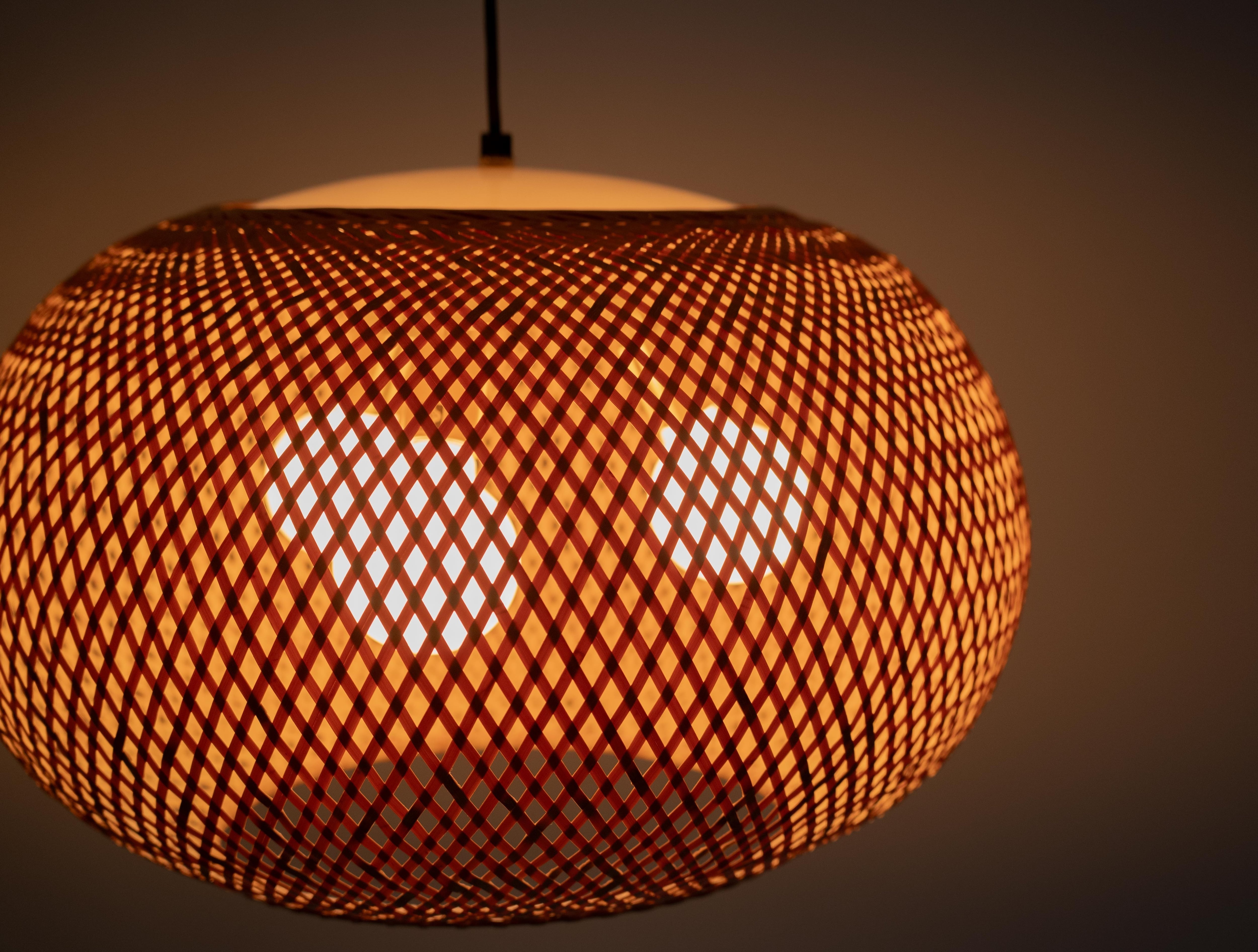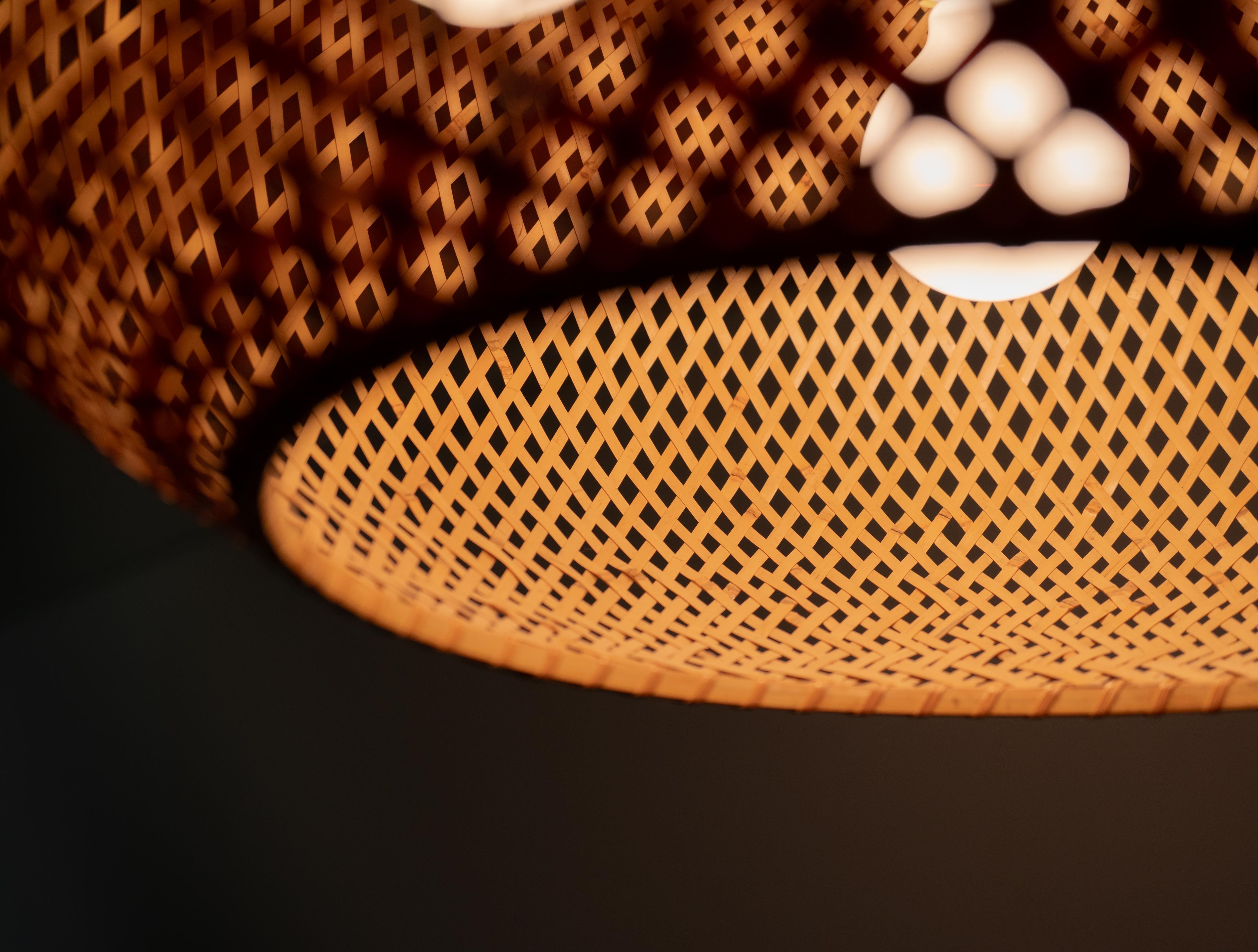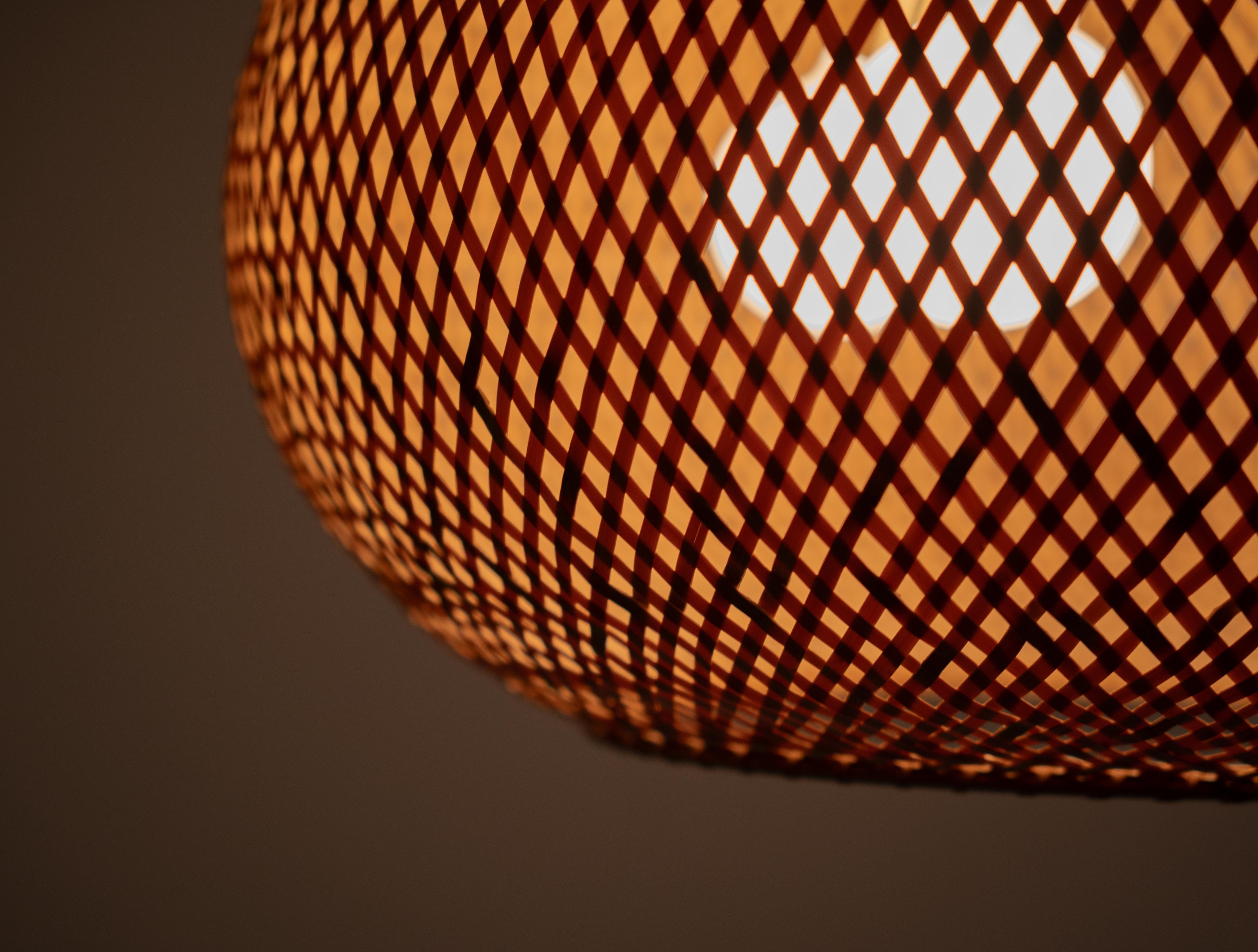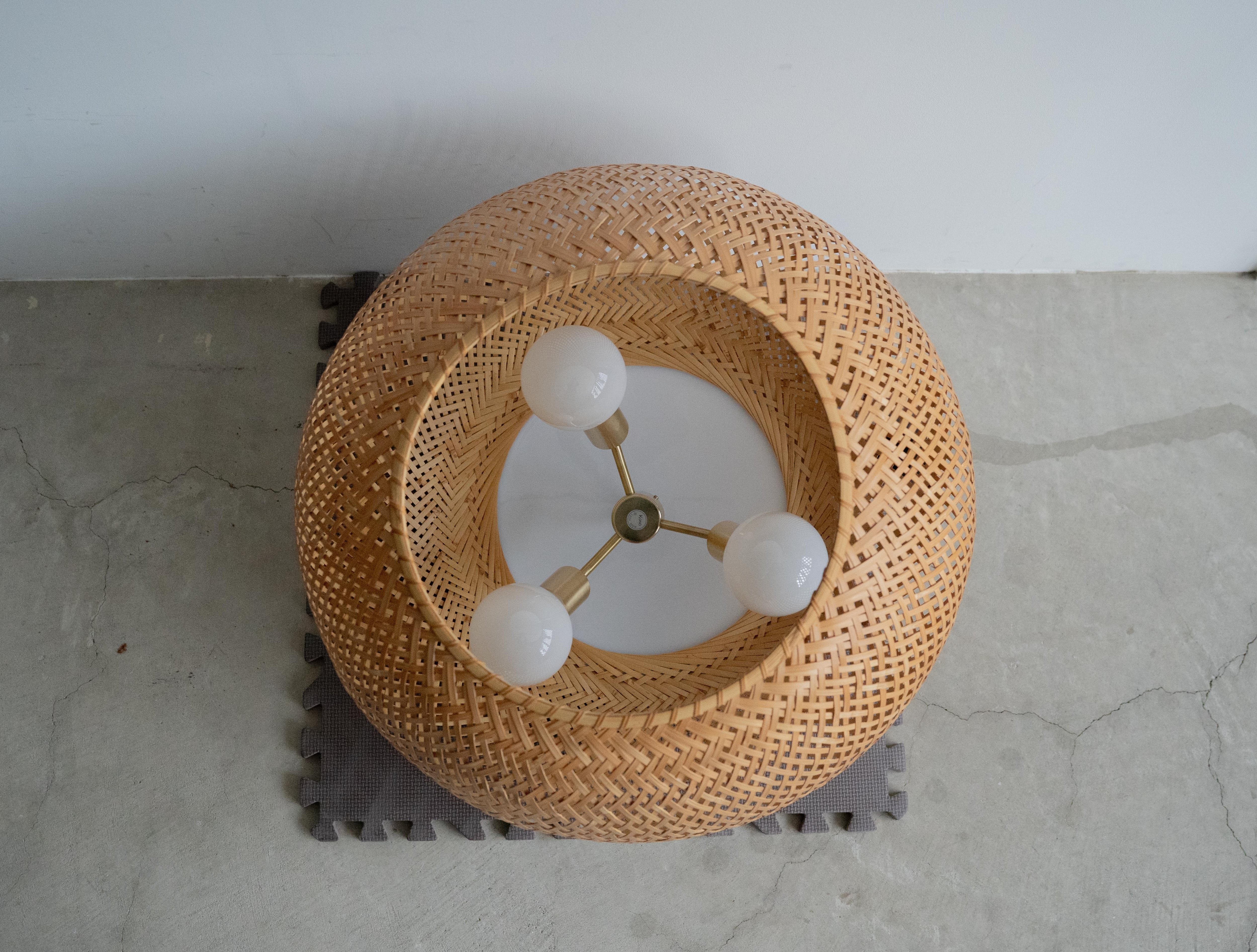 特徴的なのは、四つ目編みで構成された竹と成型アクリルによる一体型のシェード。