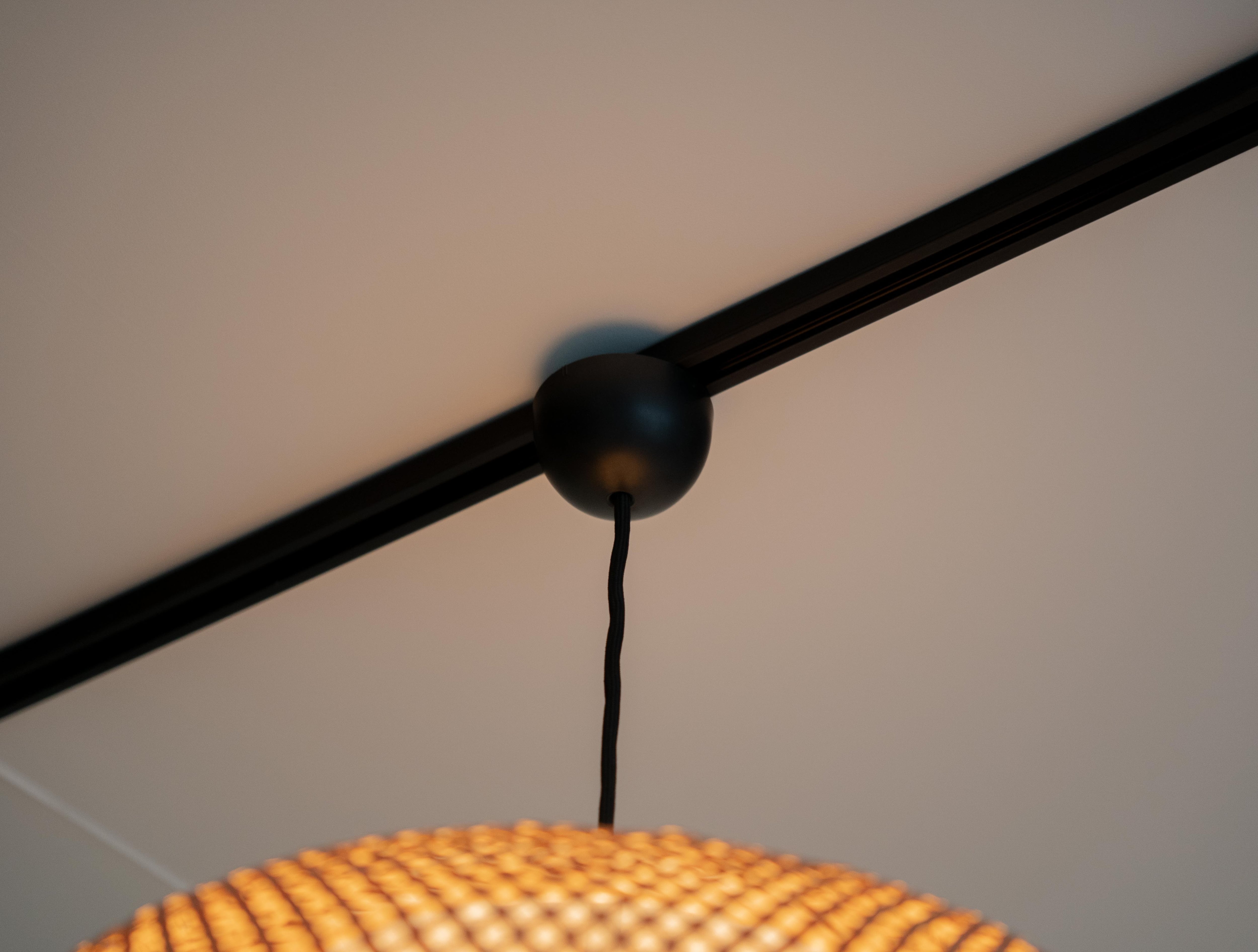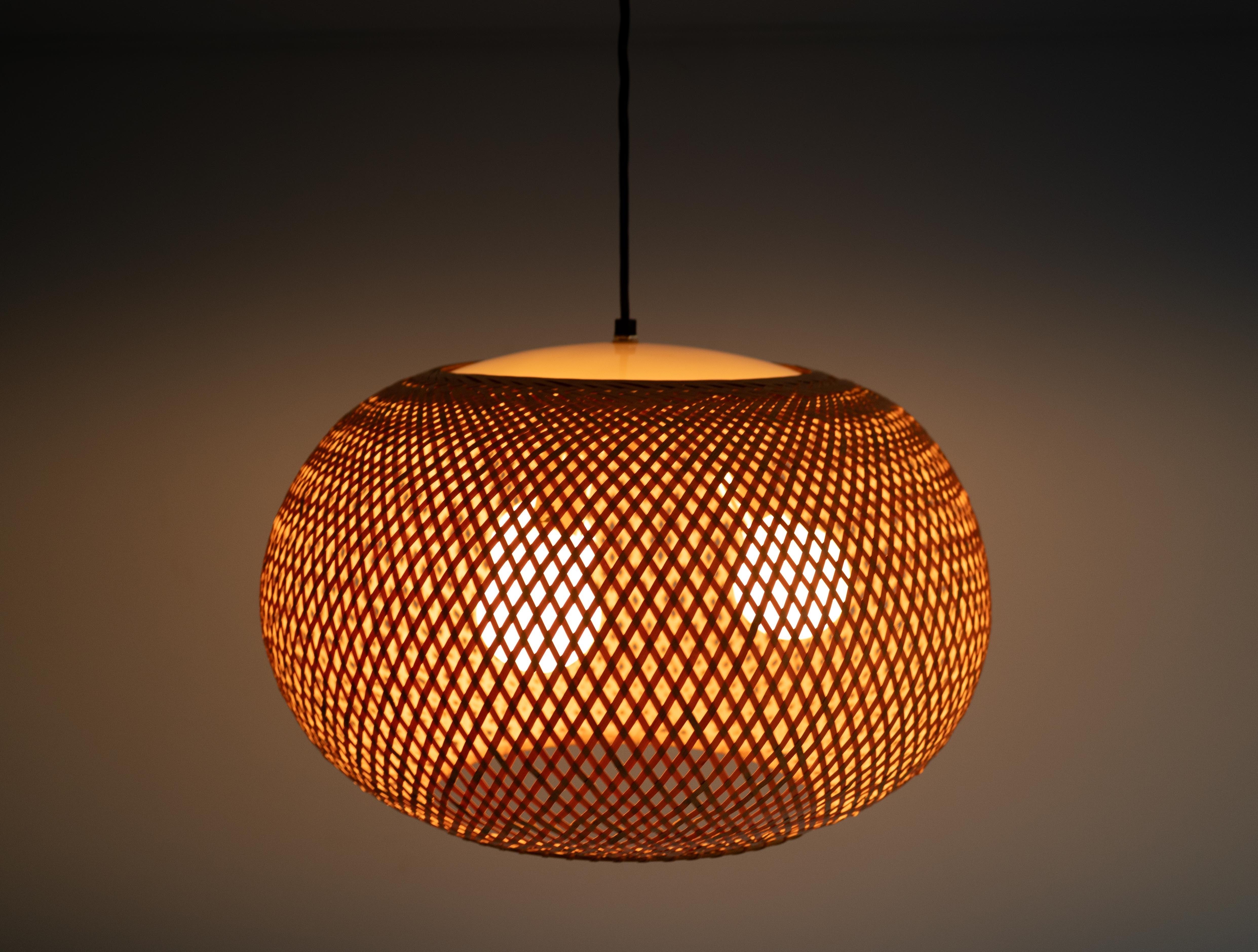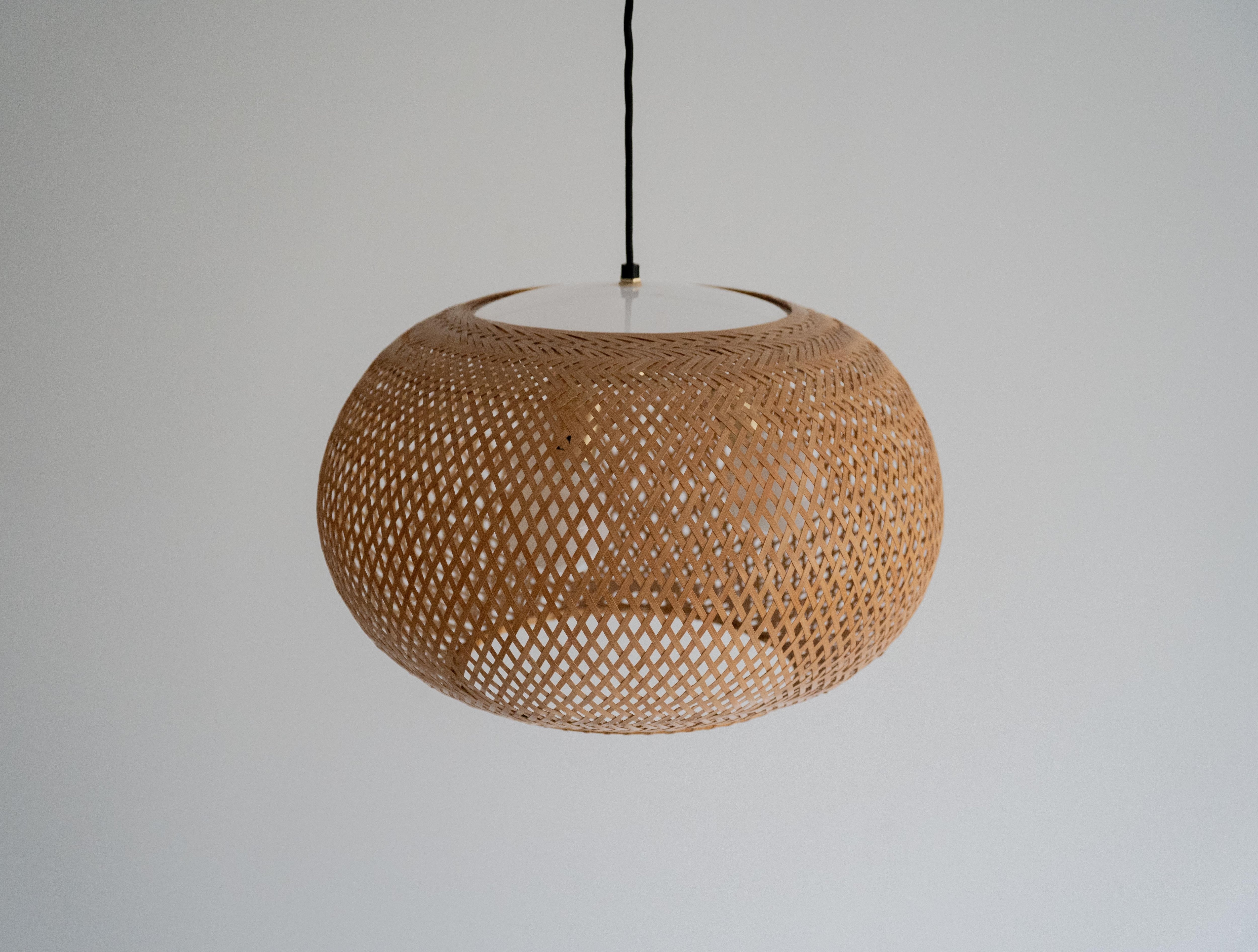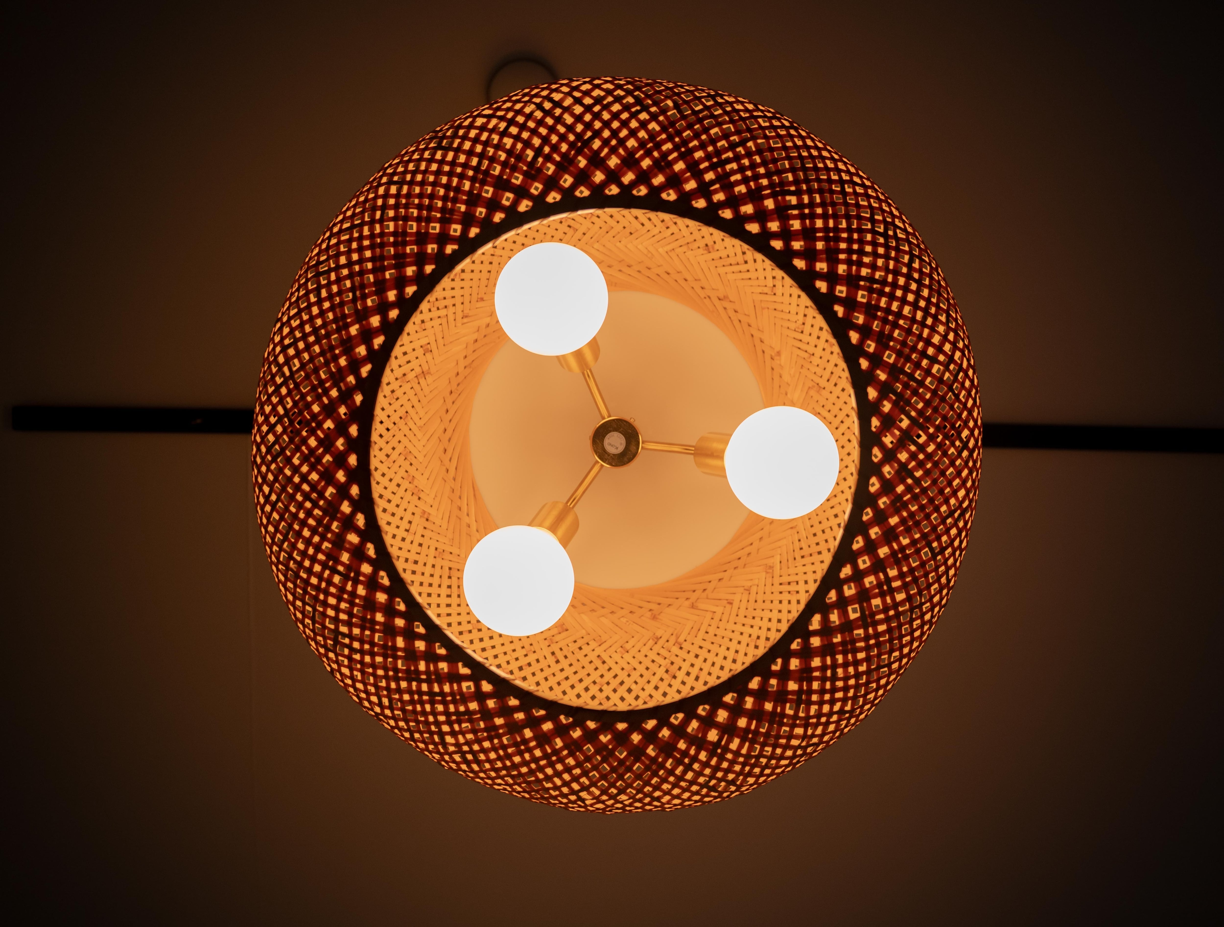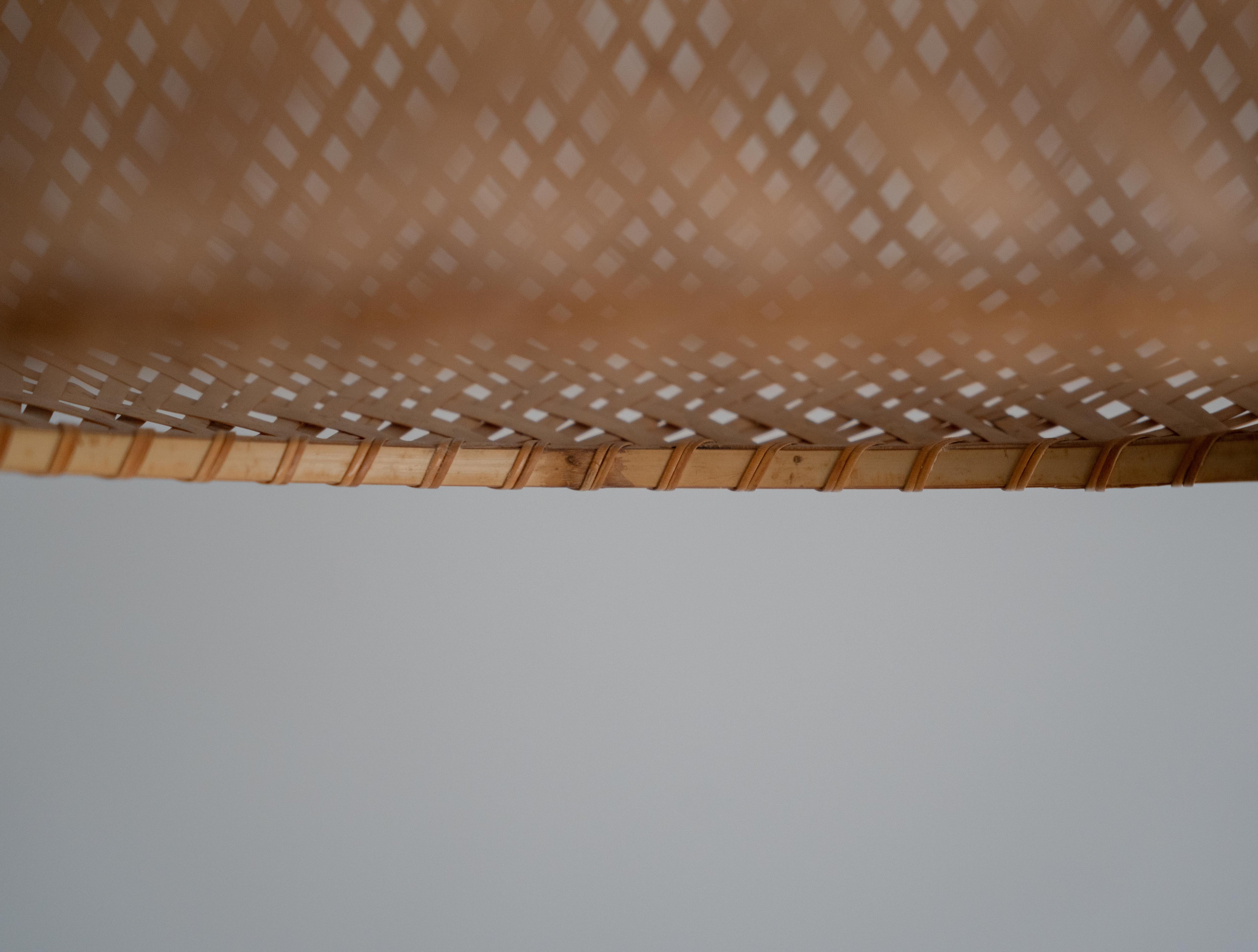 特徴的なのは、四つ目編みで構成された竹と成型アクリルによる一体型のシェード。