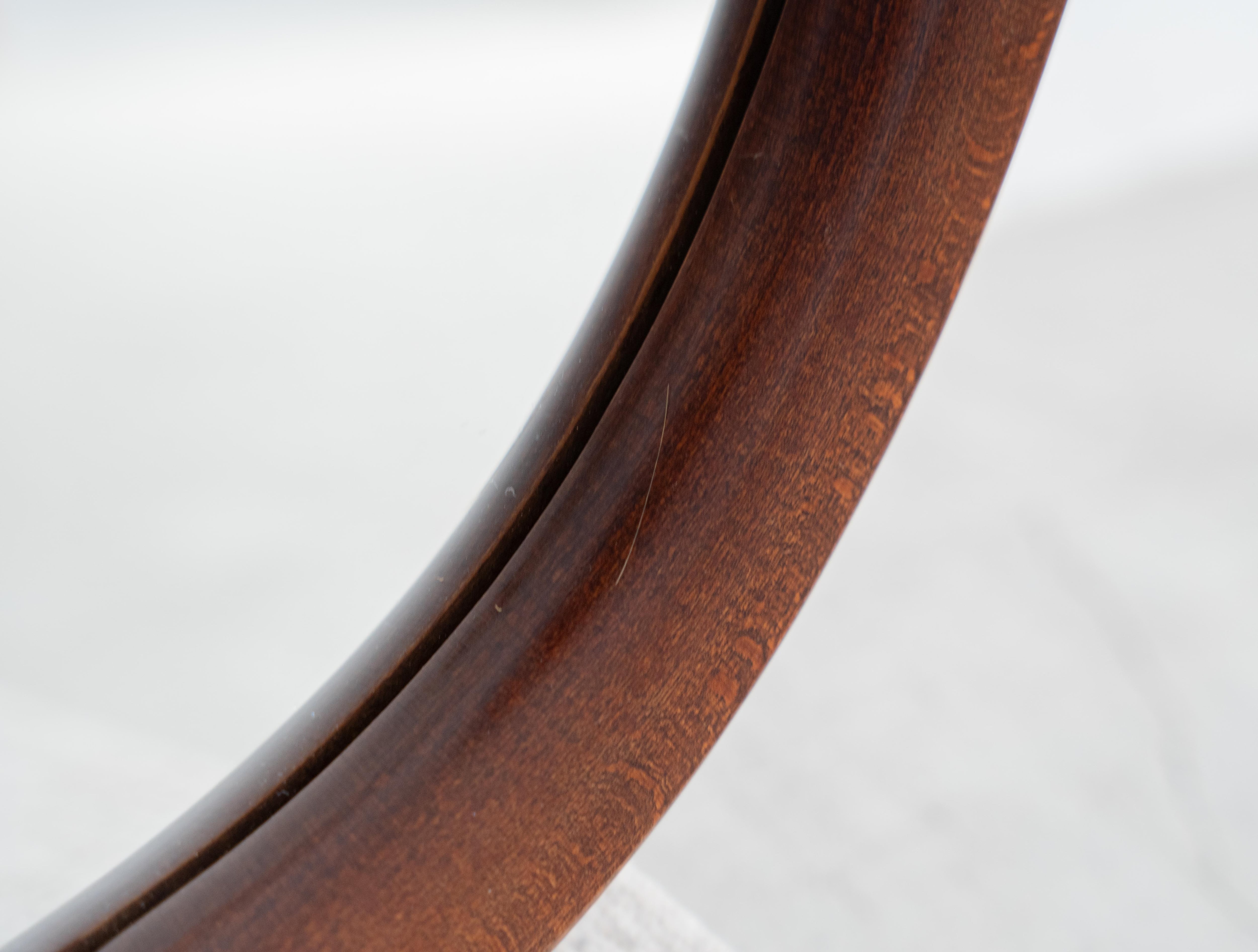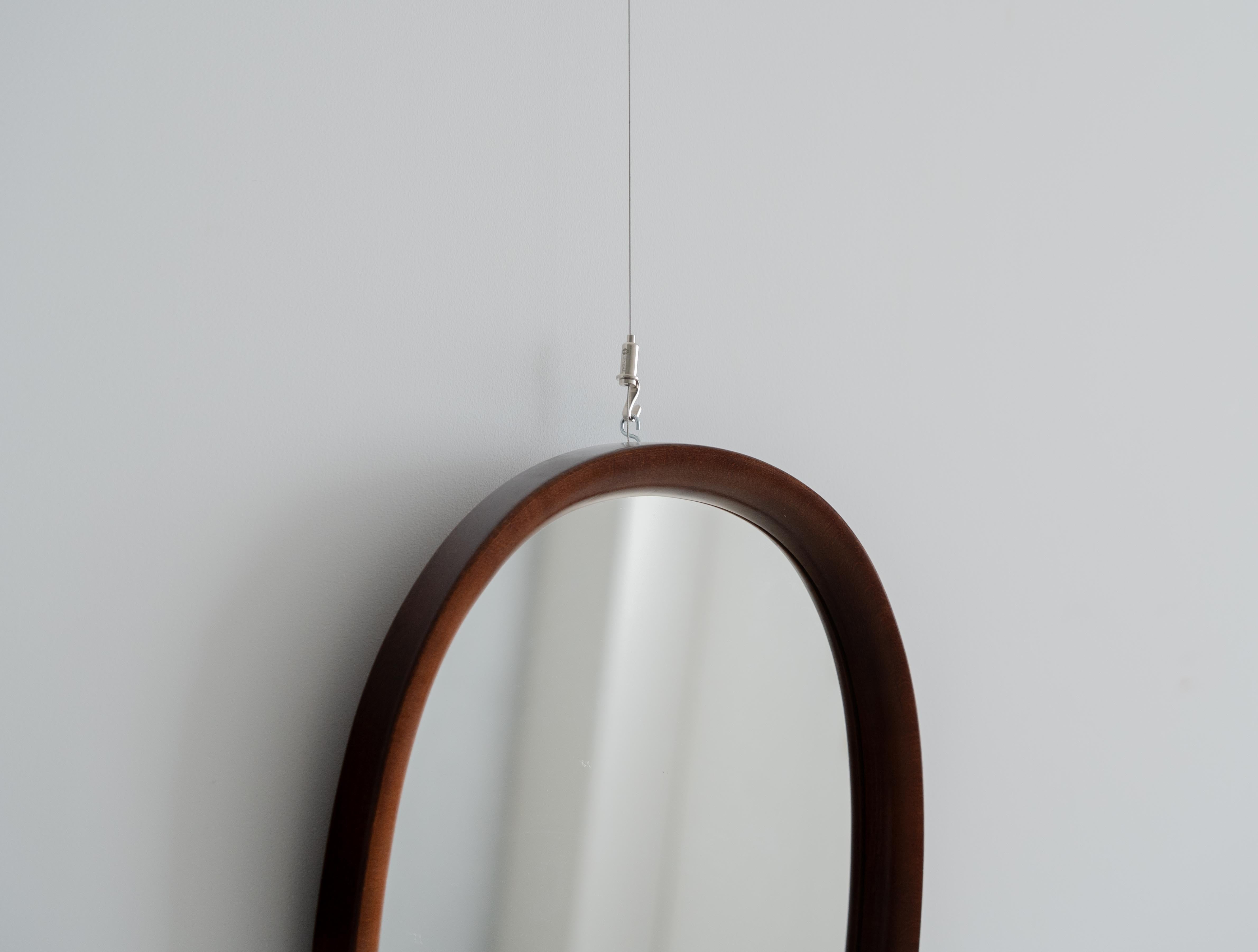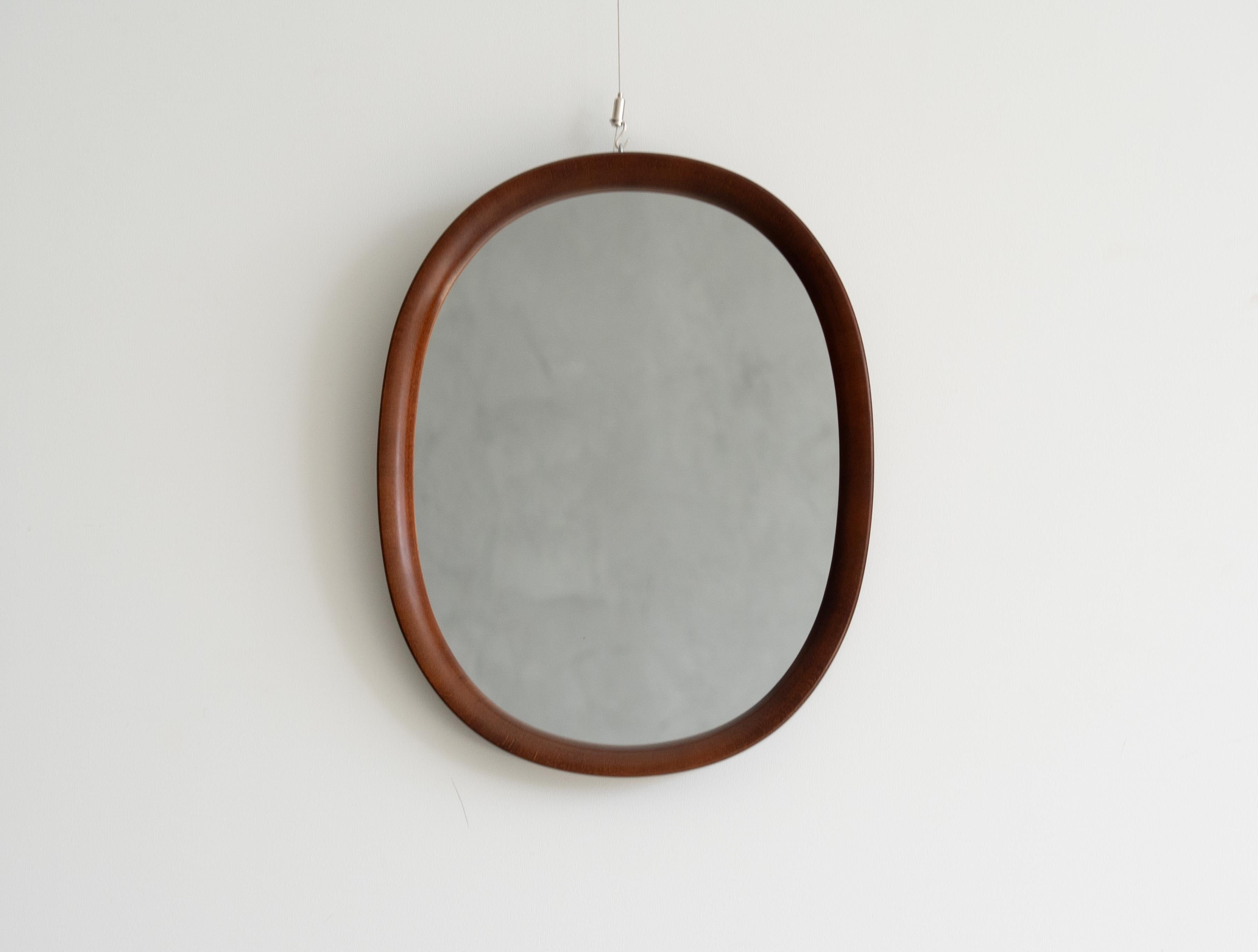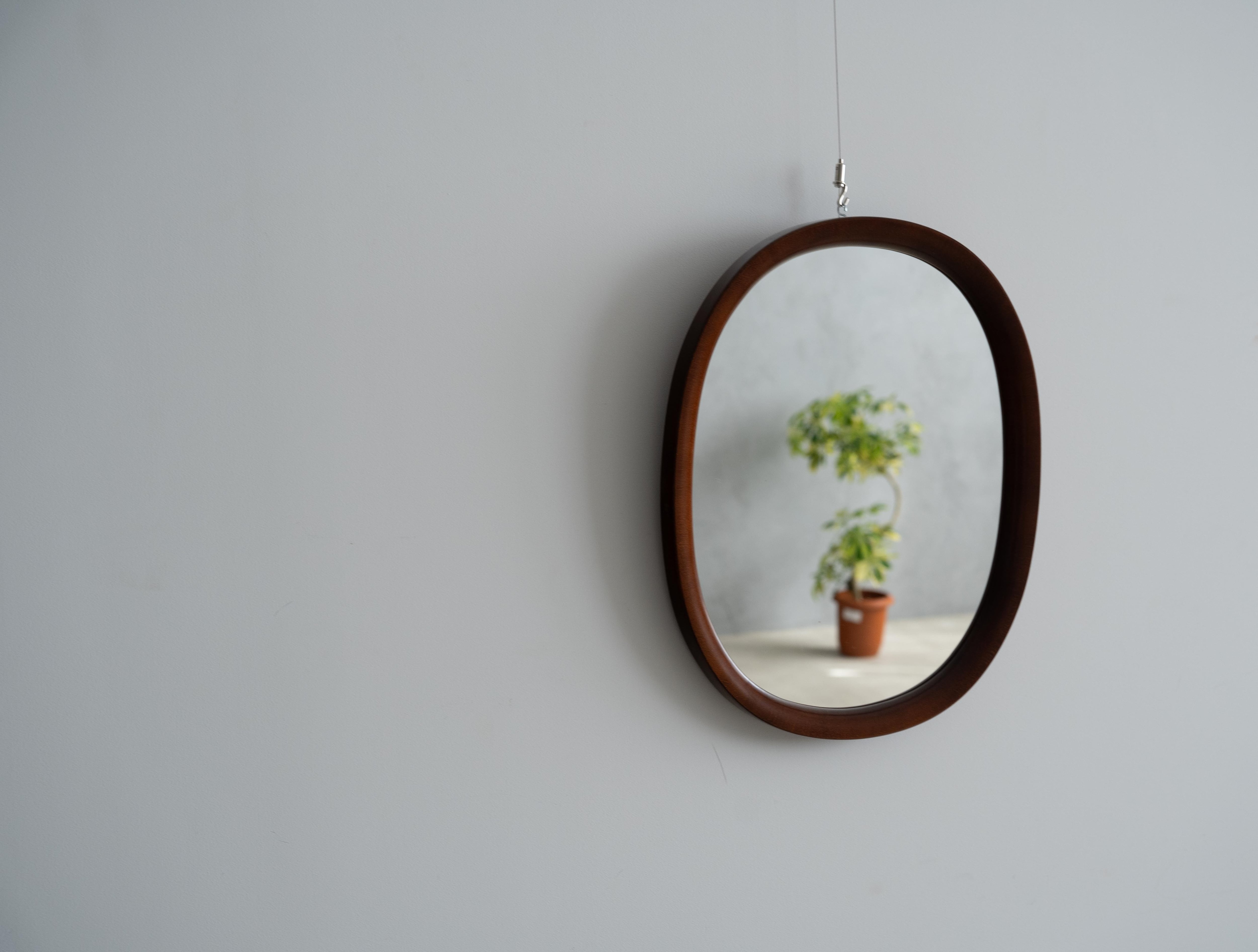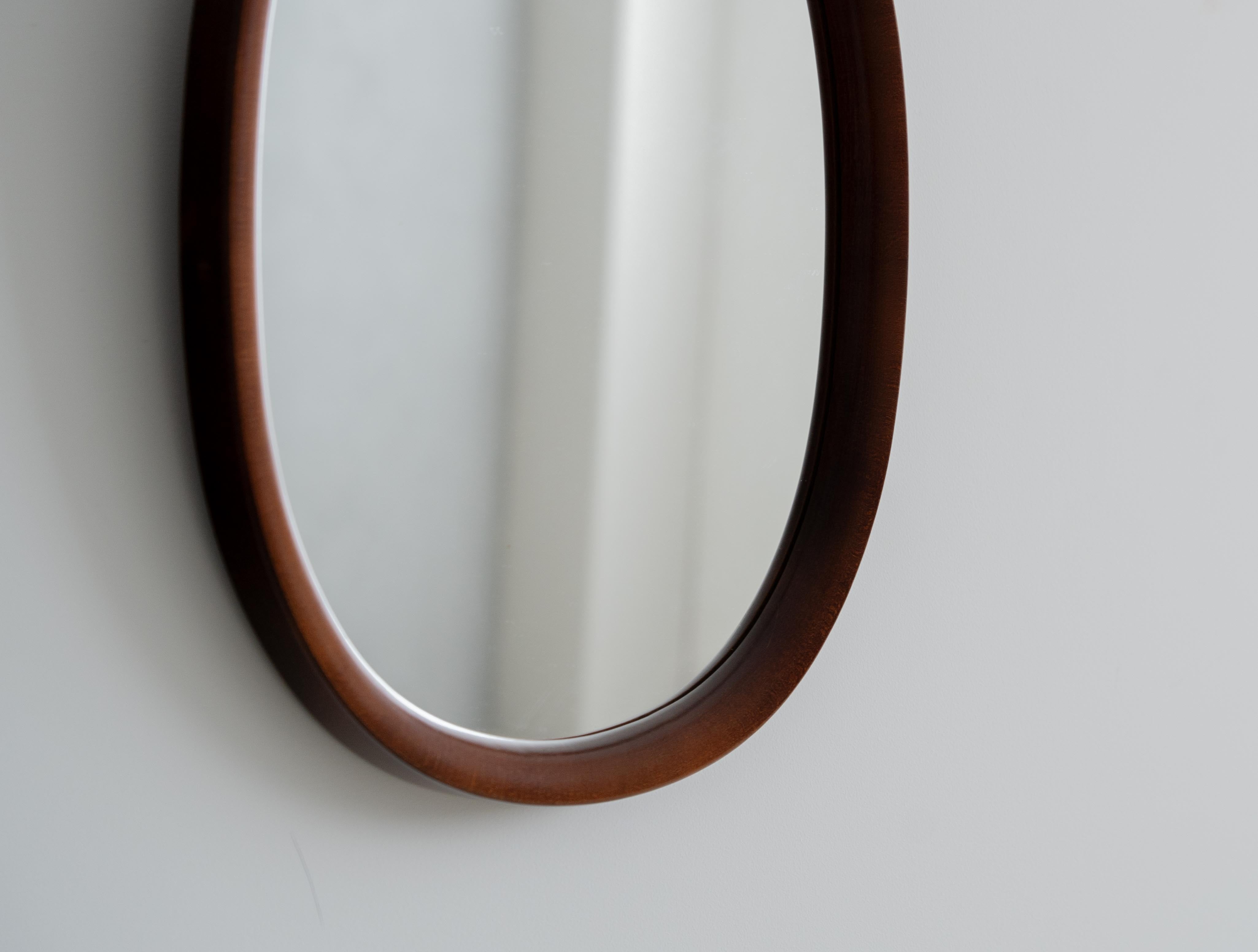 秋田木工のロングセラー、柳宗理デザインの曲木鏡。小判型、小サイズの中古品。