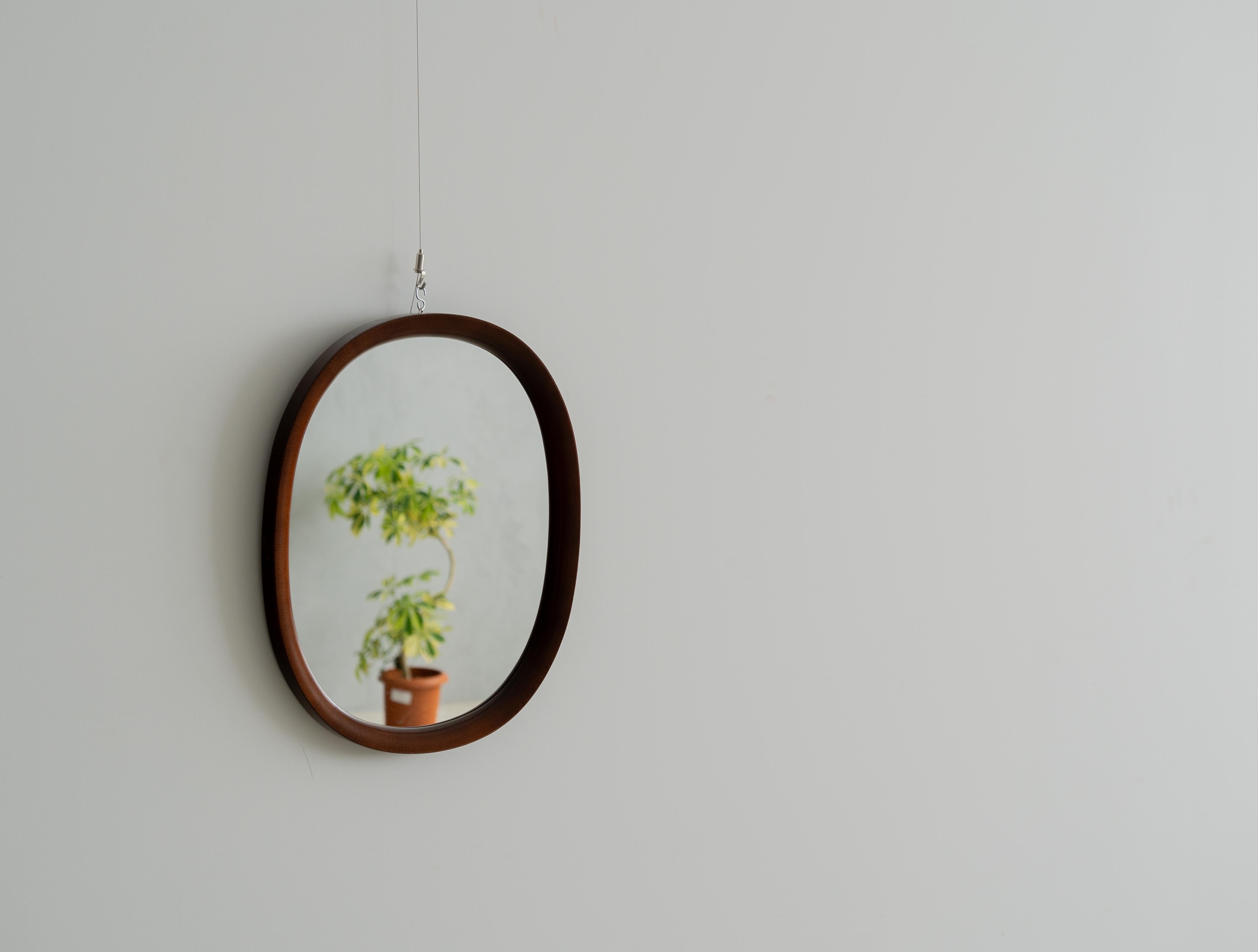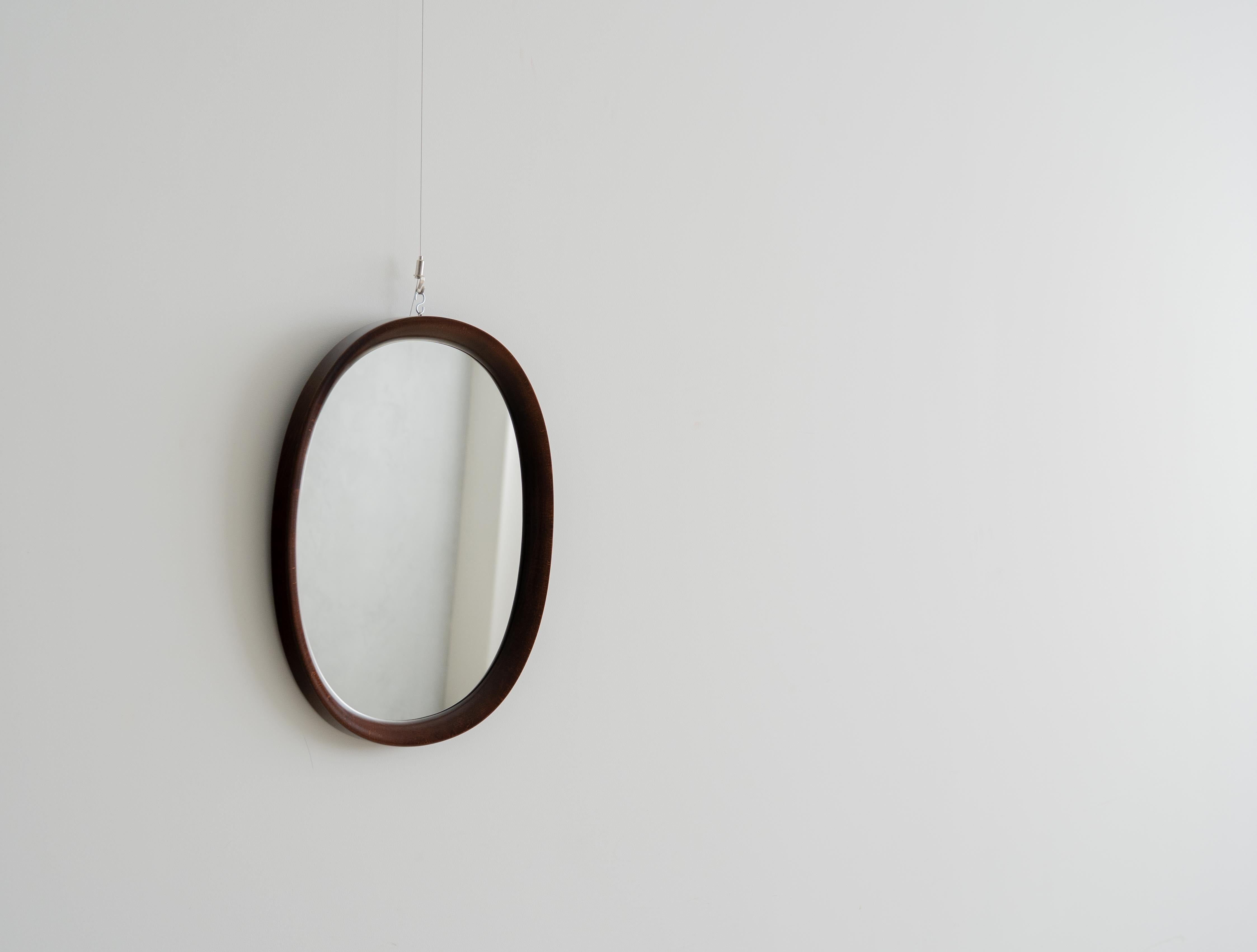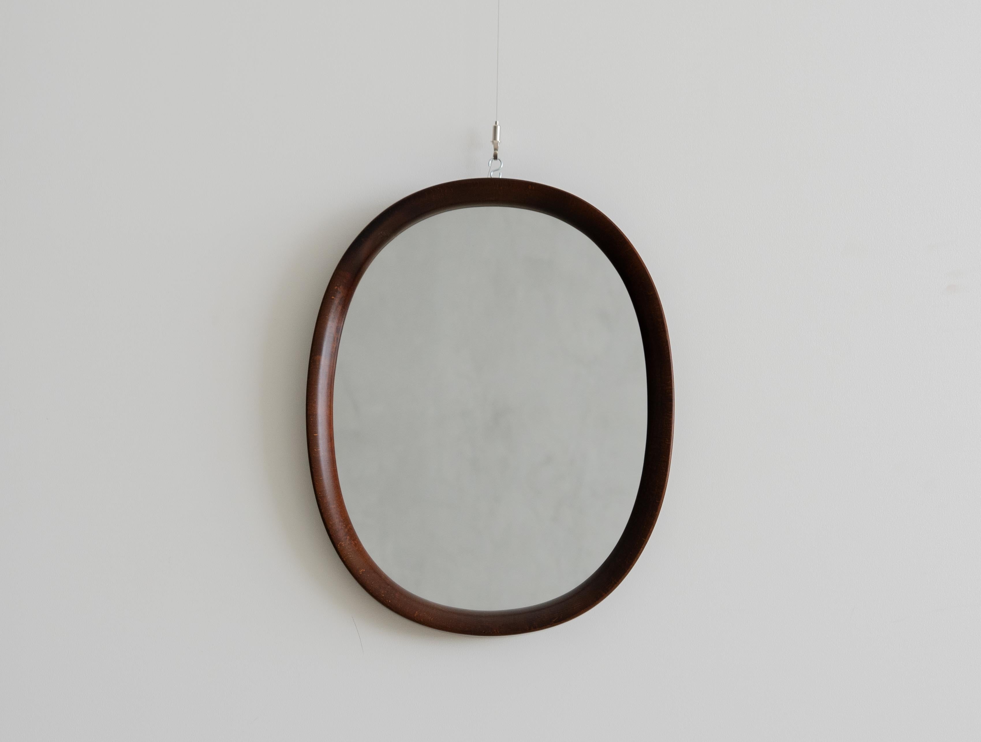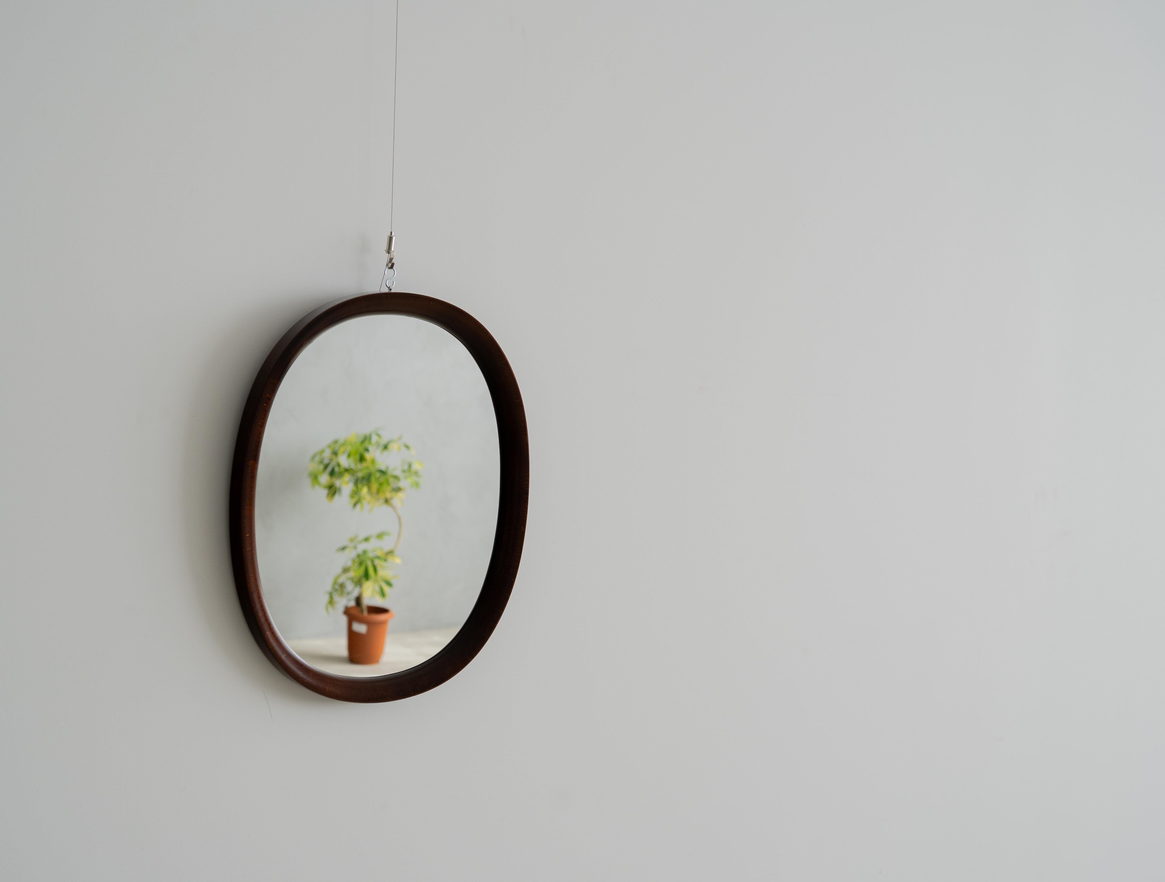 秋田木工のロングセラー、柳宗理デザインの曲木鏡。小判型、小サイズの中古品。