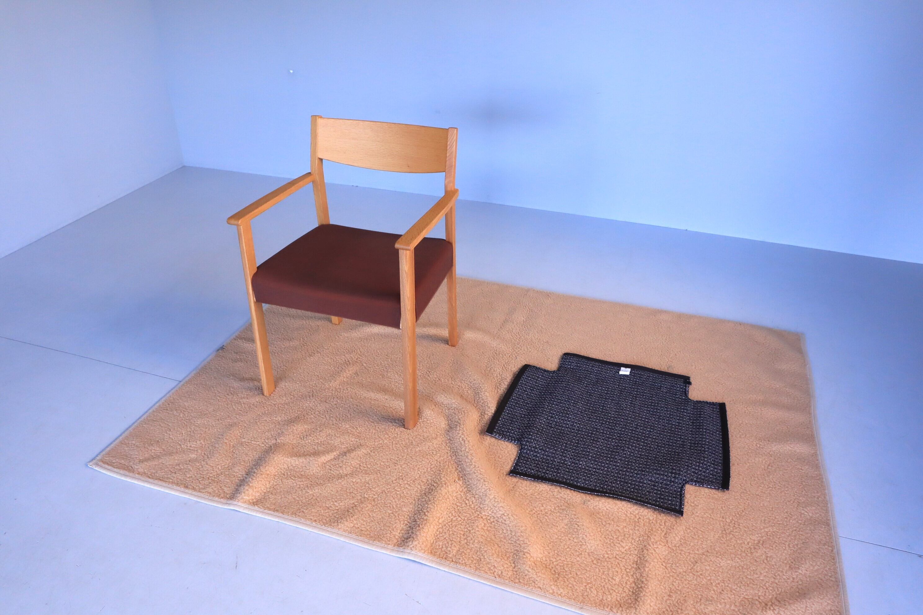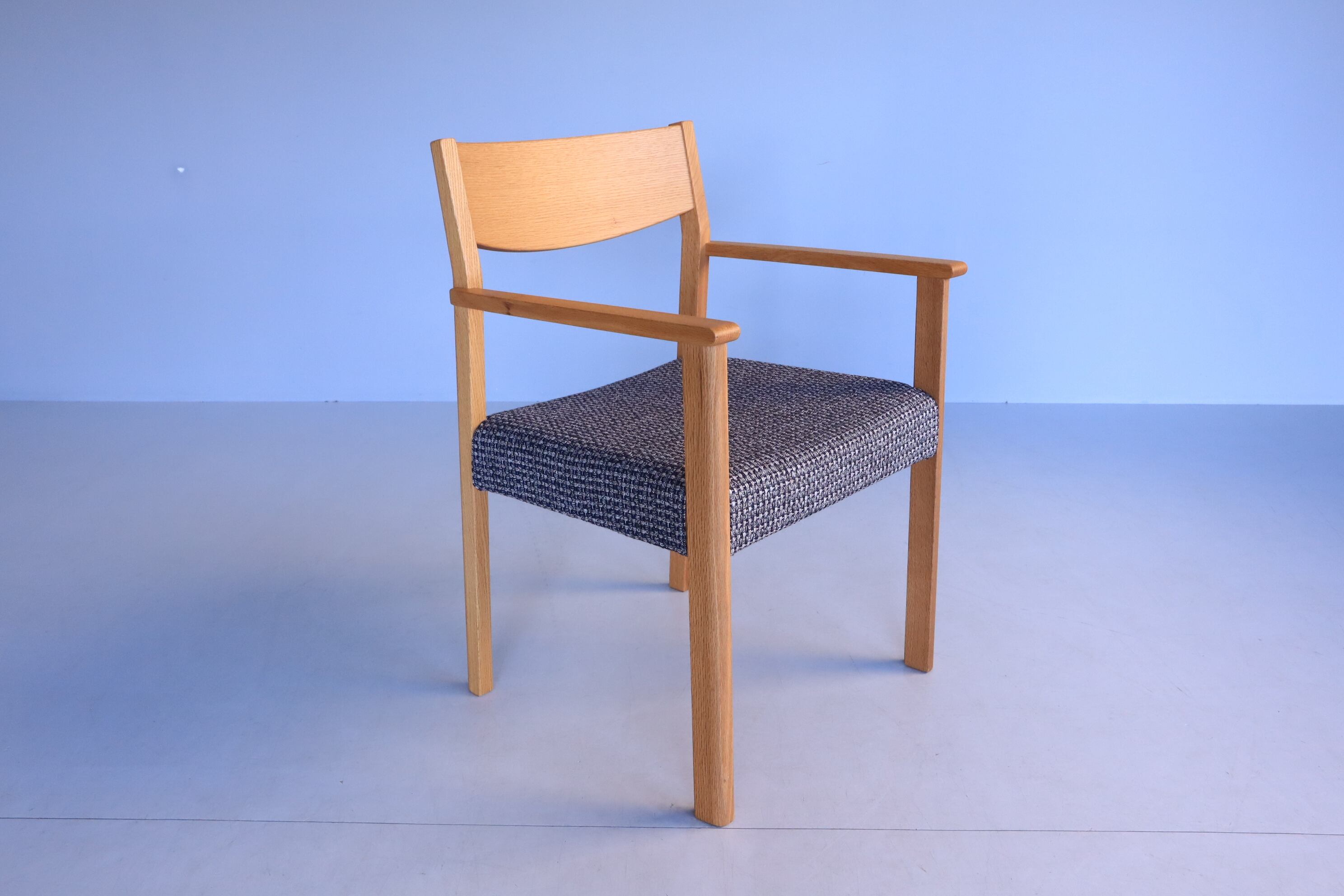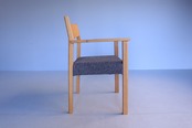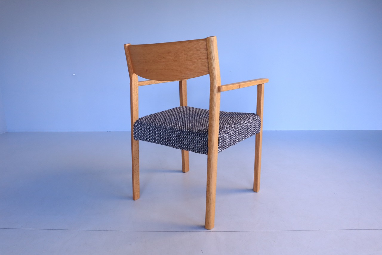 一見直線的ですが要所で緩やかなカーブを持たせてあり、ひじ掛けの位置も高すぎず低すぎず、軽やかな座り心地で立ち上がりも軽快な使える一脚です。
