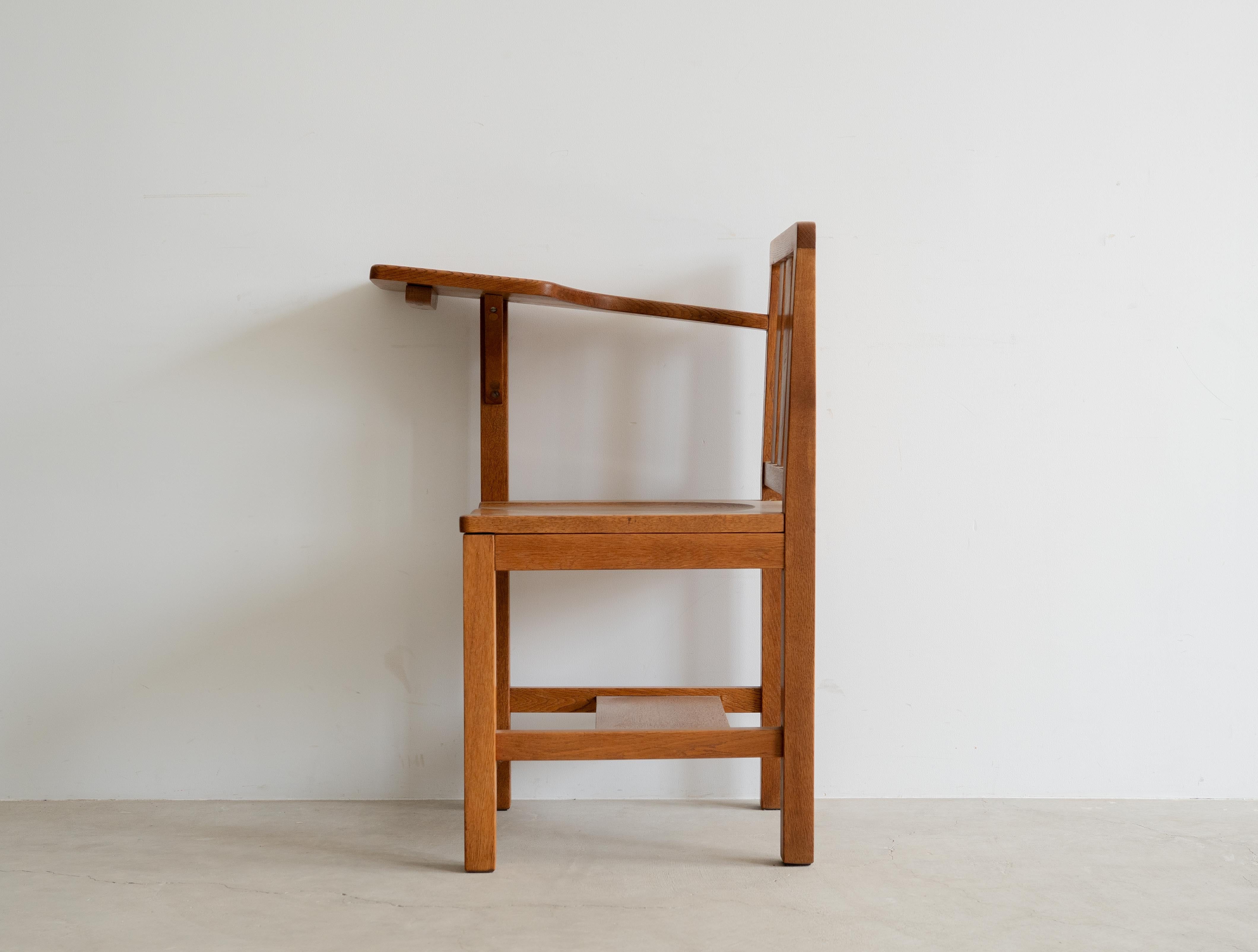 ヨーロッパのアンティークでは見られる、ひじ掛けがメモ用のサイドテーブル機能を持ったライティングチェア、珍しい国産アンティーク品になります。