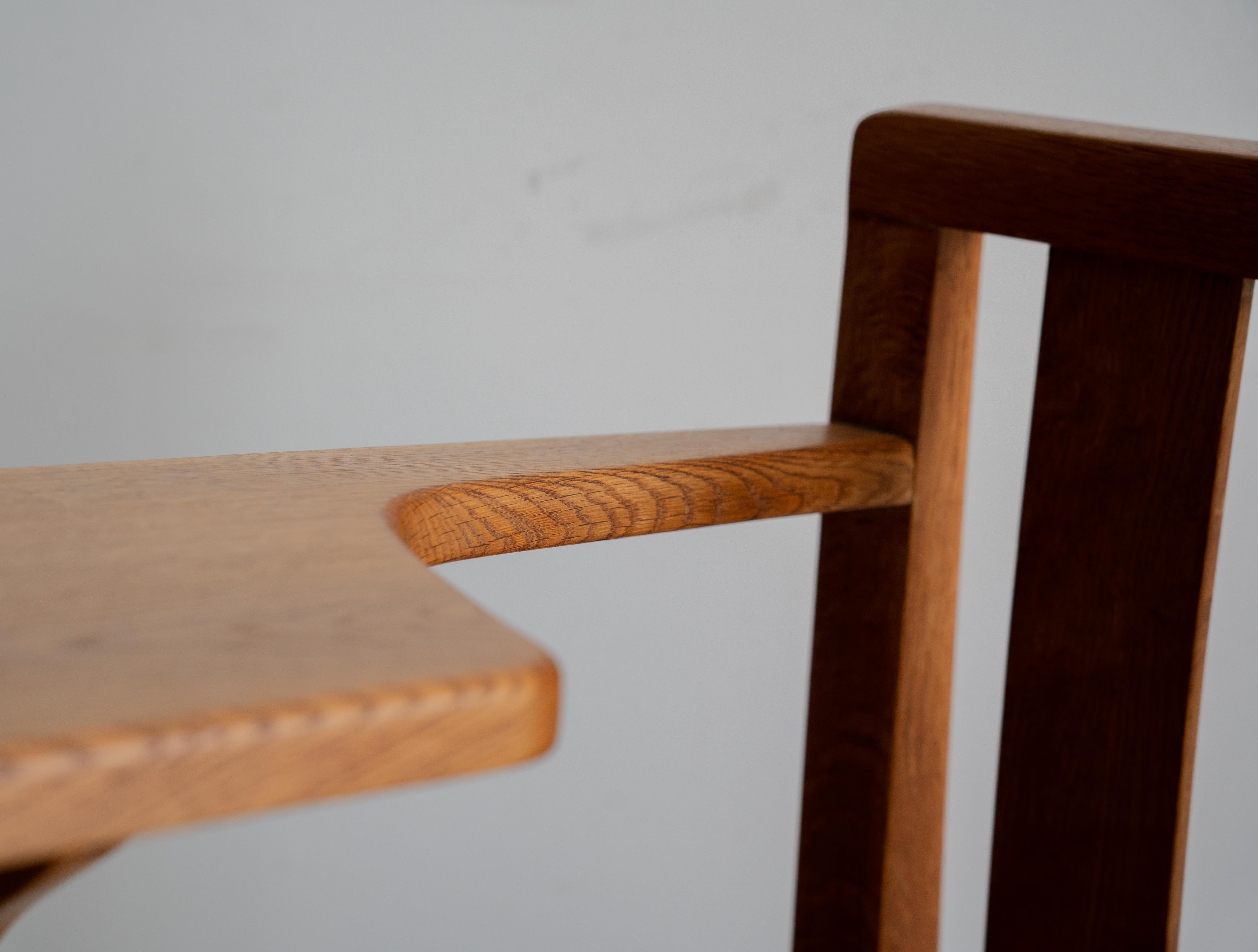 分解、全面研磨、組付け後に入念なオイルフィニッシュが完了、プリミティブな造りのオールド品ながら、現代インテリアにもすんなり溶け込むナチュラルさがあり、滑らかな手触りと座面の座ぐり加工により座り心地も上々、ワンサイドアームチェアとして、十分な実用性を持ちます。