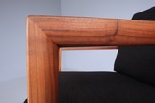比較的細身で計算されつくされたフレームワークはとりわけ後ろ姿が美しく、硬すぎず柔らかすぎない絶妙なクッションはポリエステル×アクリルファブリックのさらっとした感触とマッチし、安定感のある座り心地。