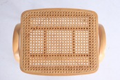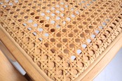 ビーチ材ナチュラル塗装で座面は籐張り、オリジナルとの違いはメーカーシールのデザインのみのようで、軽量、コンパクト故に動かしながらの使用、重ねての収納が容易、コーディネートに迷わないシンプルなデザインと併せ実用度はかなり高いです。