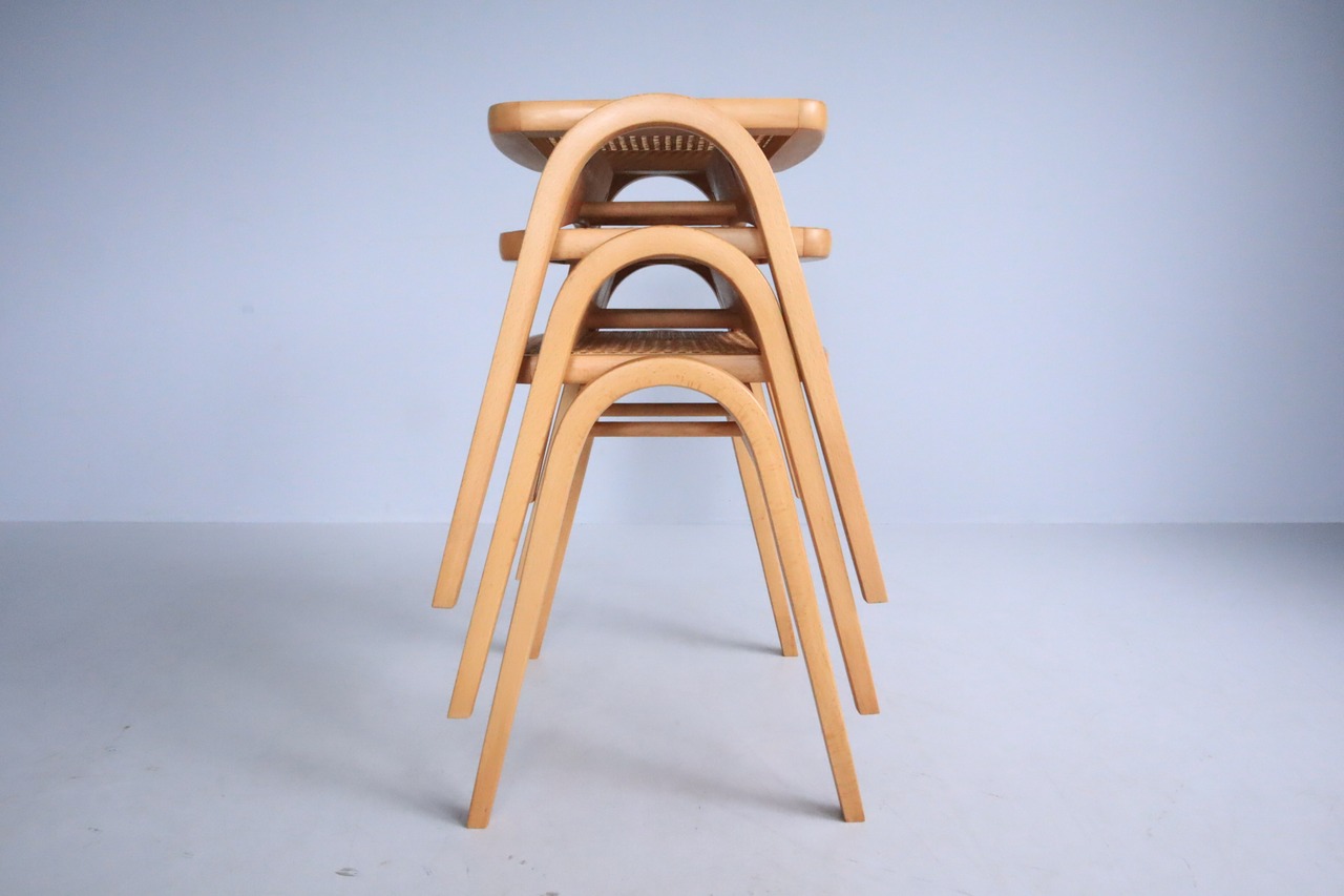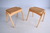 ジャパニーズモダンヴィンテージとして人気のアイテム、剣持勇デザインの秋田木工スタッキングスツールラタンバージョン、現行の復刻モデル中古品2脚セットになります。