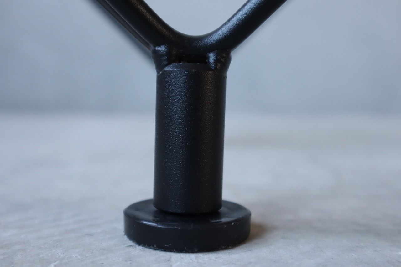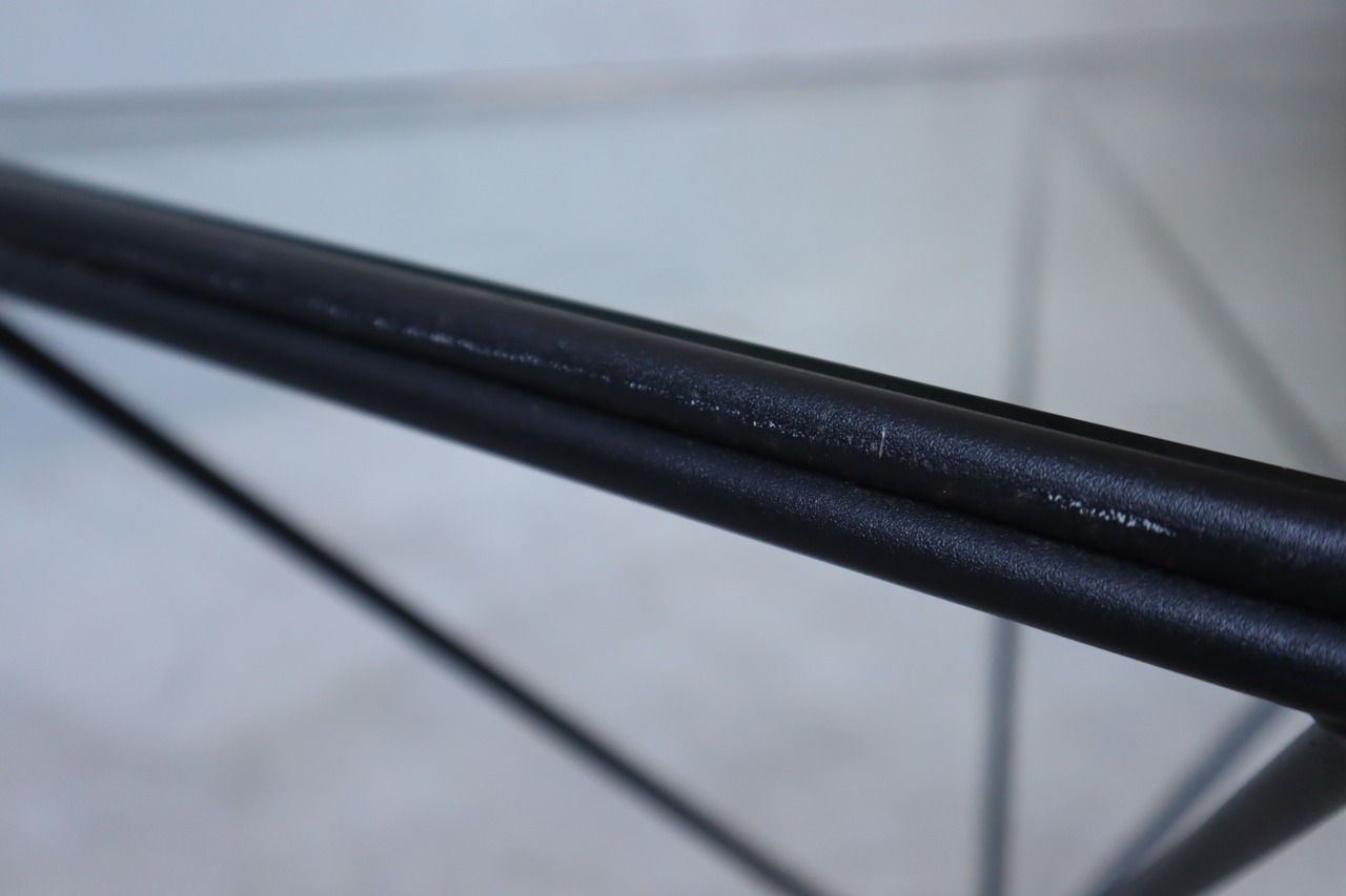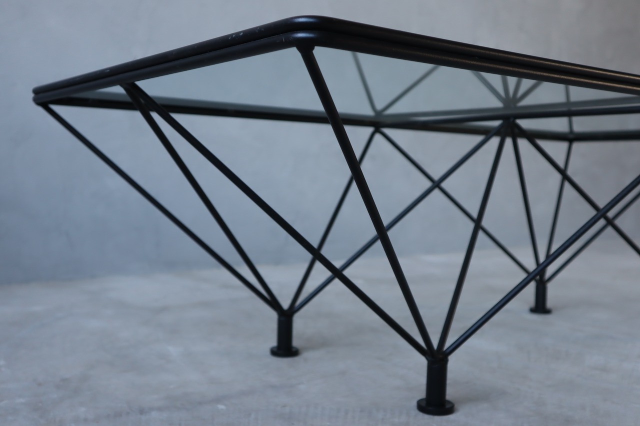 スチールだからこそ可能になるスリムなフレームに、クリアのガラストップのコンビネーションによる独特の浮遊感は、ポストモダンデザインにも通ずるシャープな印象を持ちます。
