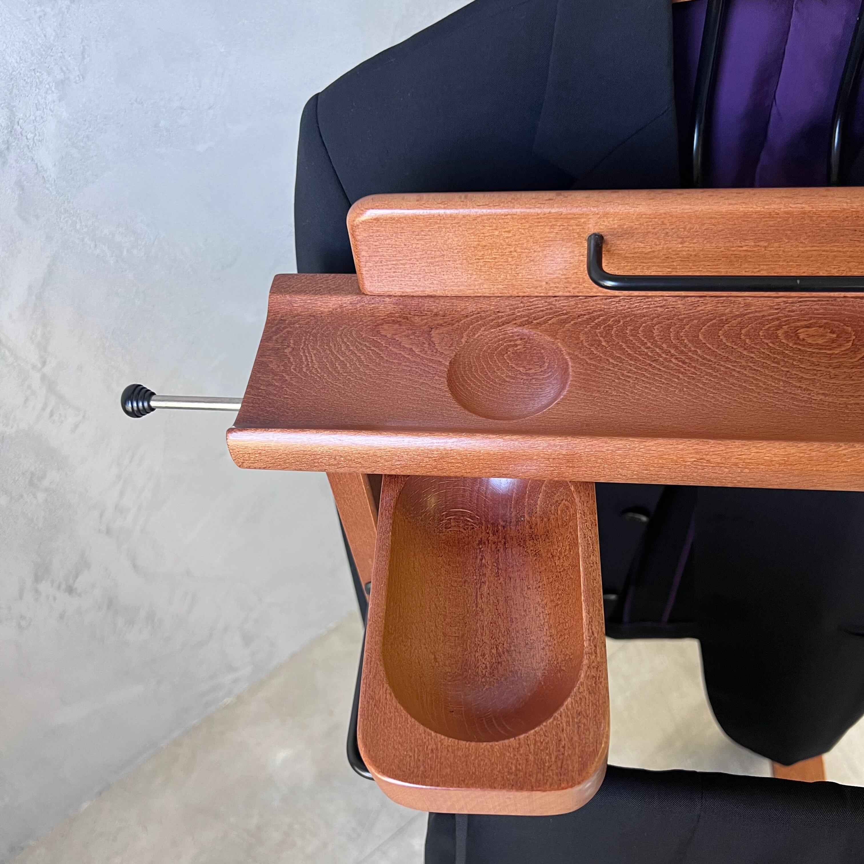 トップのくぼみと回転式の2つのトレイはカフスやブラシ等の小物用で、その両サイドにはベルト、ネクタイ用の収納式フックが付属する、省スペースにおいて非常に利便性の高いお品物になります。