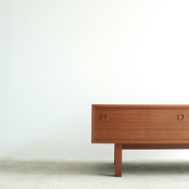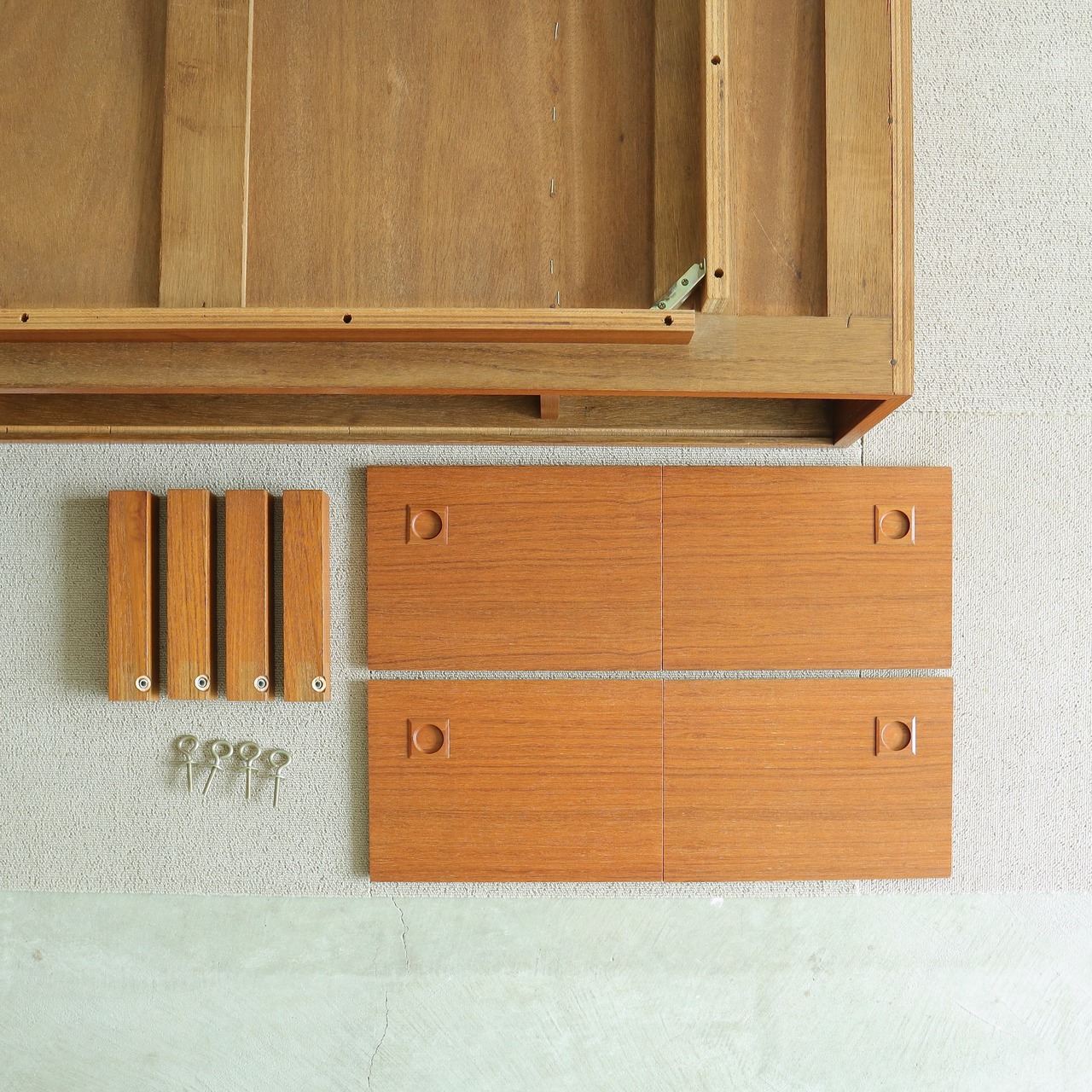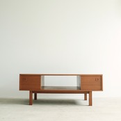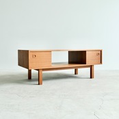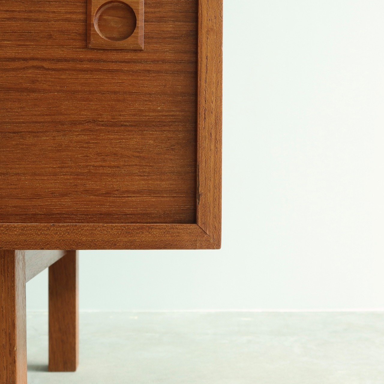 1970年代、国内でも輸入北欧家具が流行していた頃のモデルで、マテリアルはチーク材の突板仕上げ、天板と側板がきれいに45度で接合され、左右の引き戸も合わせると木目が繋がっている凝った造りです。
