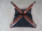 翼を広げたハヤブサに着想を得た唯一無二のデザイン、連結した4本のプライウッドフレームにキャンバス地を吊るし、背、座がつながったレザークッションを配置する構造は独特の浮遊感を生み、体勢によっては頭までカバーするミドルバックの背もたれと相まって、極上の安楽度を誇ります。