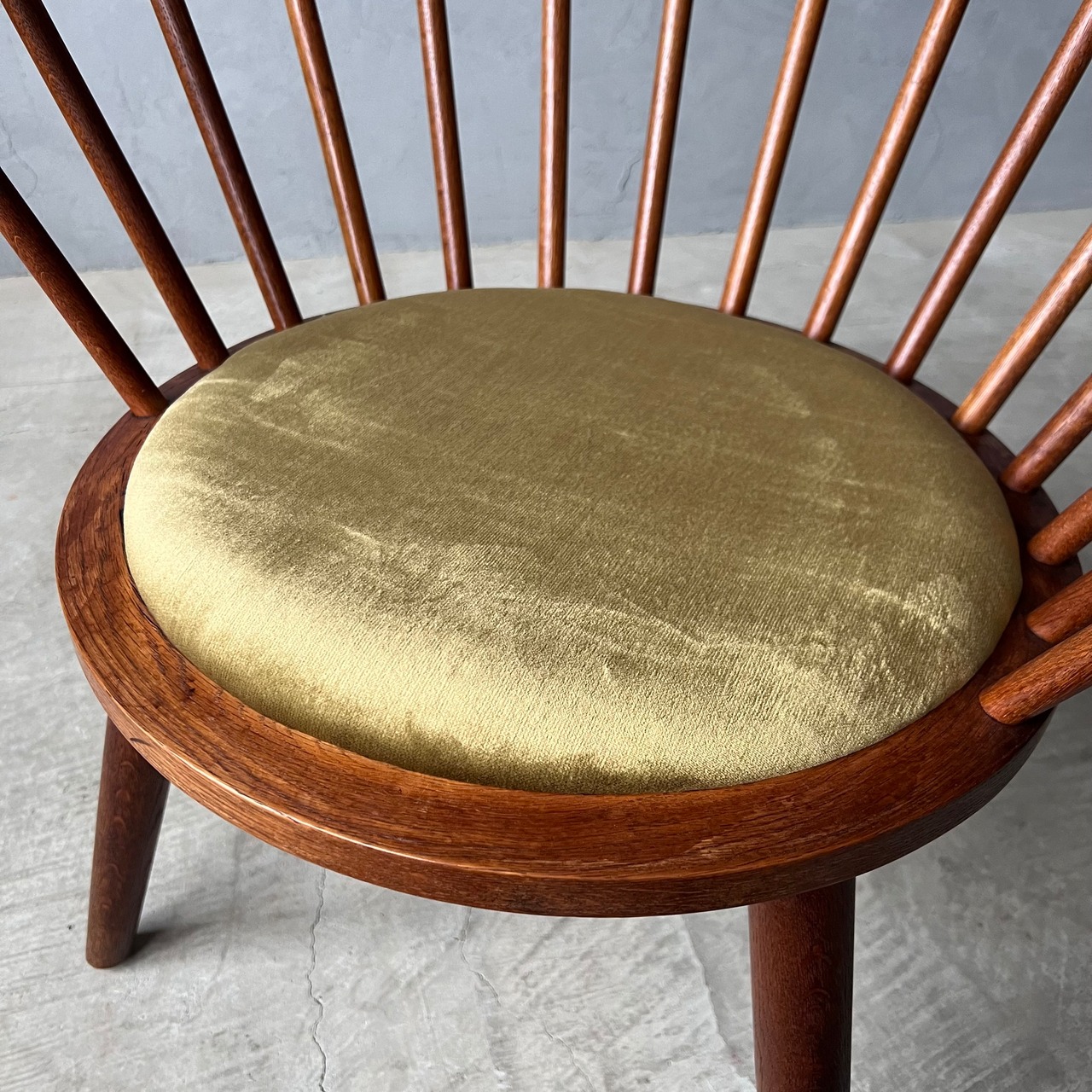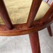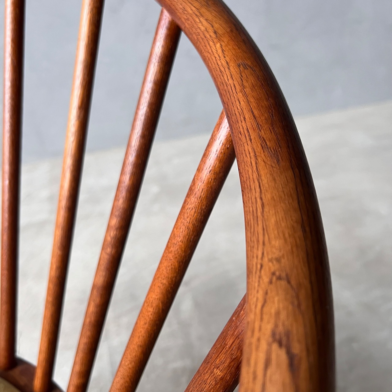 画像にある同チェアAを別途販売中になりますが、チェアAと比較してこちらのチェアBは、見えない部分の造りが丁寧、背、座、共に若干高い、トップパーツ先端のスポークからはみ出している部分が短い、という差異があり、全体的なオールド感がAの方が強いように感じられます。